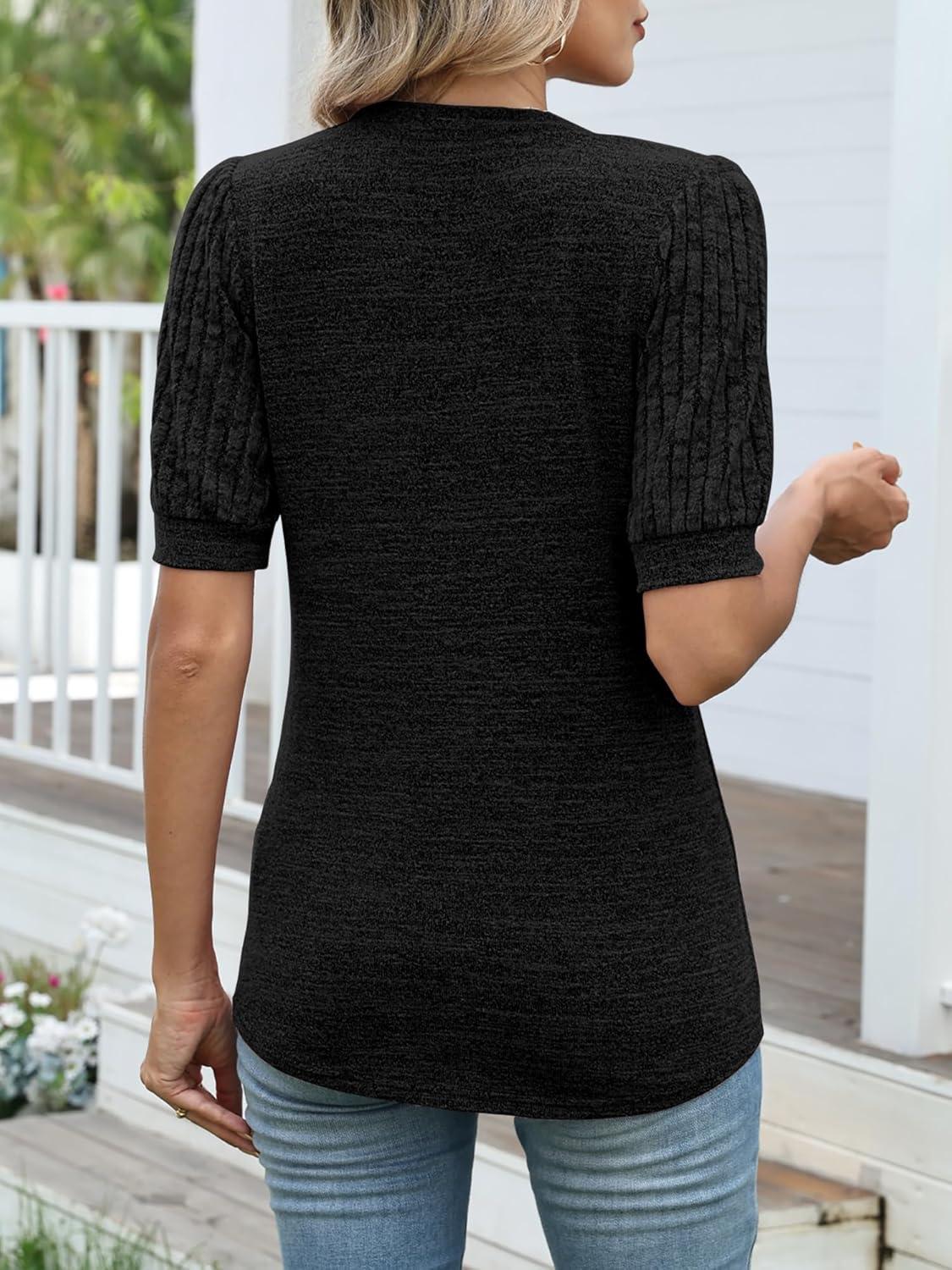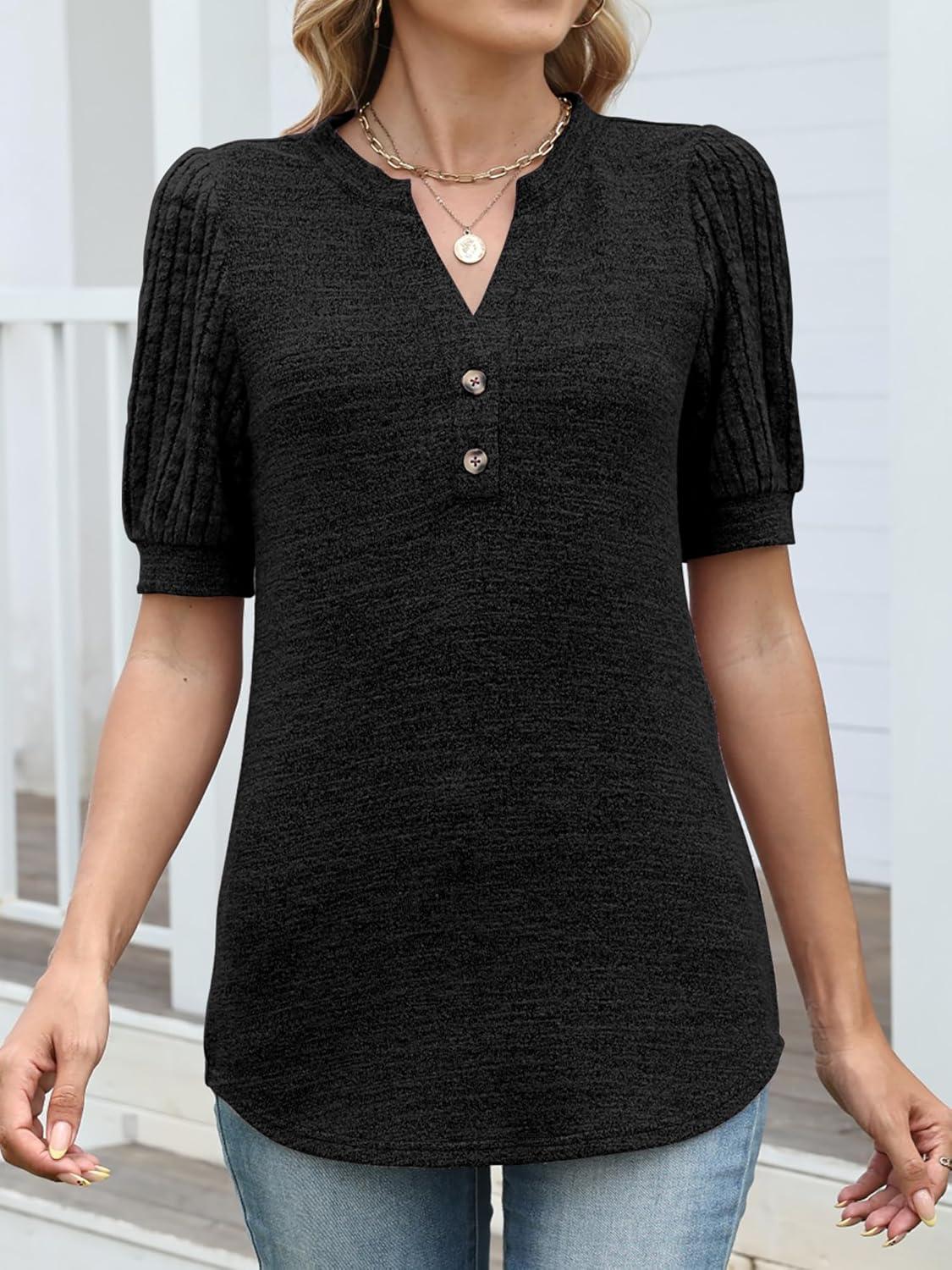 ANRABESS Women’s Tops Puff Short Sleeve Henley Shirt Dressy Casual Blouses Summer Sweater 2026 Spring Business Cute Tunics(Black)