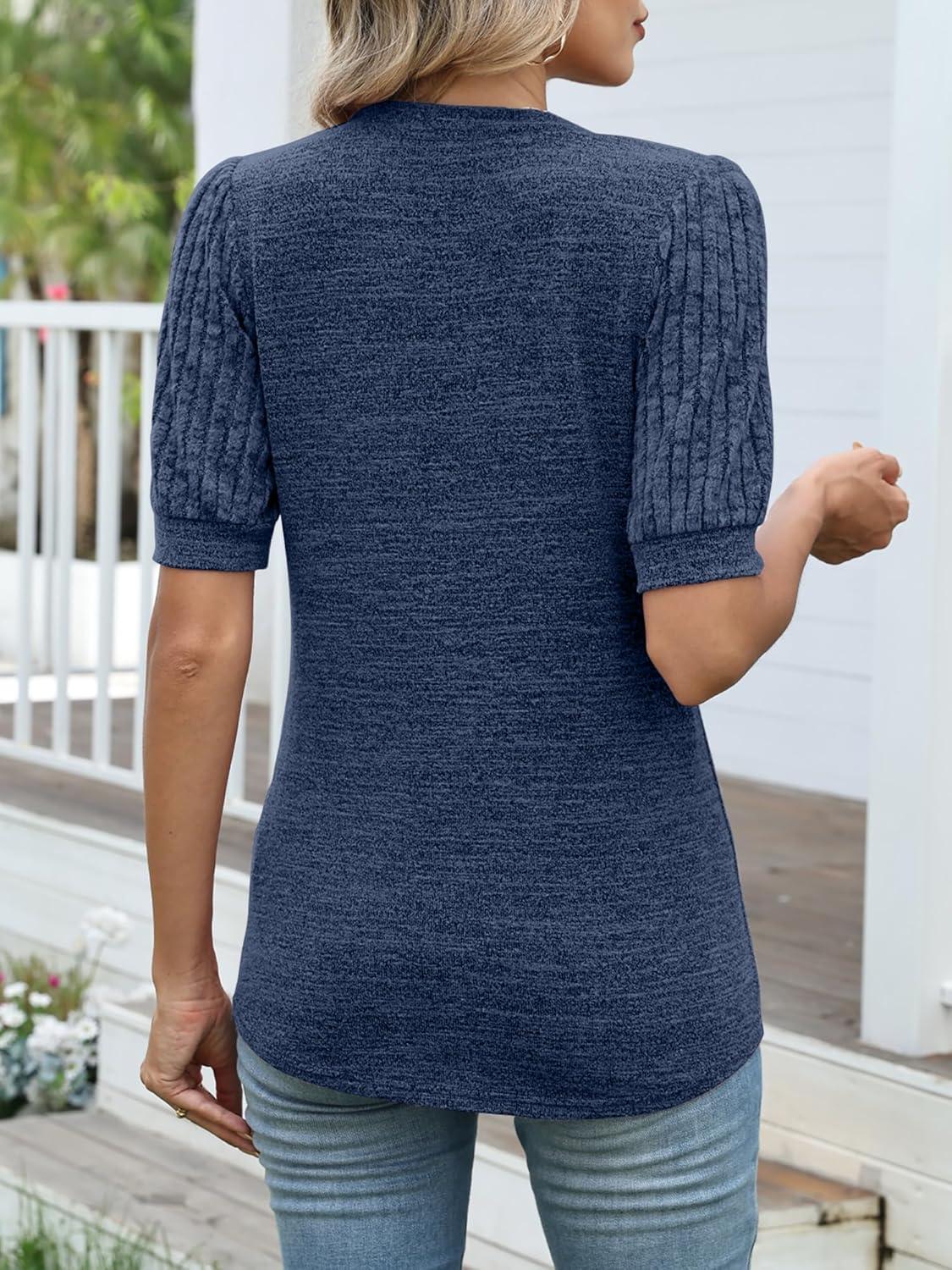 ANRABESS Women’s Tops Puff Short Sleeve Henley Shirt Dressy Casual Blouses Summer Sweater 2026 Spring Business Cute Tunics(Blue)