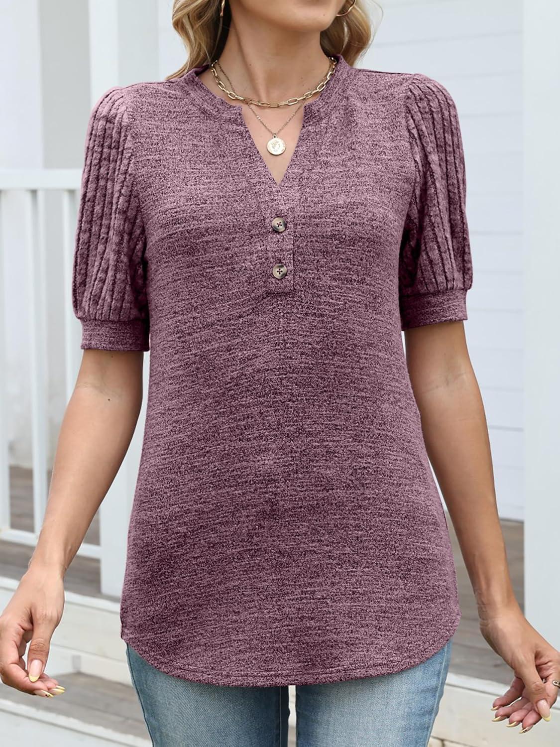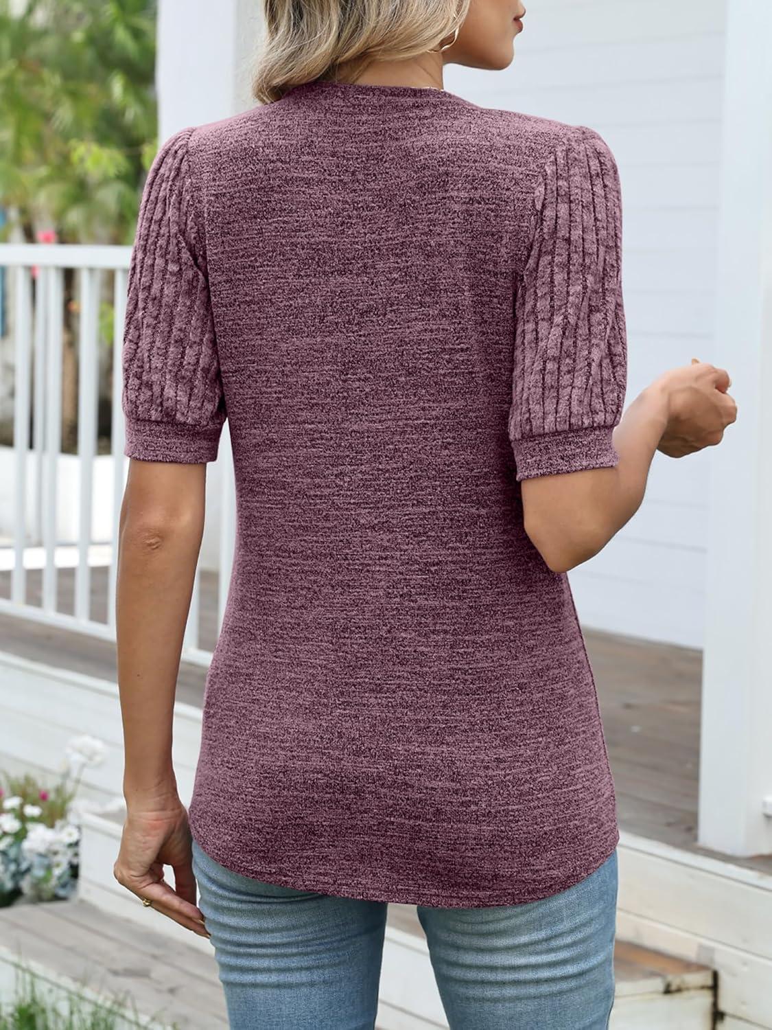 ANRABESS Women’s Tops Puff Short Sleeve Henley Shirt Dressy Casual Blouses Summer Sweater 2026 Spring Business Cute Tunics(Purple)