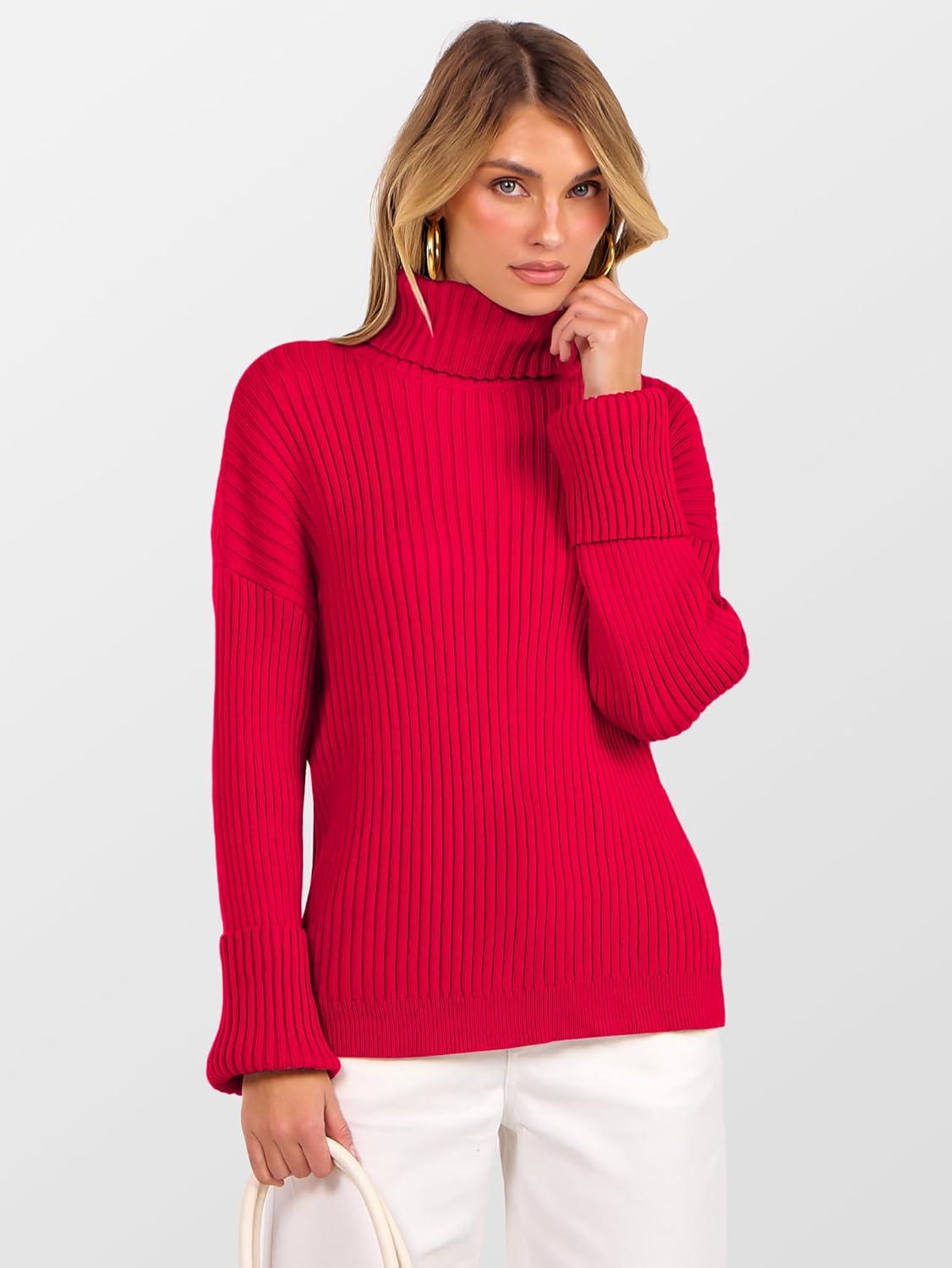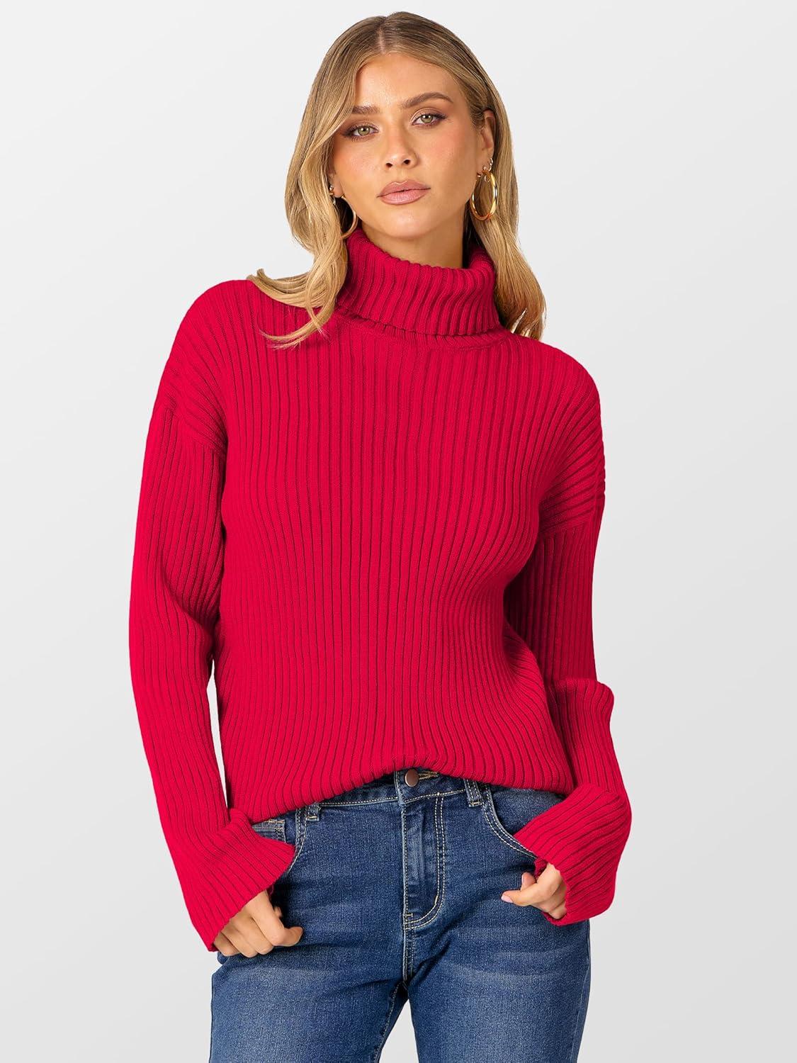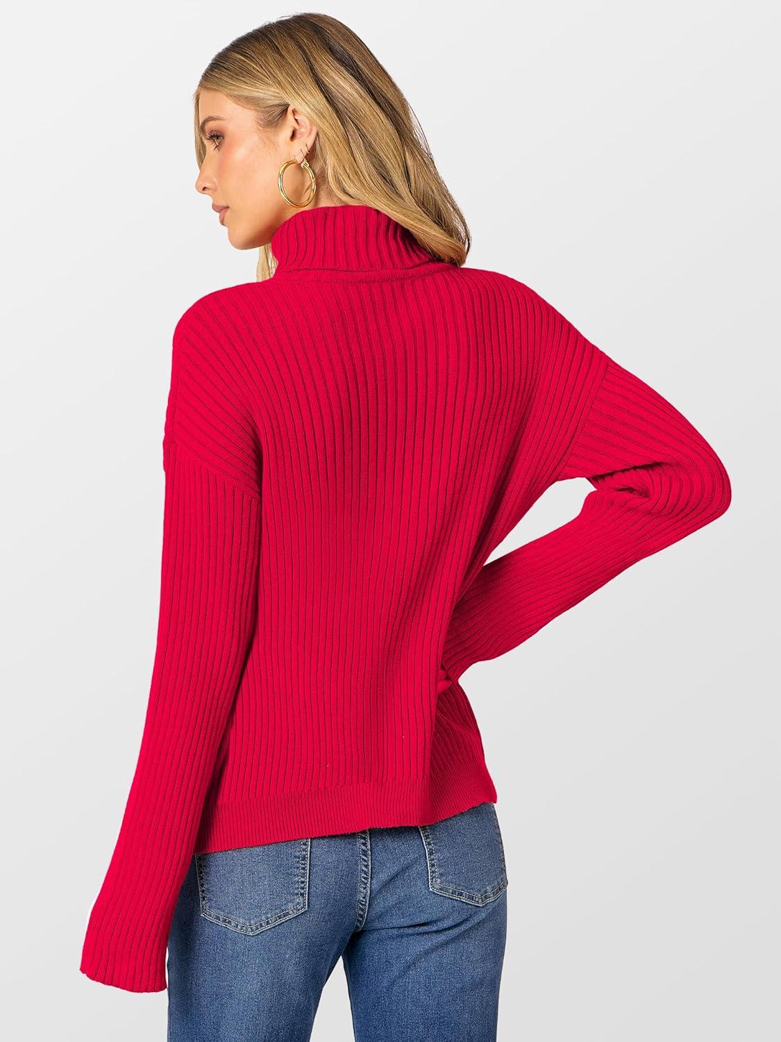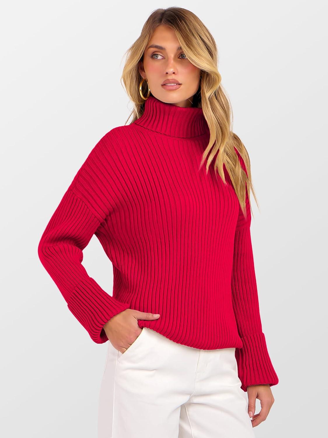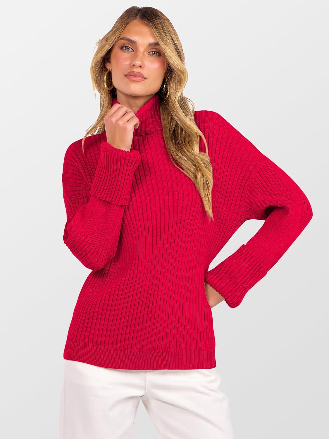 ANRABESS Womens Turtleneck Sweater 2025 Long Sleeve Ribbed Chunky Knit Fall Pullover Sweater Top(Red)
