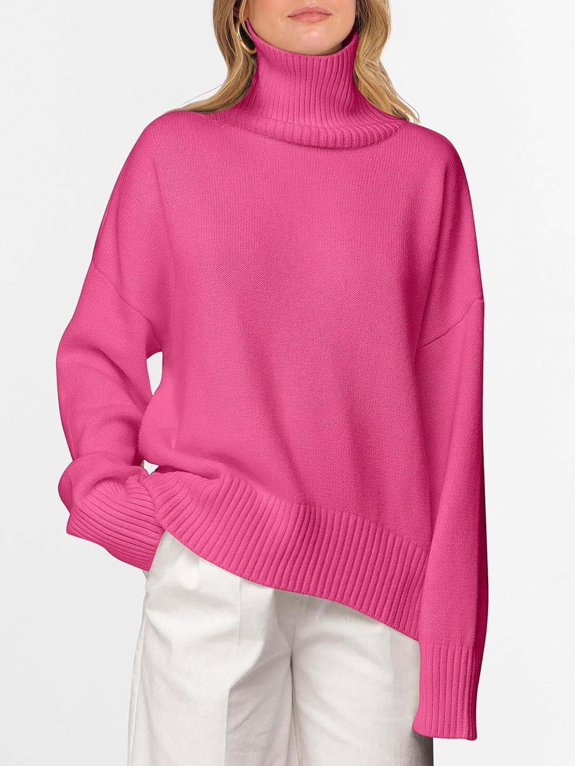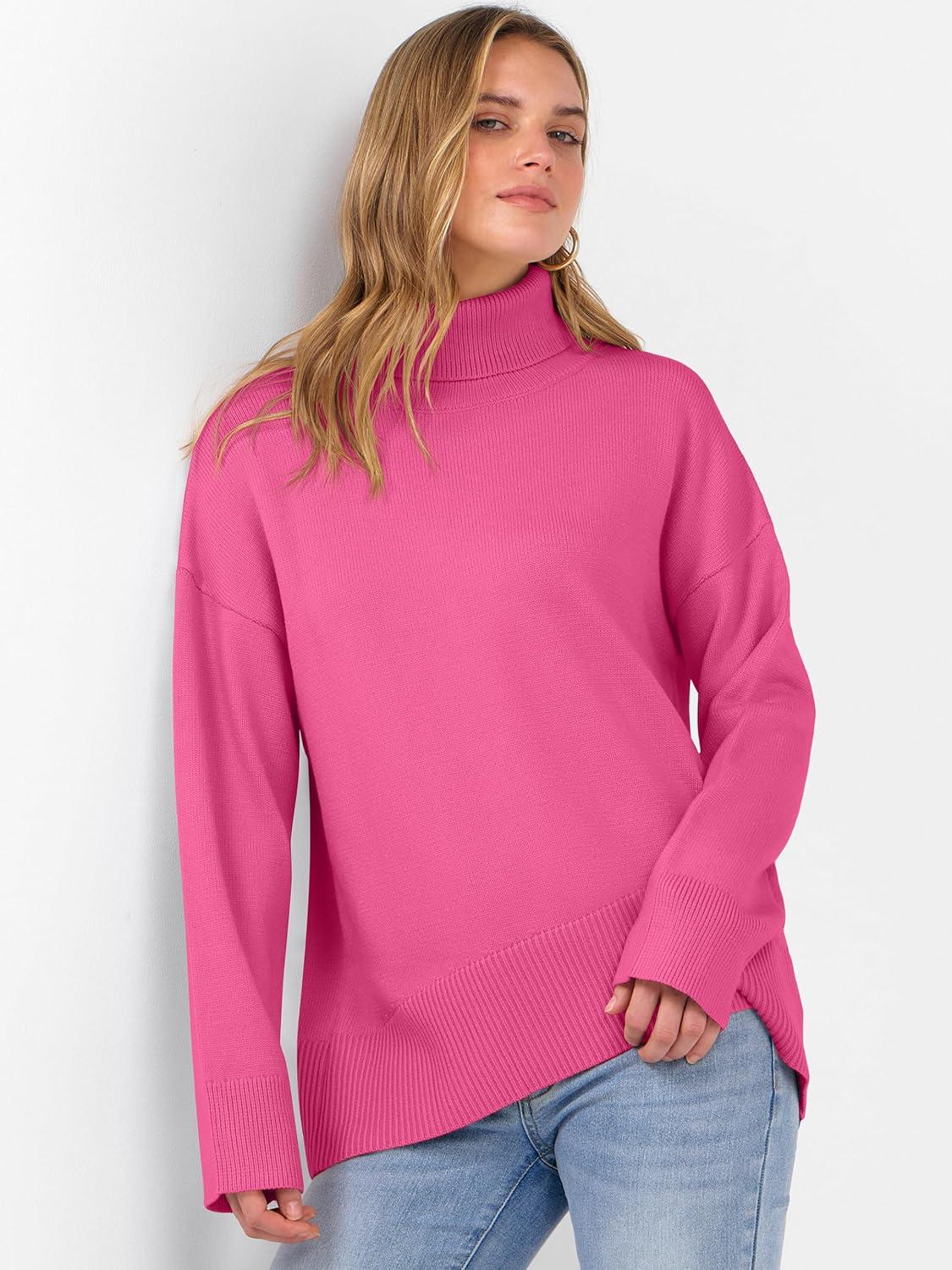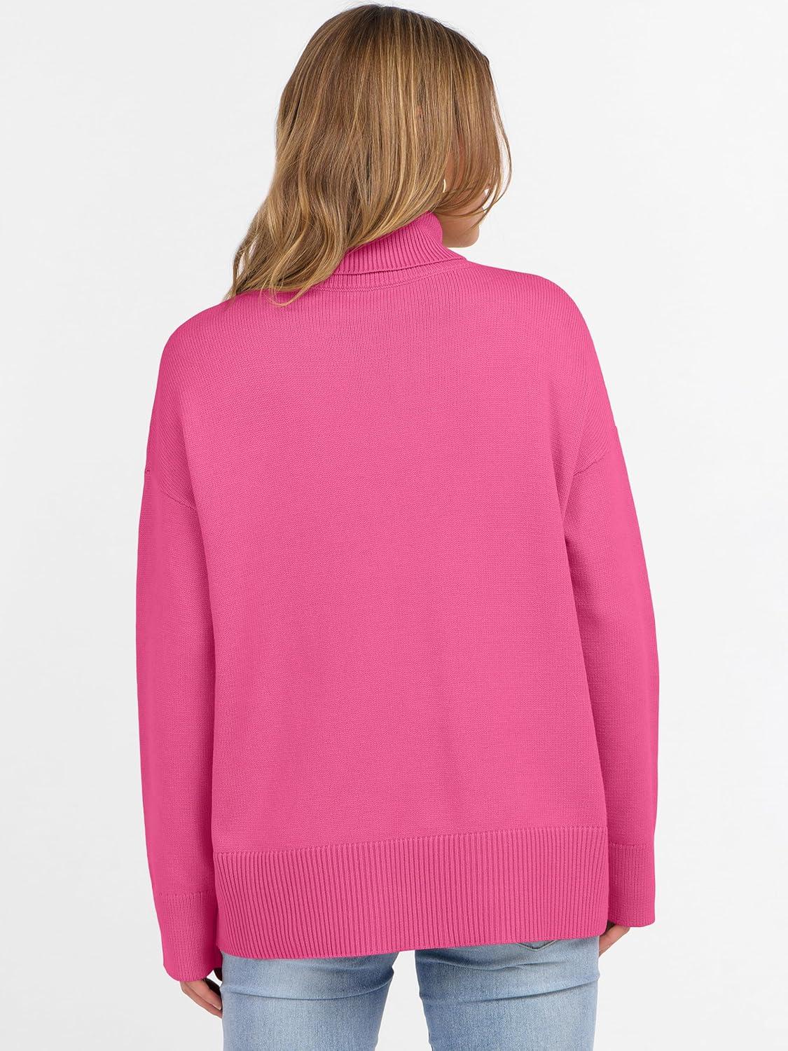 ANRABESS Womens Turtleneck Sweaters Oversized Chunky Long Sleeve Knit High Low Hem Pullover Top 2025 Fall Winter Fashion(Hot Pink)