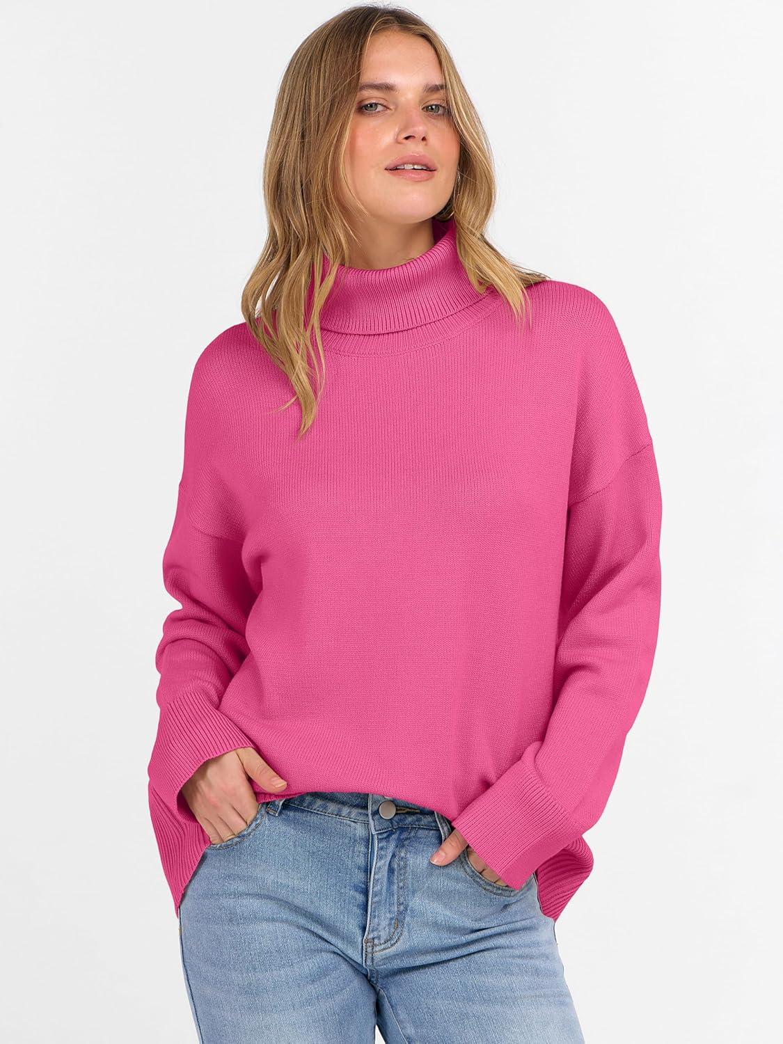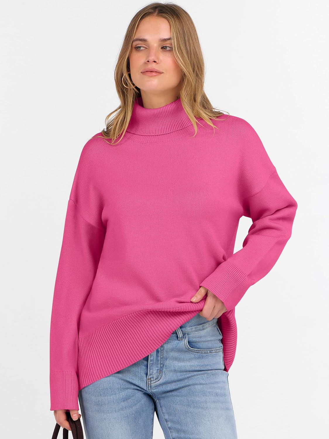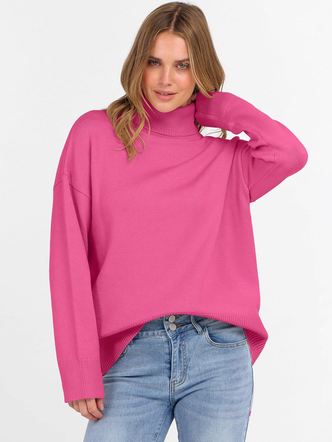 ANRABESS Womens Turtleneck Sweaters Oversized Chunky Long Sleeve Knit High Low Hem Pullover Top 2025 Fall Winter Fashion(Hot Pink)