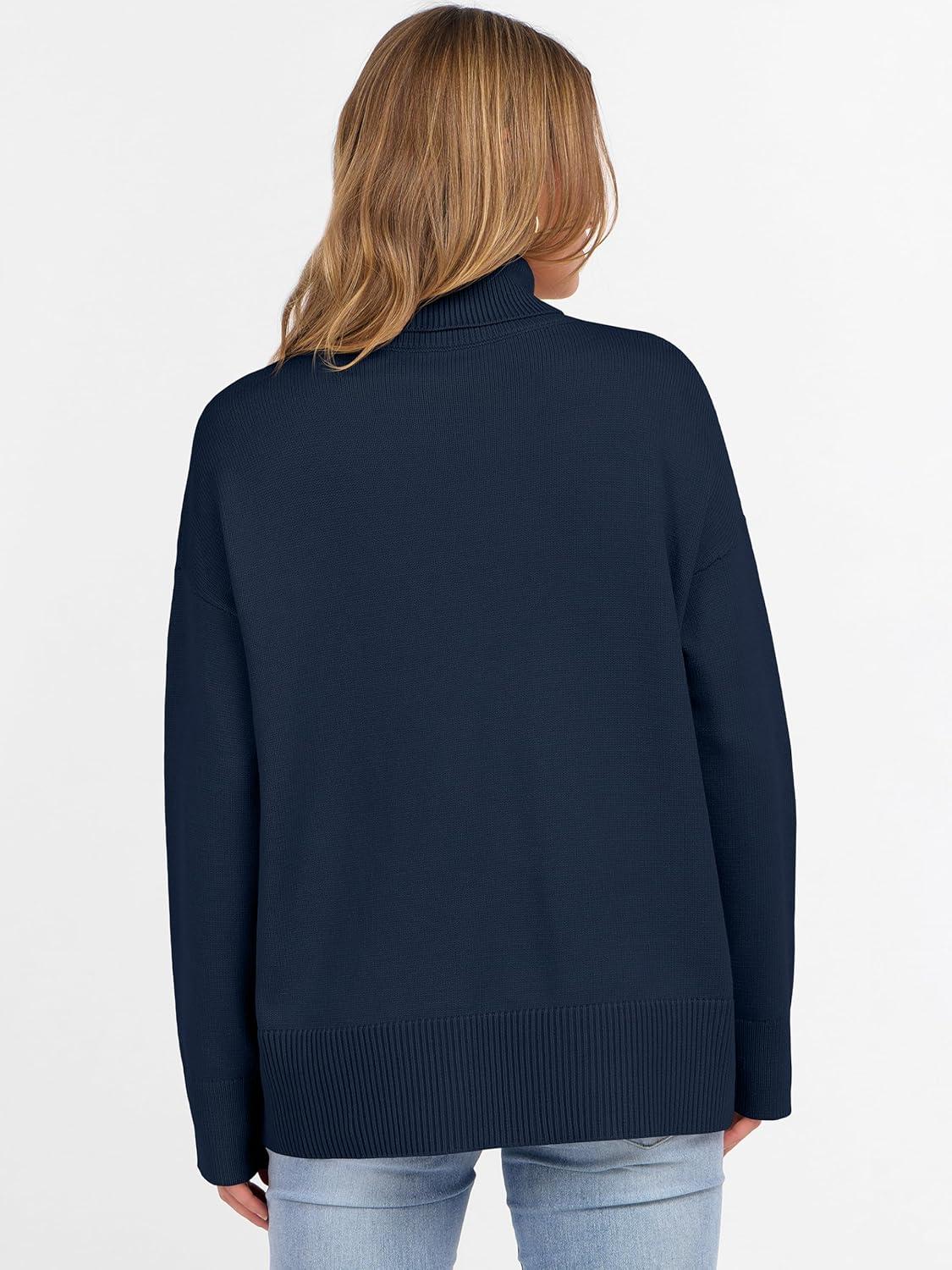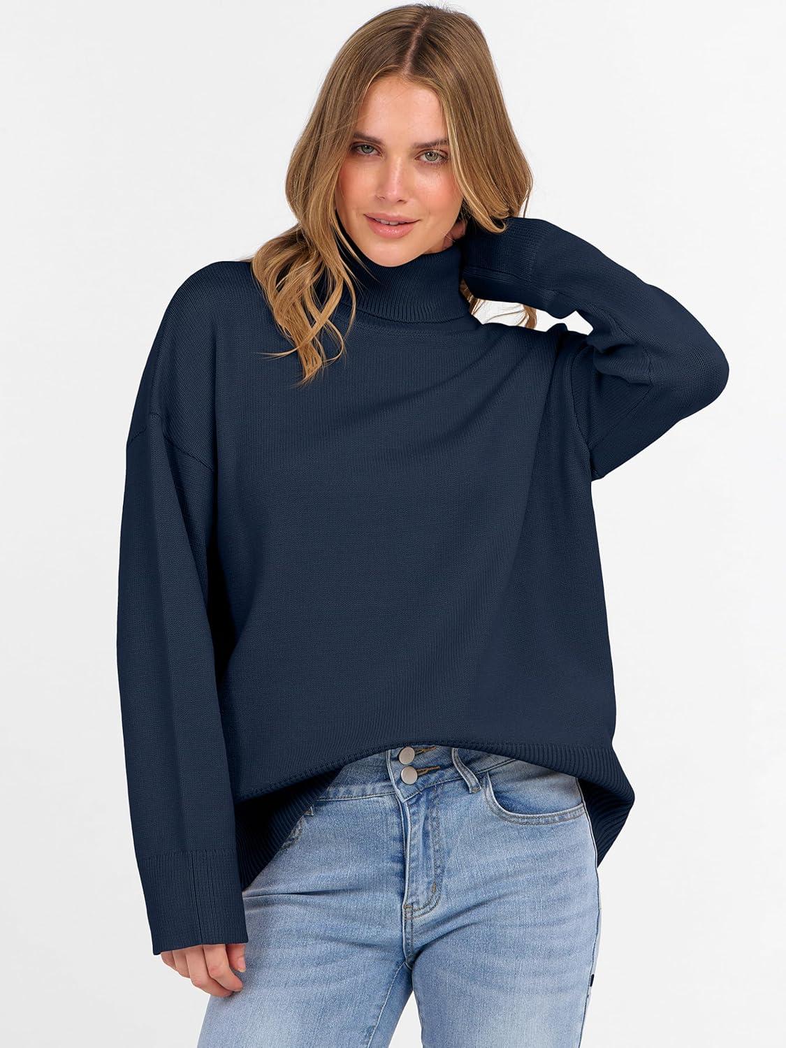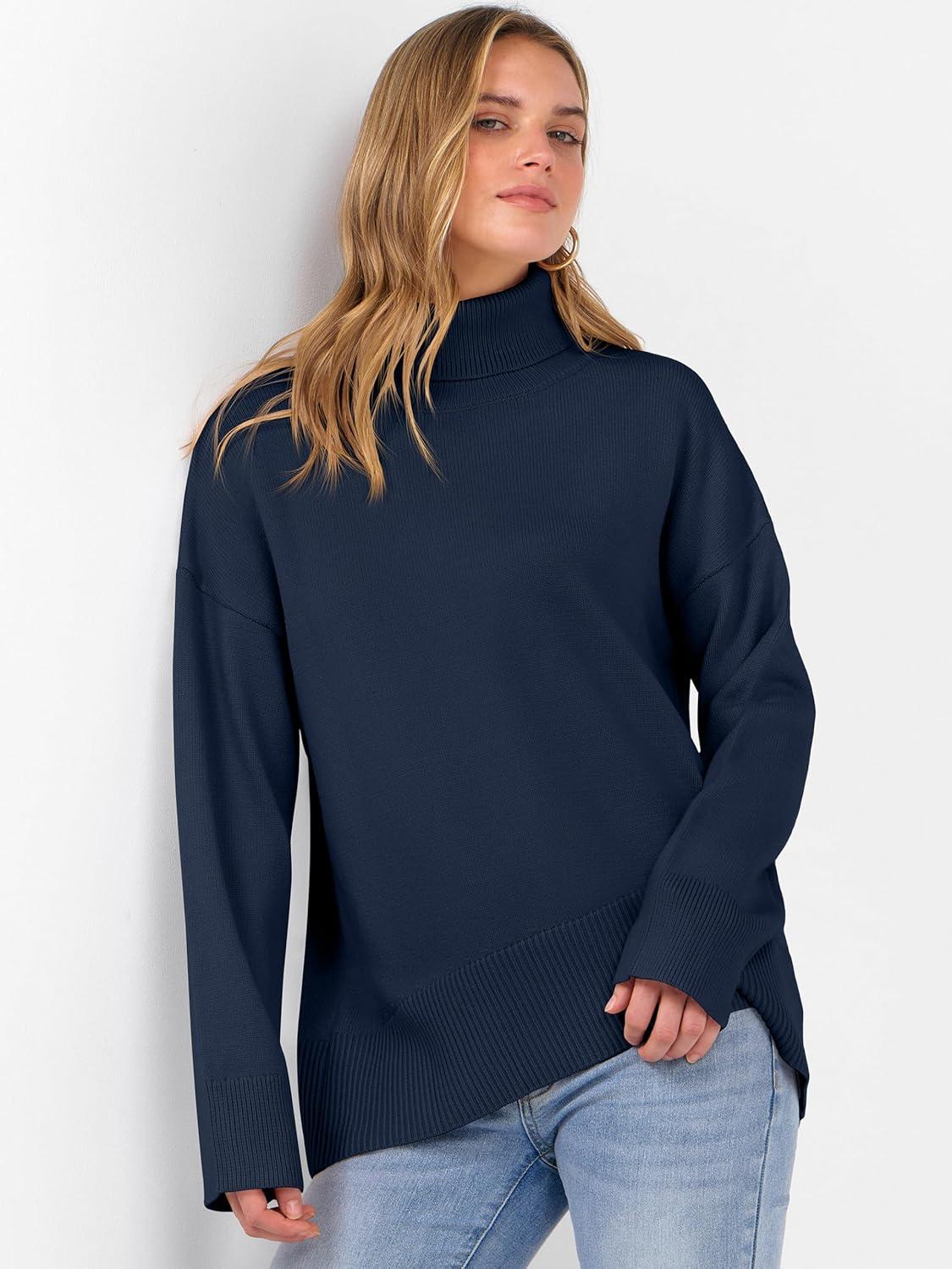ANRABESS Womens Turtleneck Sweaters Oversized Chunky Long Sleeve Knit High Low Hem Pullover Top 2025 Fall Winter Fashion(Navy Blue)
