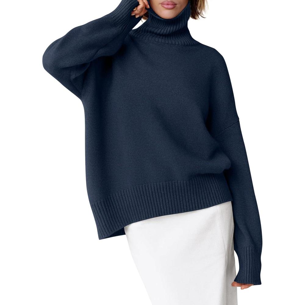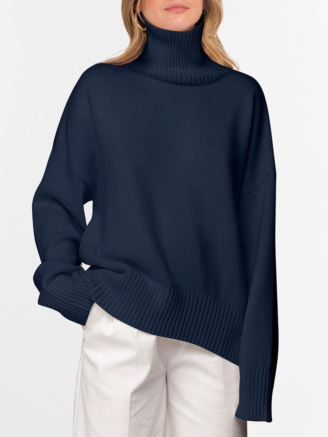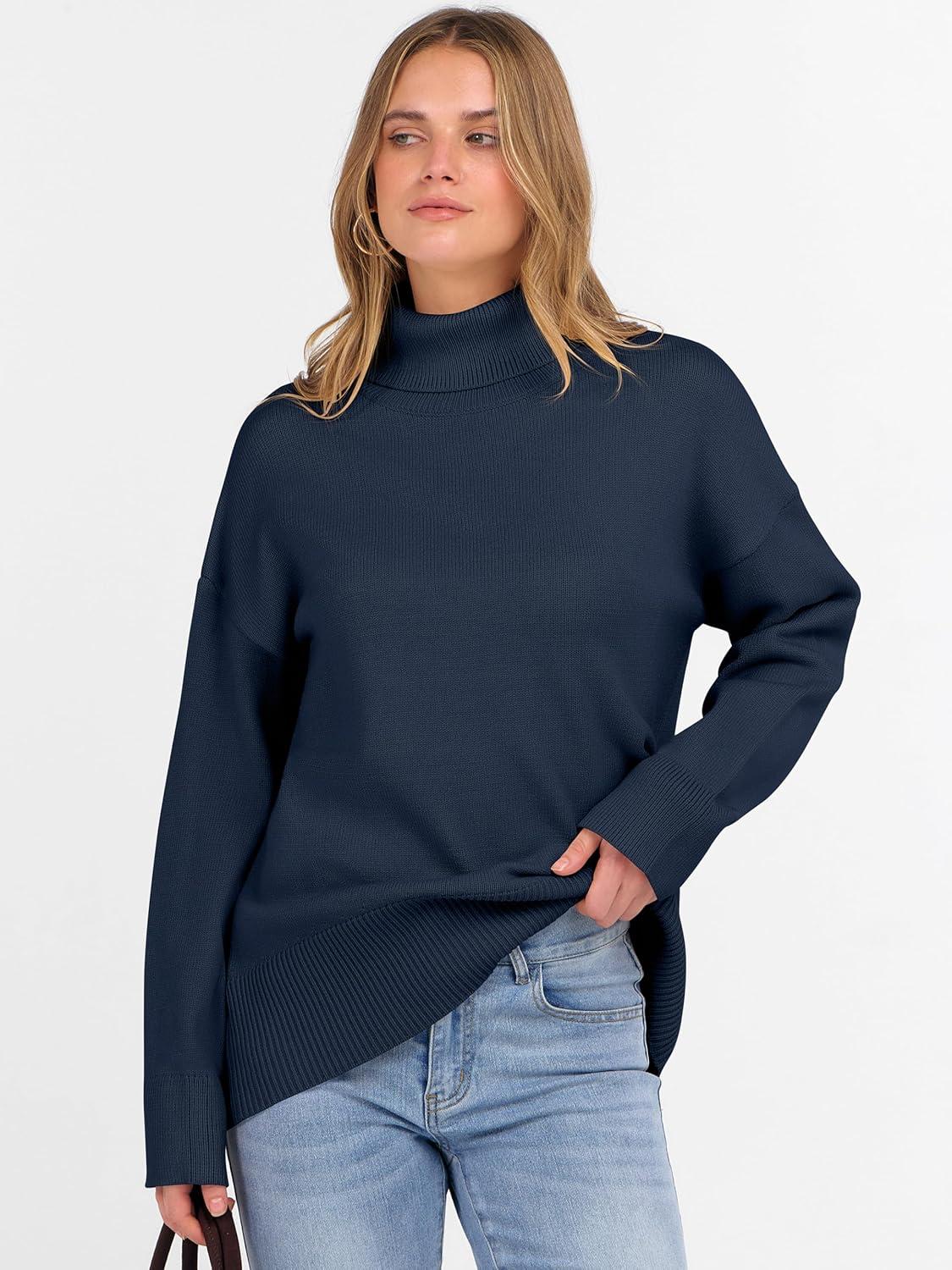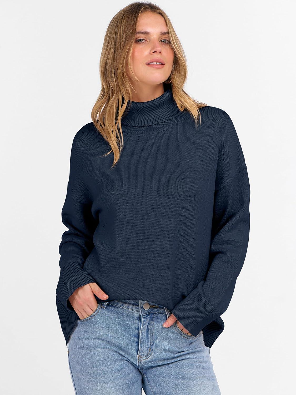 ANRABESS Womens Turtleneck Sweaters Oversized Chunky Long Sleeve Knit High Low Hem Pullover Top 2025 Fall Winter Fashion(Navy Blue)