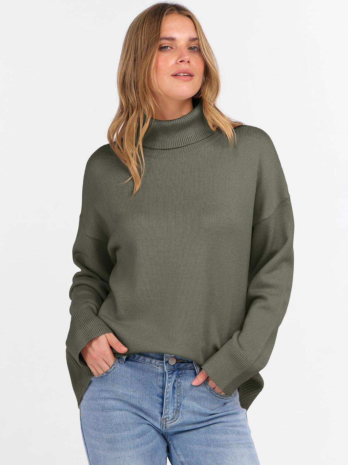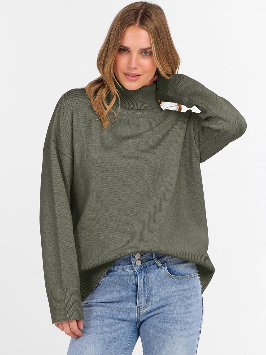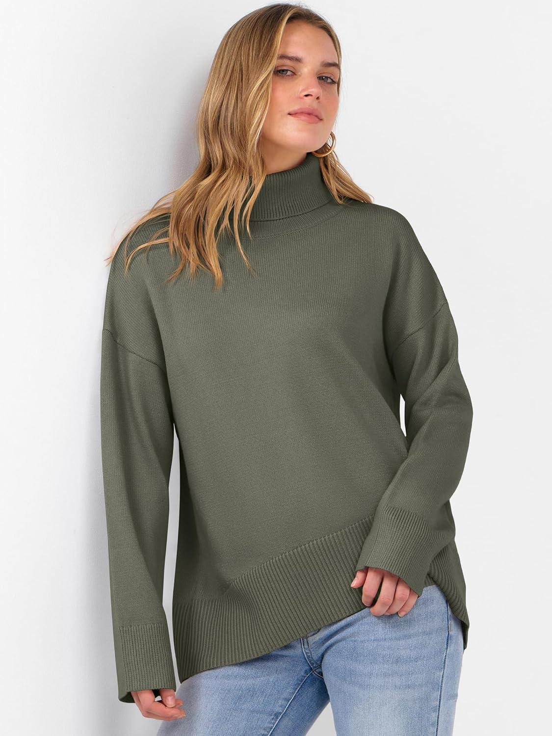 ANRABESS Womens Turtleneck Sweaters Oversized Chunky Long Sleeve Knit High Low Hem Pullover Top 2025 Fall Winter Fashion(Olive Green)