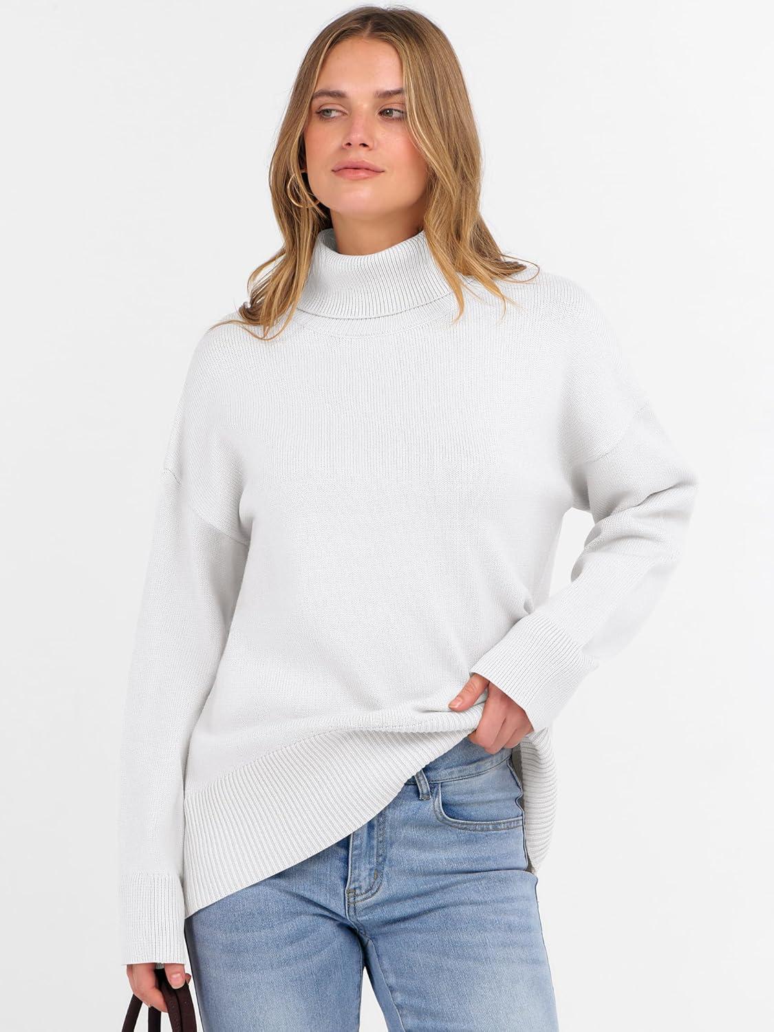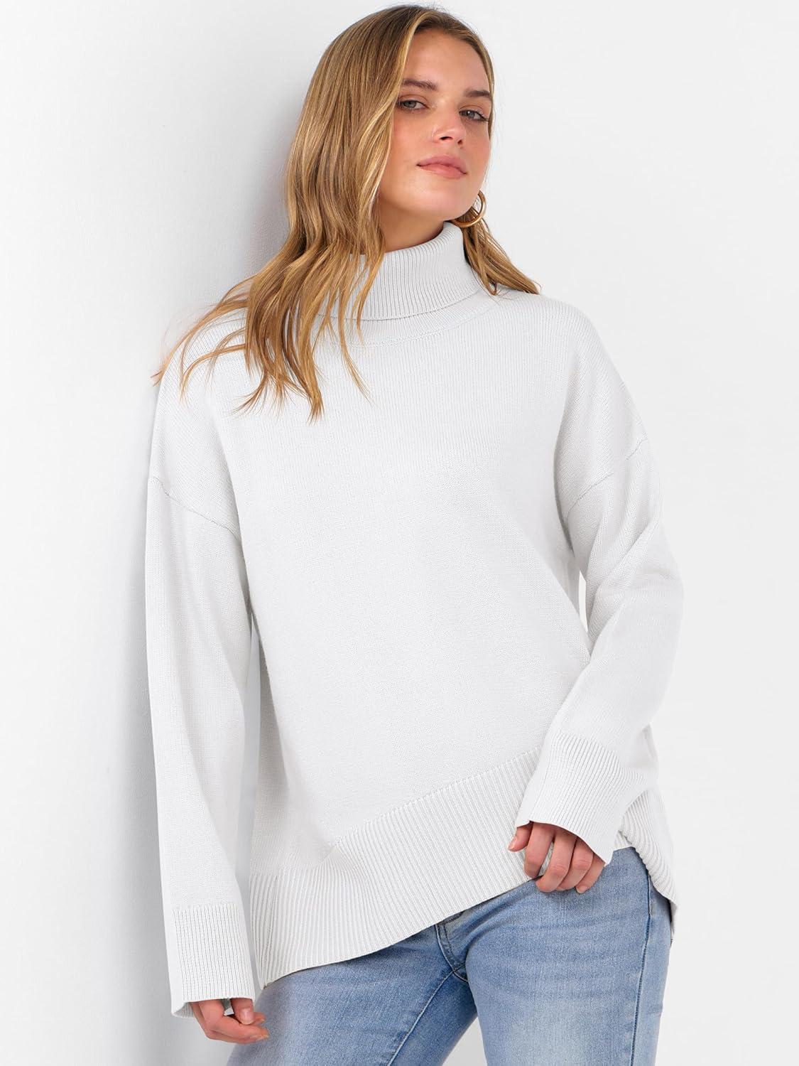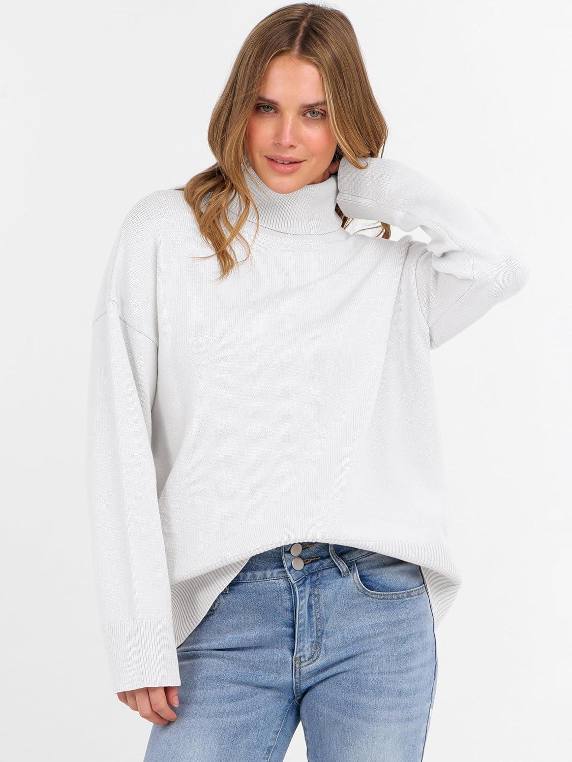 ANRABESS Womens Turtleneck Sweaters Oversized Chunky Long Sleeve Knit High Low Hem Pullover Top 2025 Fall Winter Fashion(White)