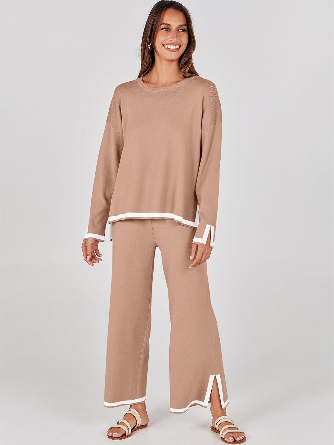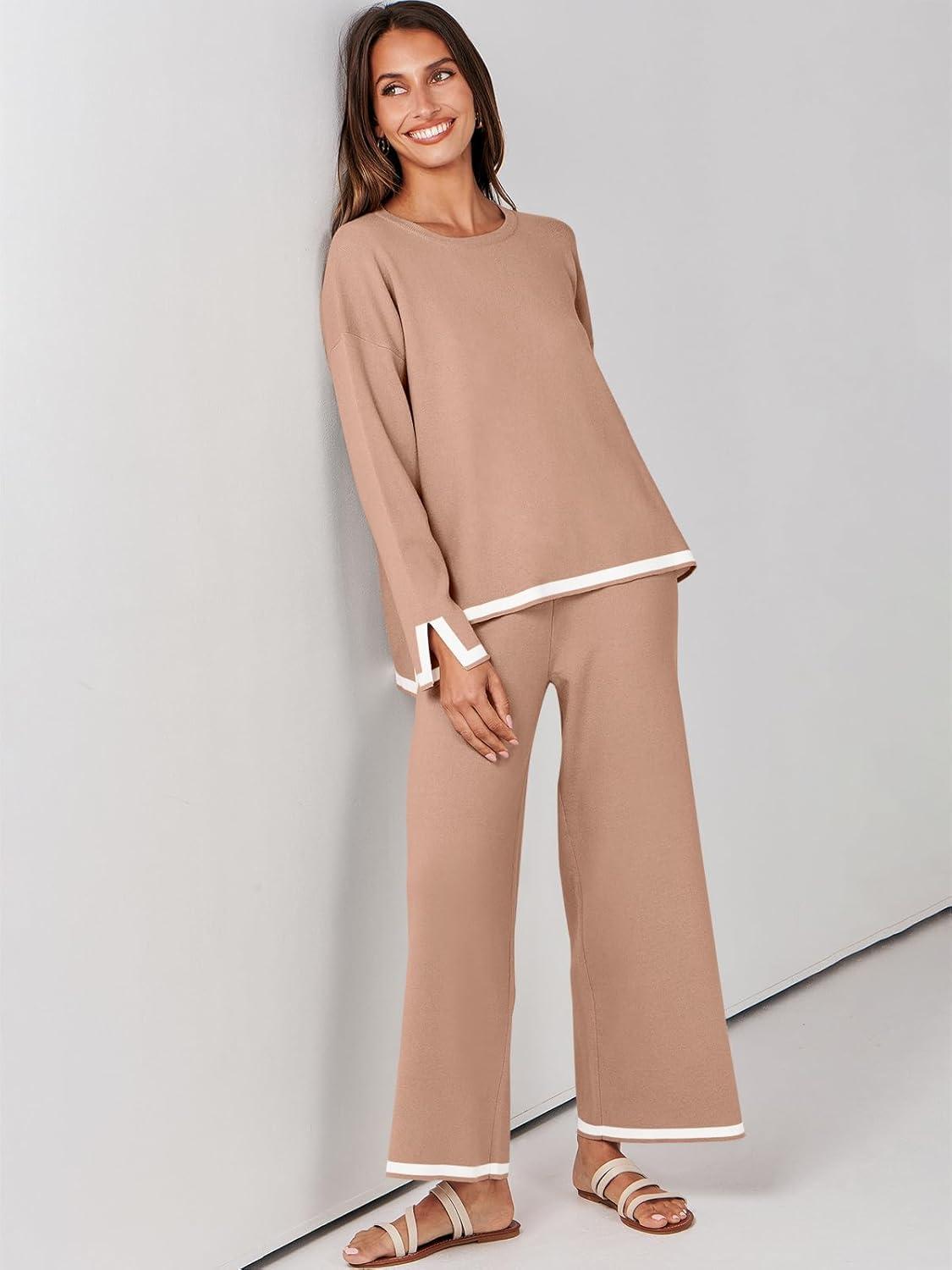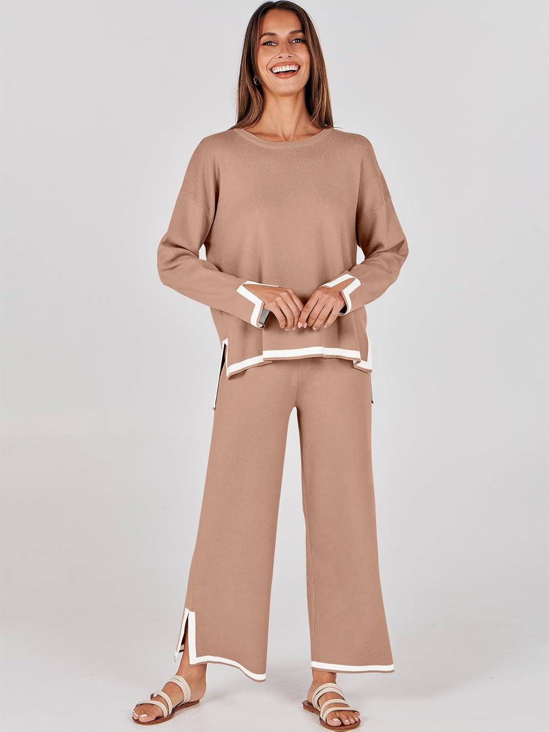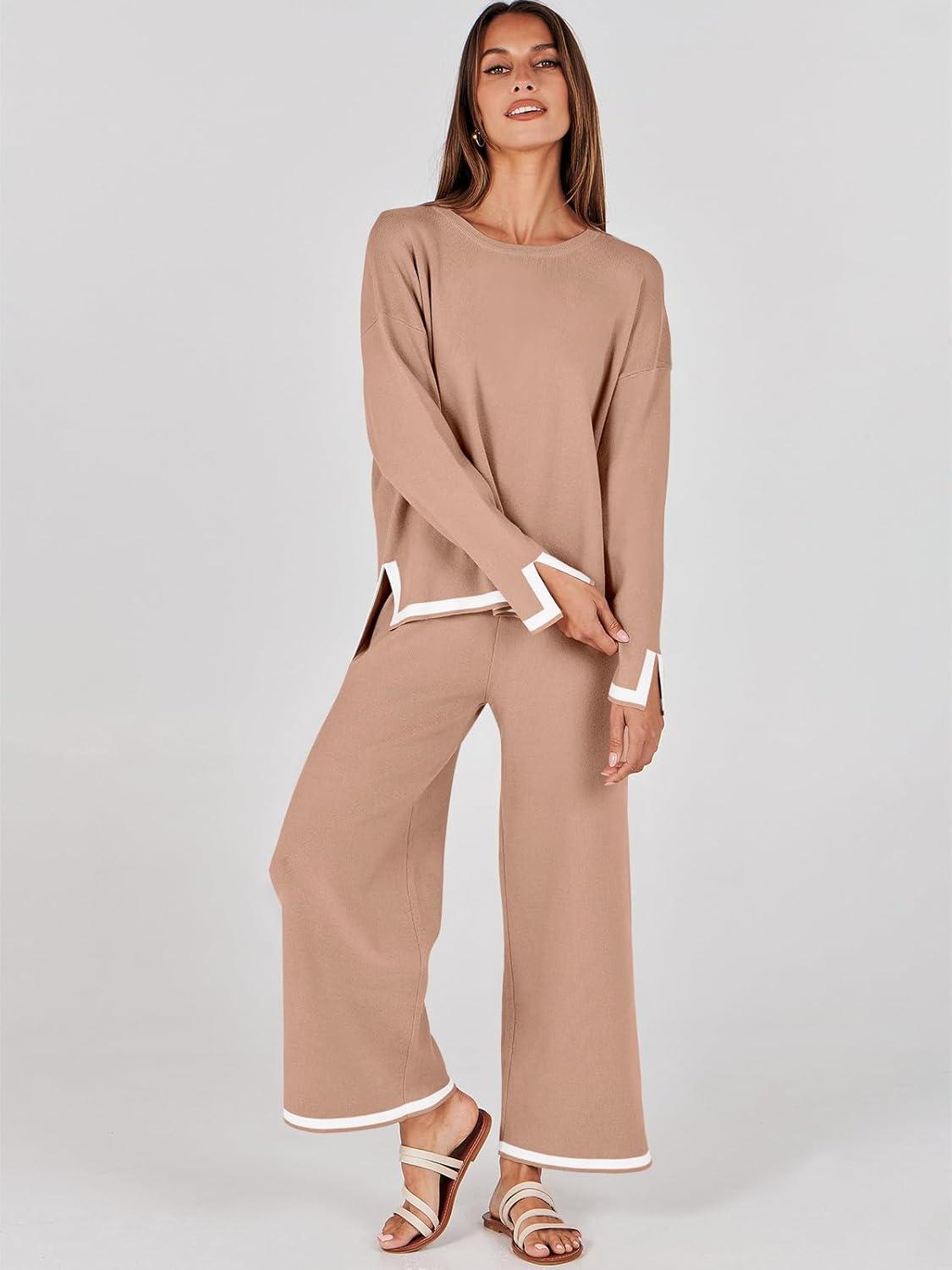 ANRABESS Women’s Two Piece Outfits Knit Pullover Sweater Tops & Wide leg Pants Lounge Matching Sweatsuit Tracksuits Sets(Light Camel)