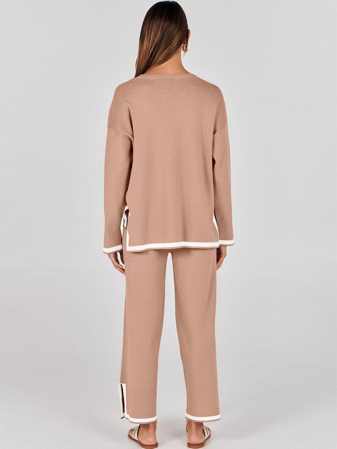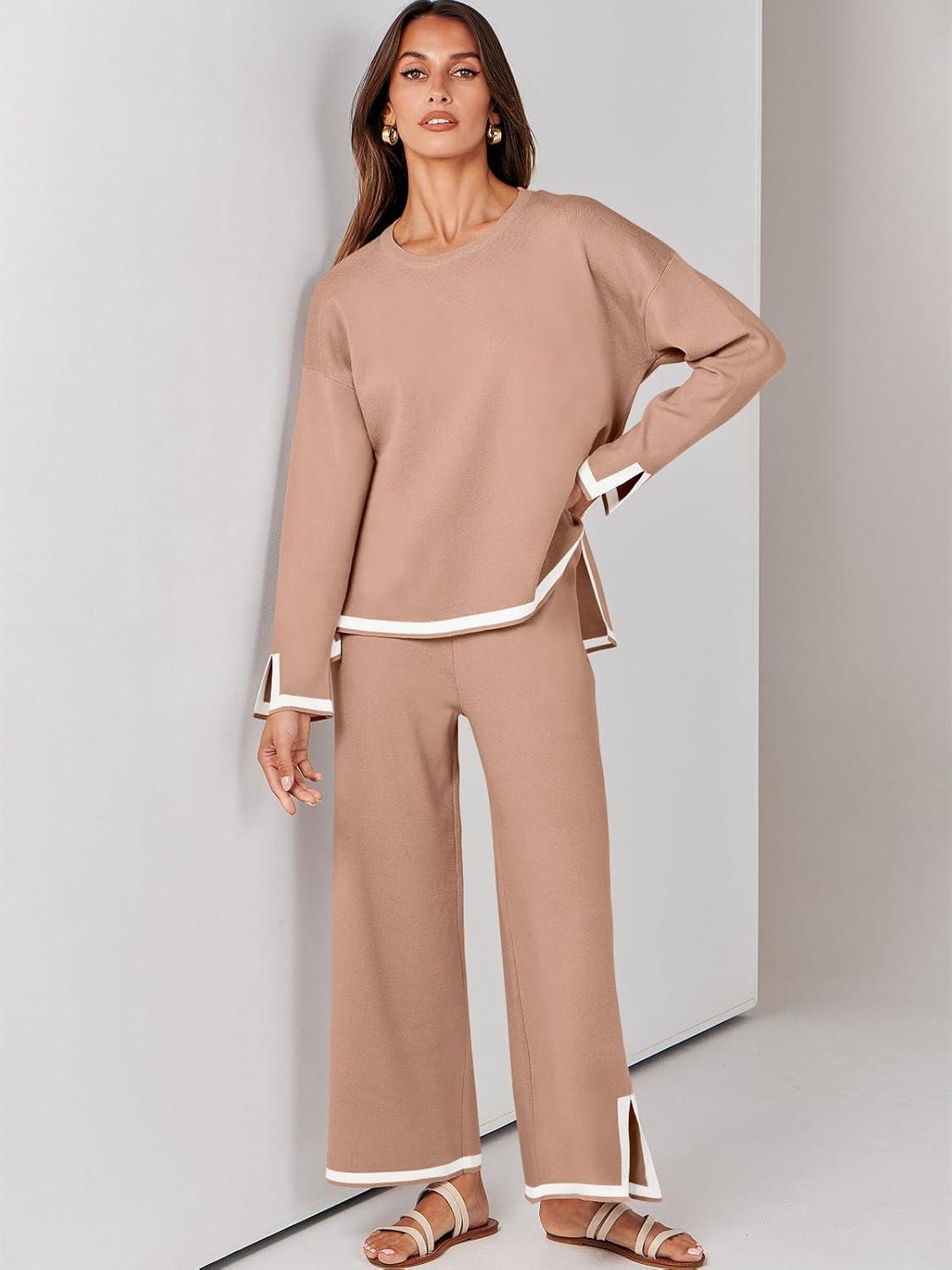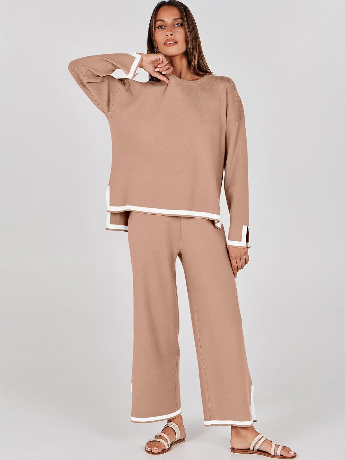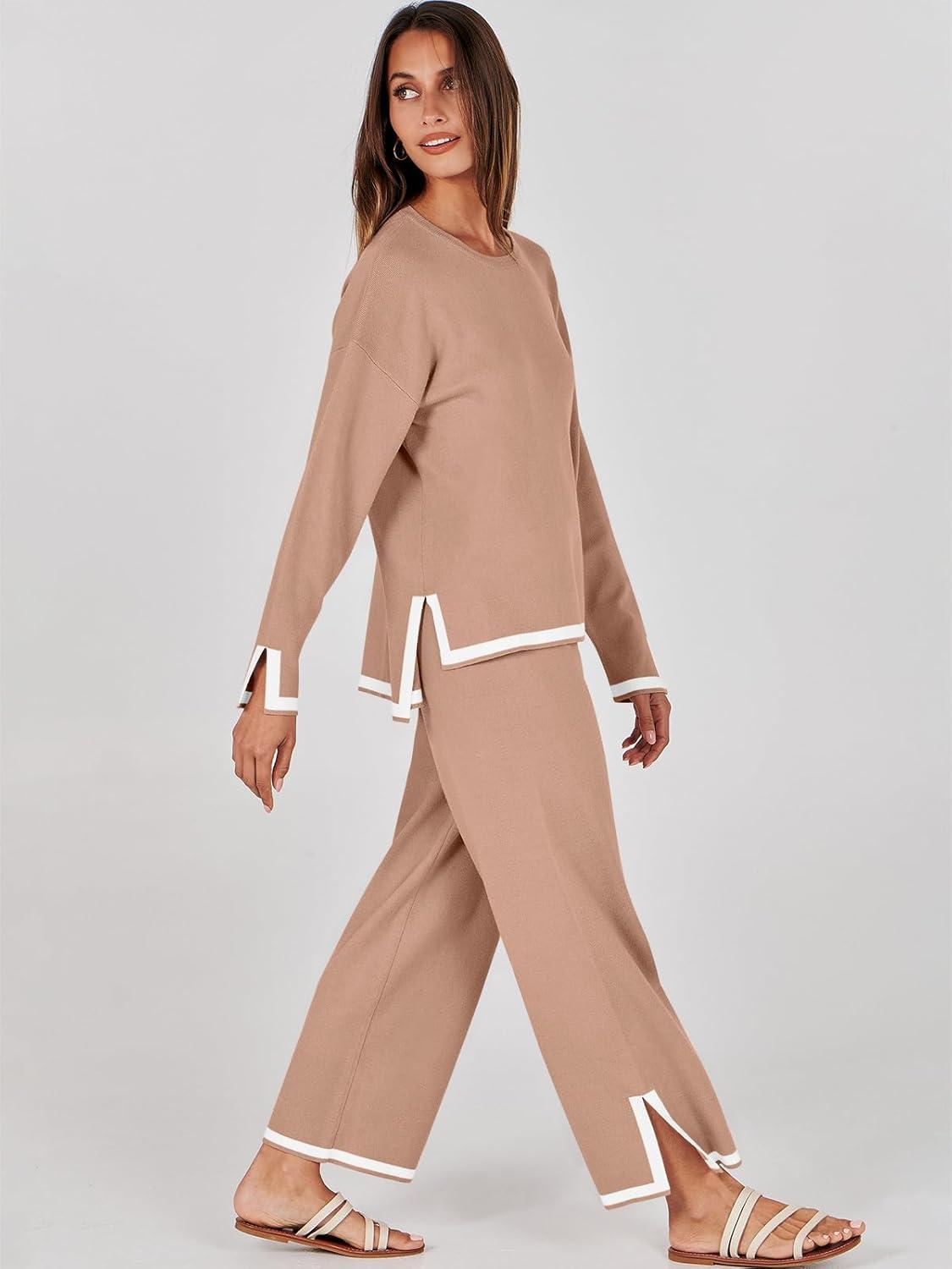 ANRABESS Women’s Two Piece Outfits Knit Pullover Sweater Tops & Wide leg Pants Lounge Matching Sweatsuit Tracksuits Sets(Light Camel)