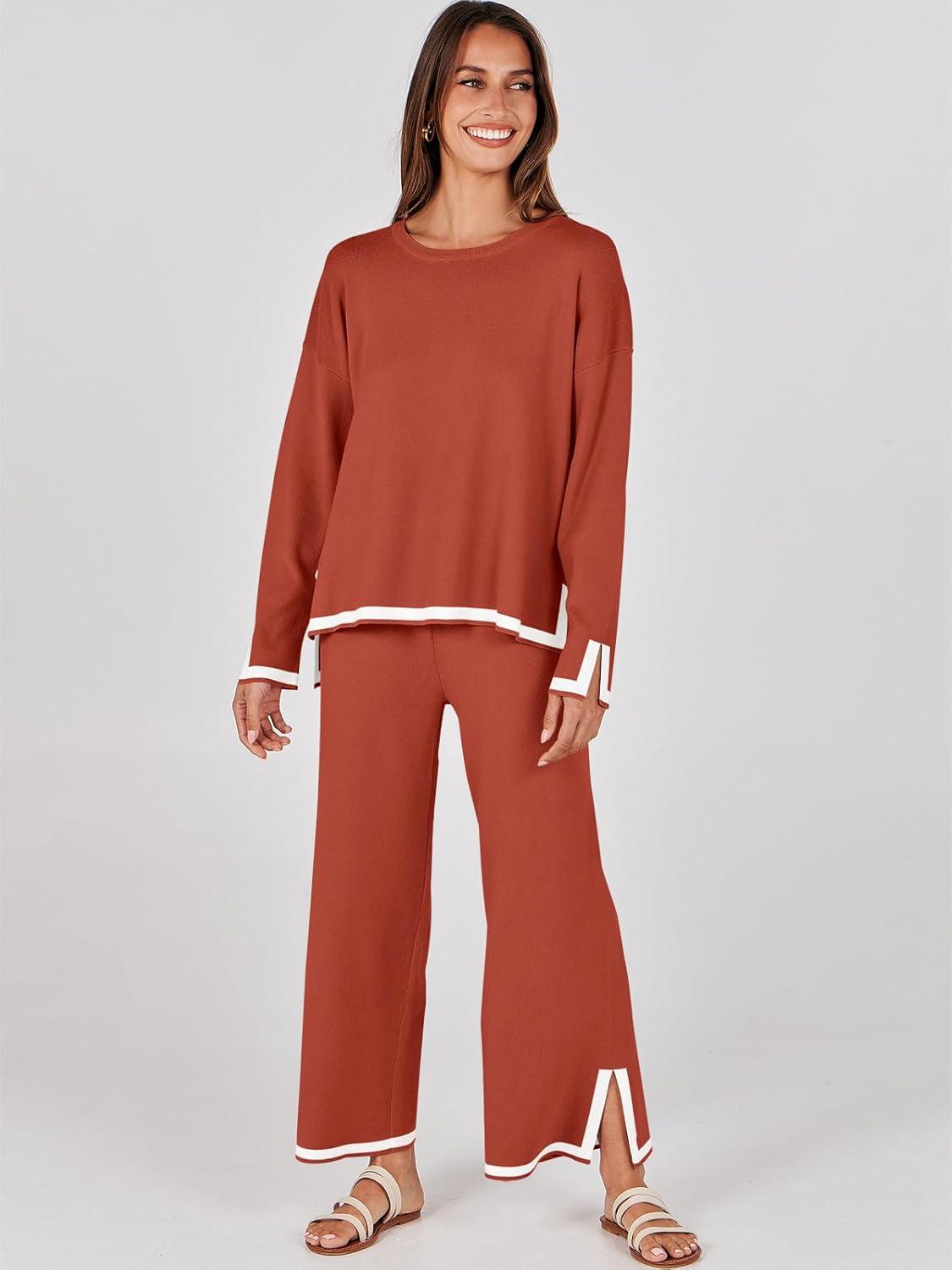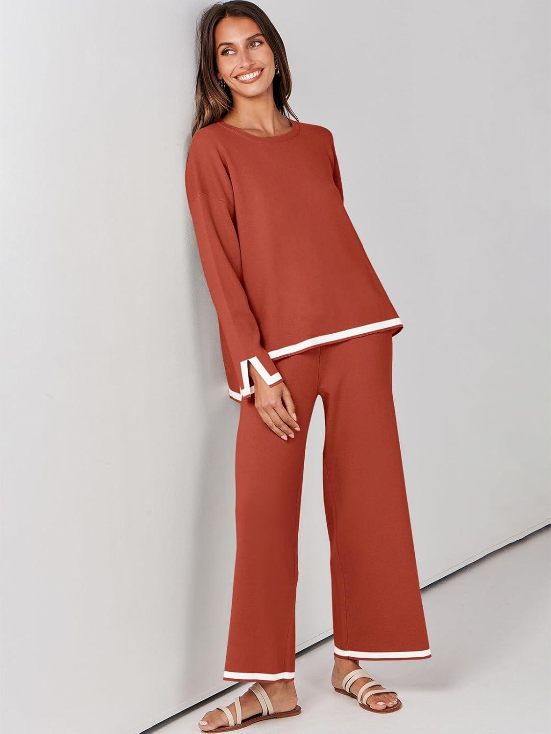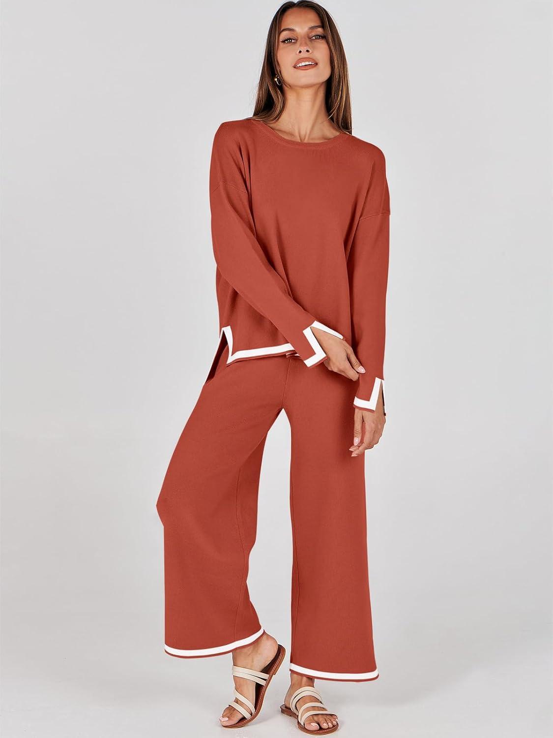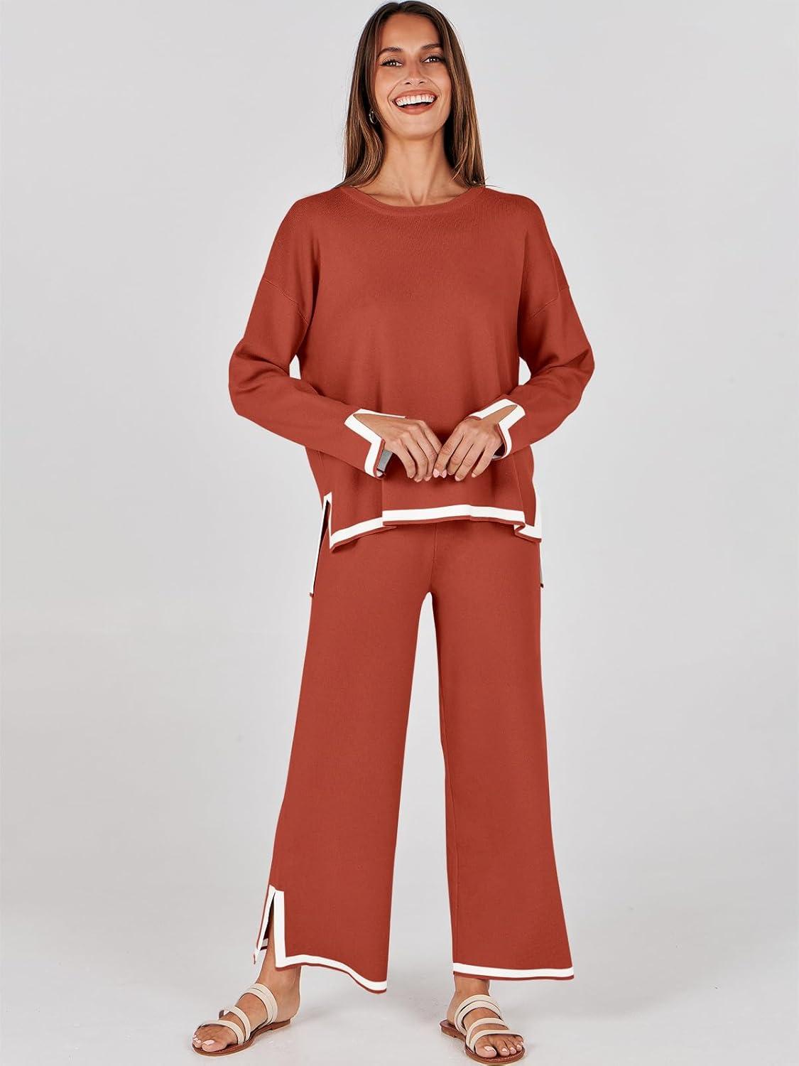 ANRABESS Women’s Two Piece Outfits Knit Pullover Sweater Tops & Wide leg Pants Lounge Matching Sweatsuit Tracksuits Sets(Rust)