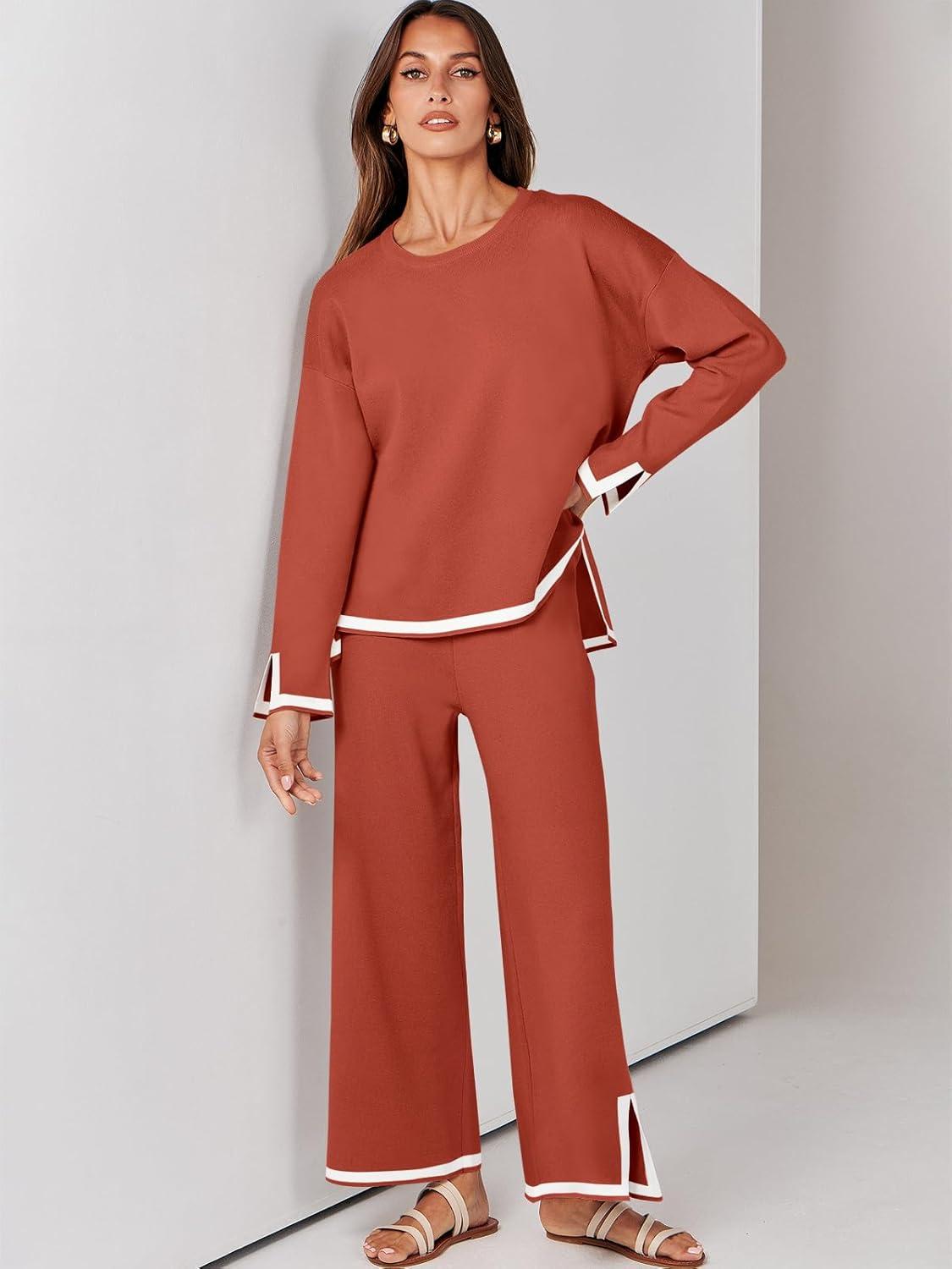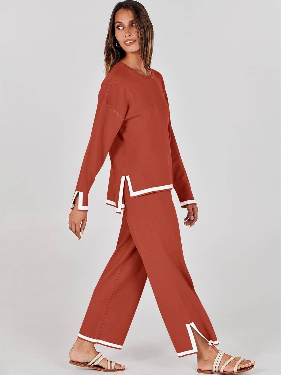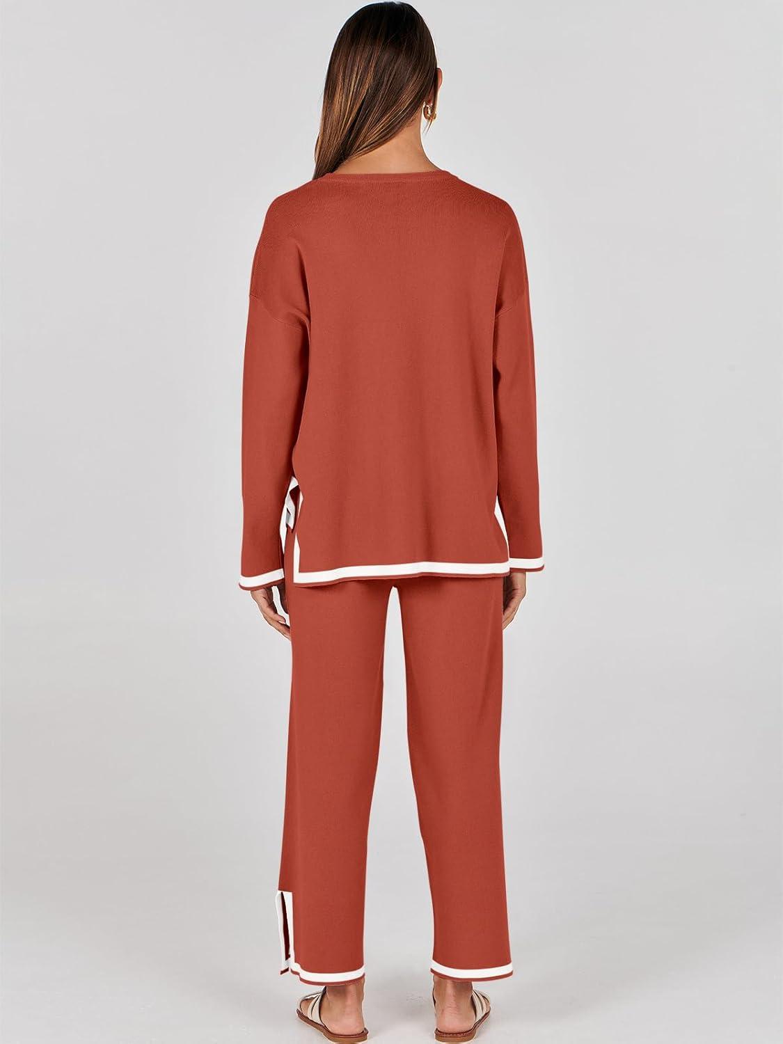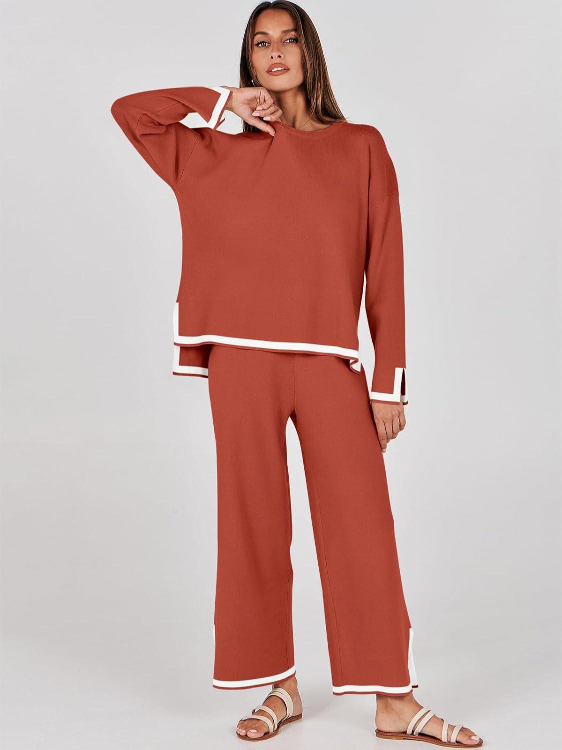 ANRABESS Women’s Two Piece Outfits Knit Pullover Sweater Tops & Wide leg Pants Lounge Matching Sweatsuit Tracksuits Sets(Rust)