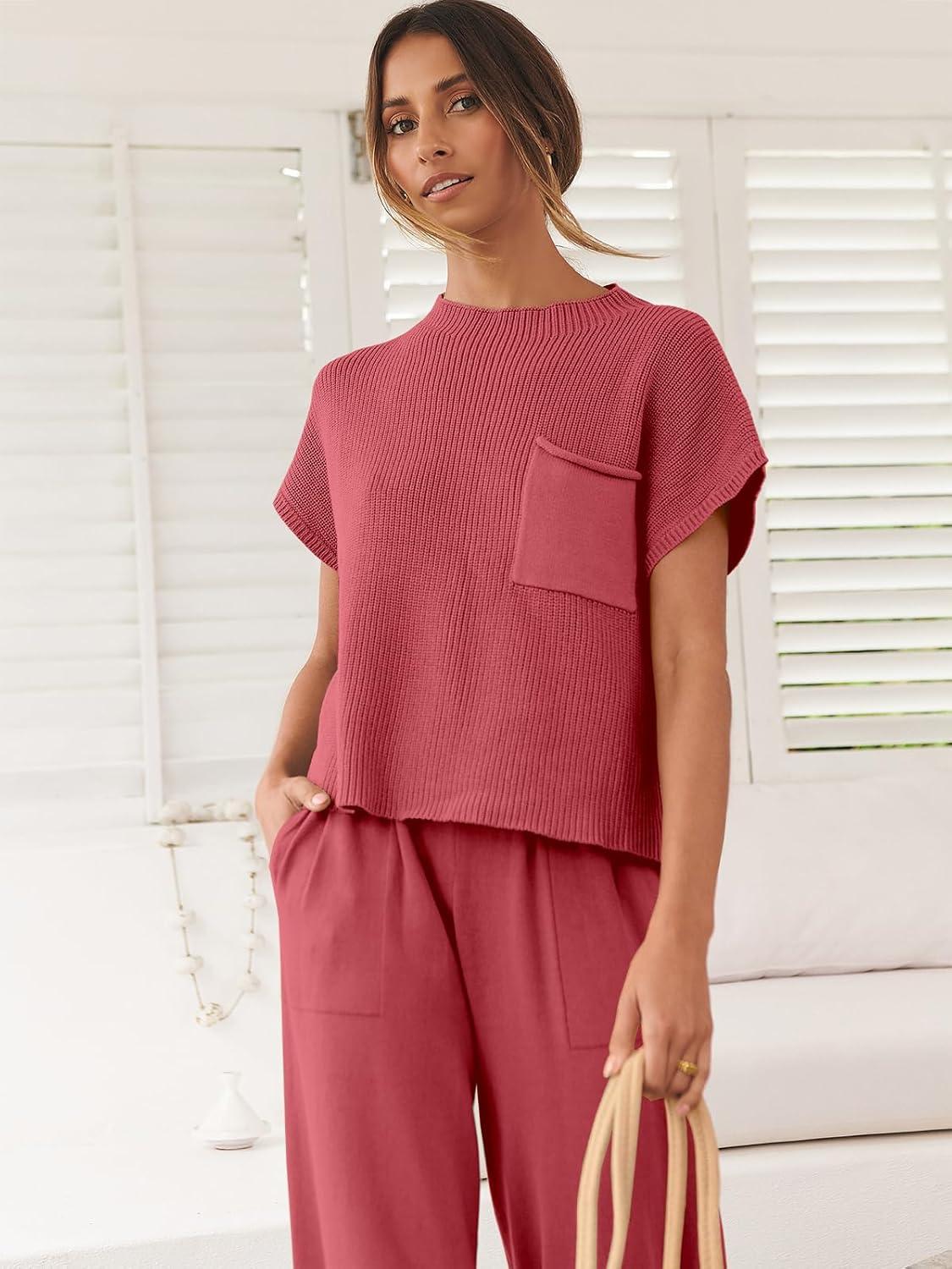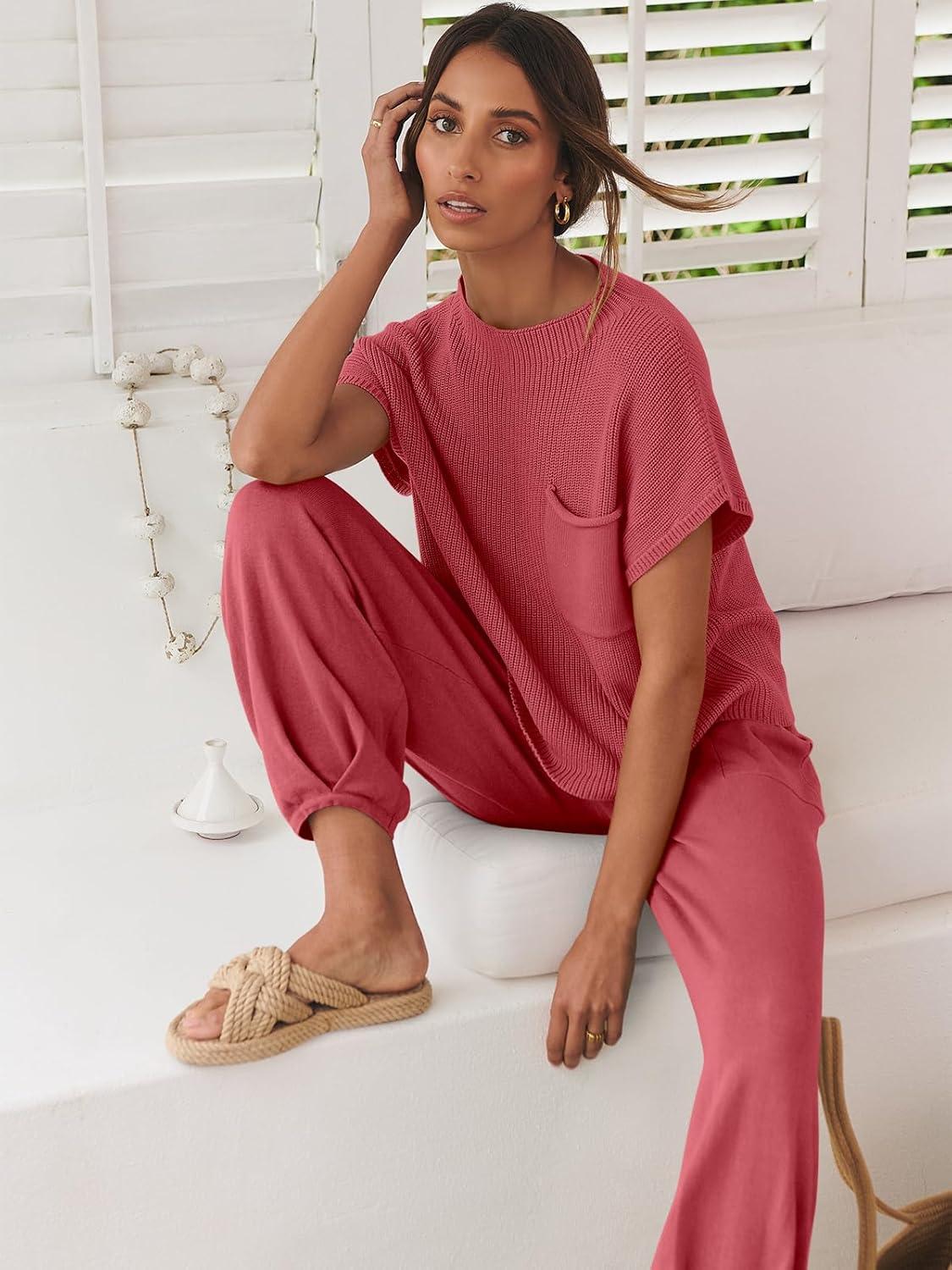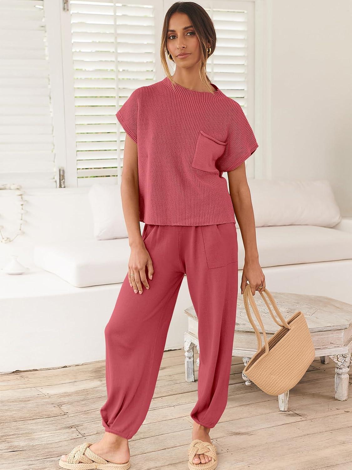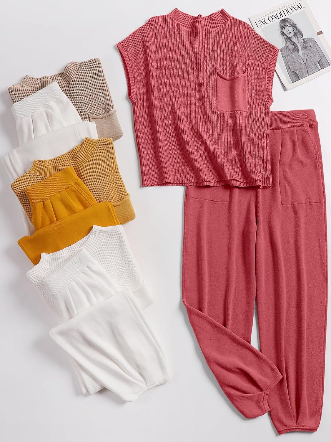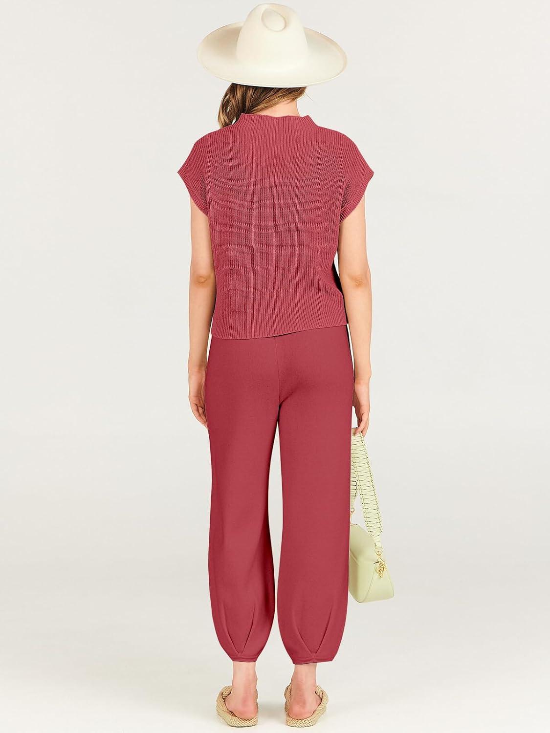 ANRABESS Women’s Two Piece Outfits Knit Sweater Vest Crop Top Pants Lounge Matching Tracksuit Sweatsuit Travel Clothes Sets(Hot Pink)