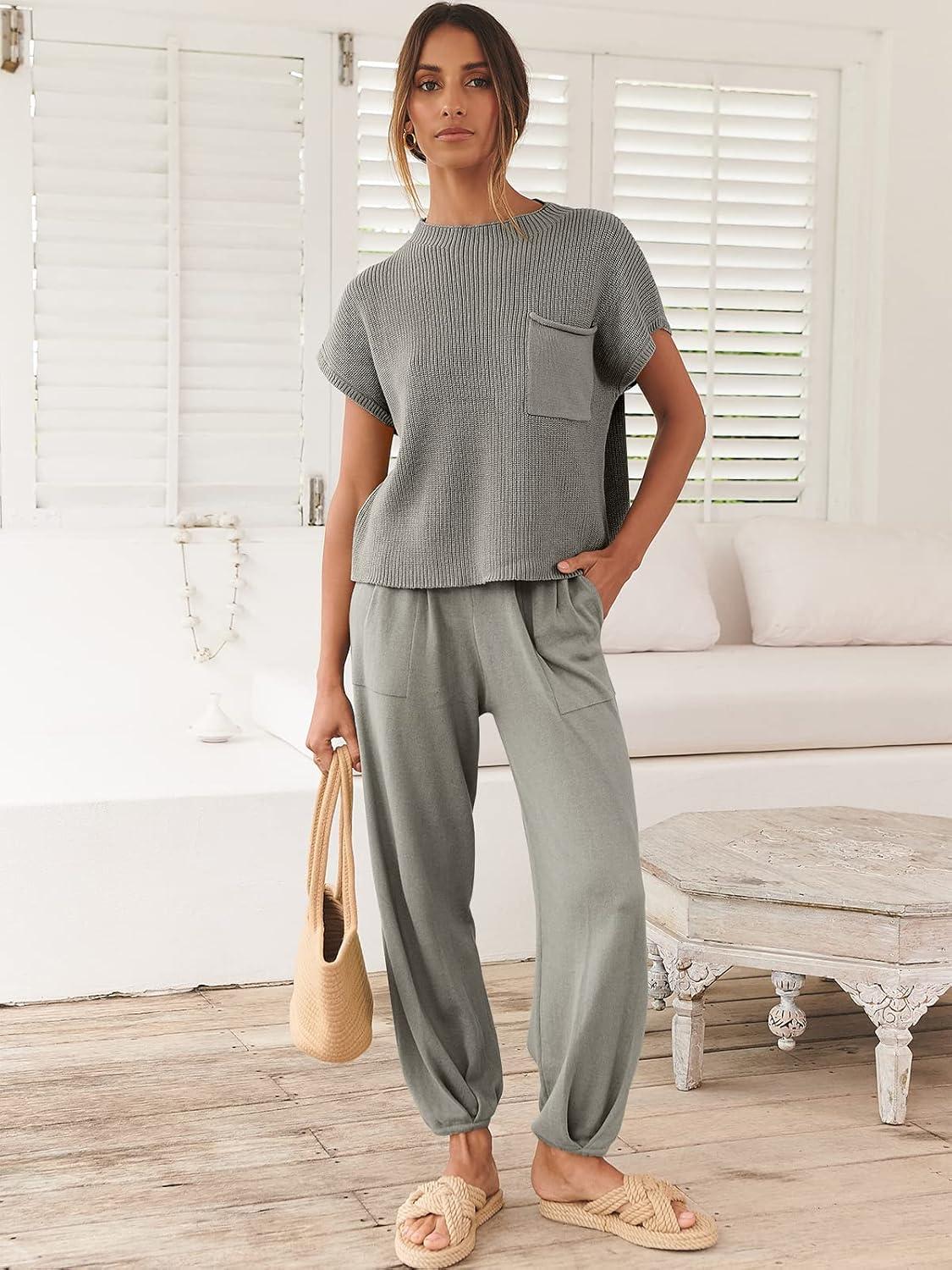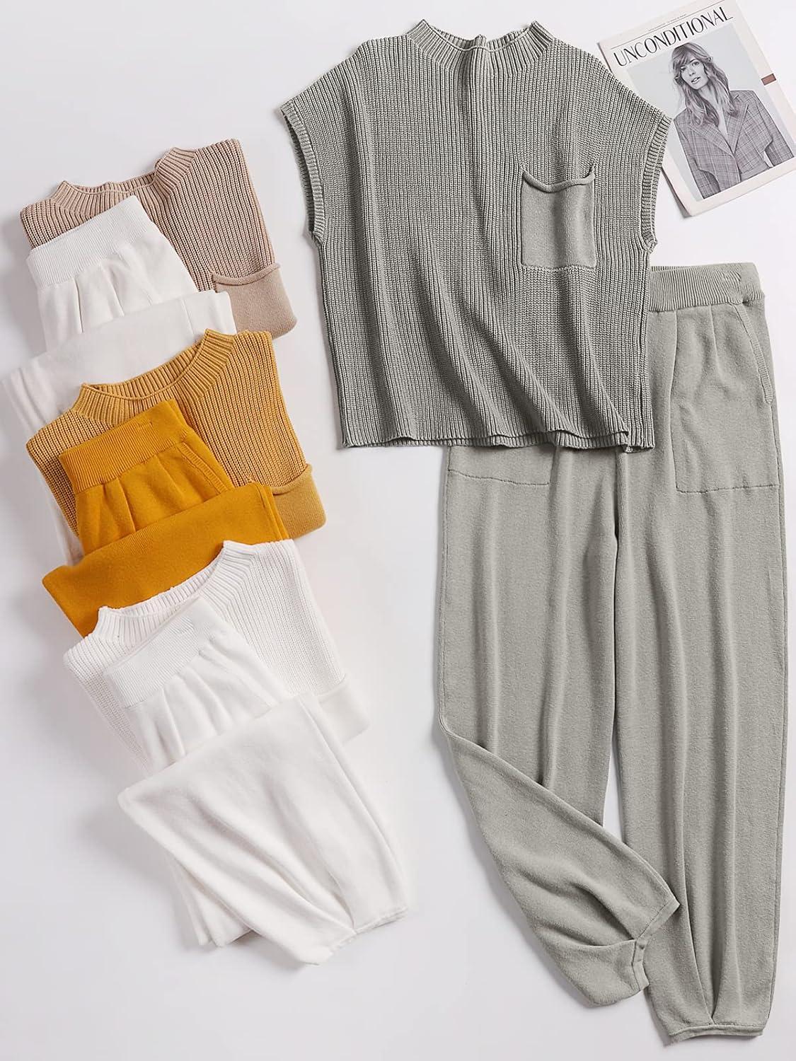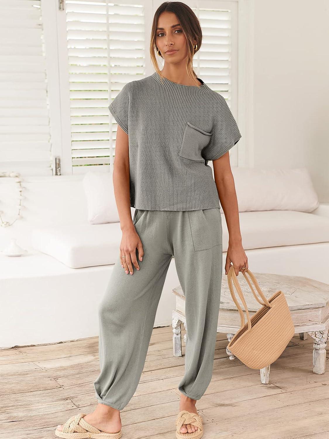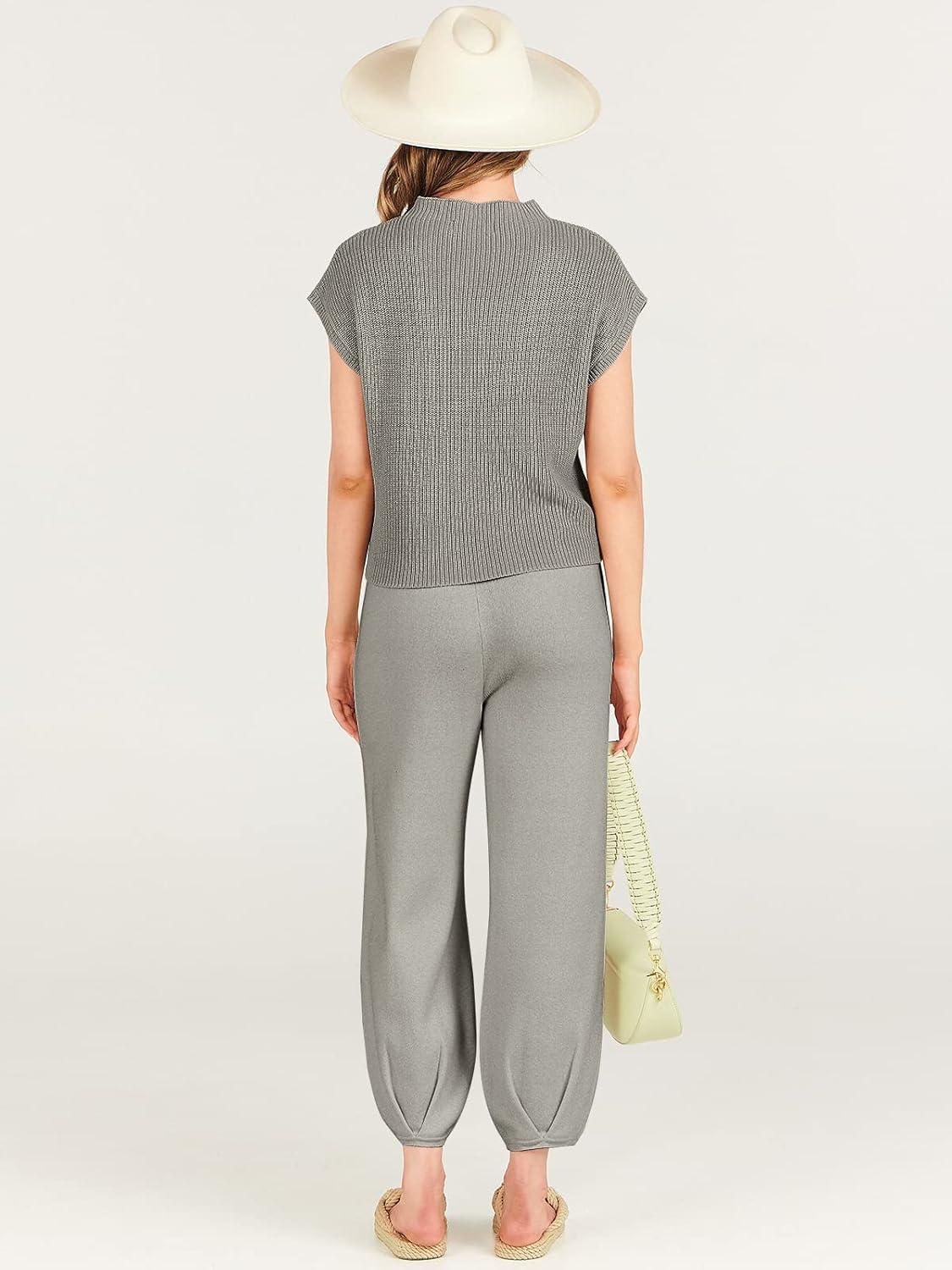 ANRABESS Women’s Two Piece Outfits Knit Sweater Vest Crop Top Pants Lounge Matching Tracksuit Sweatsuit Travel Clothes Sets(Light Grey)