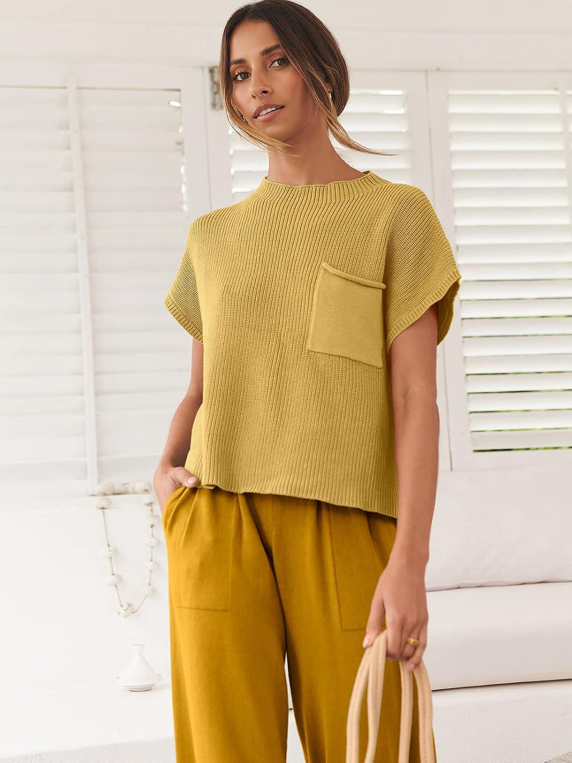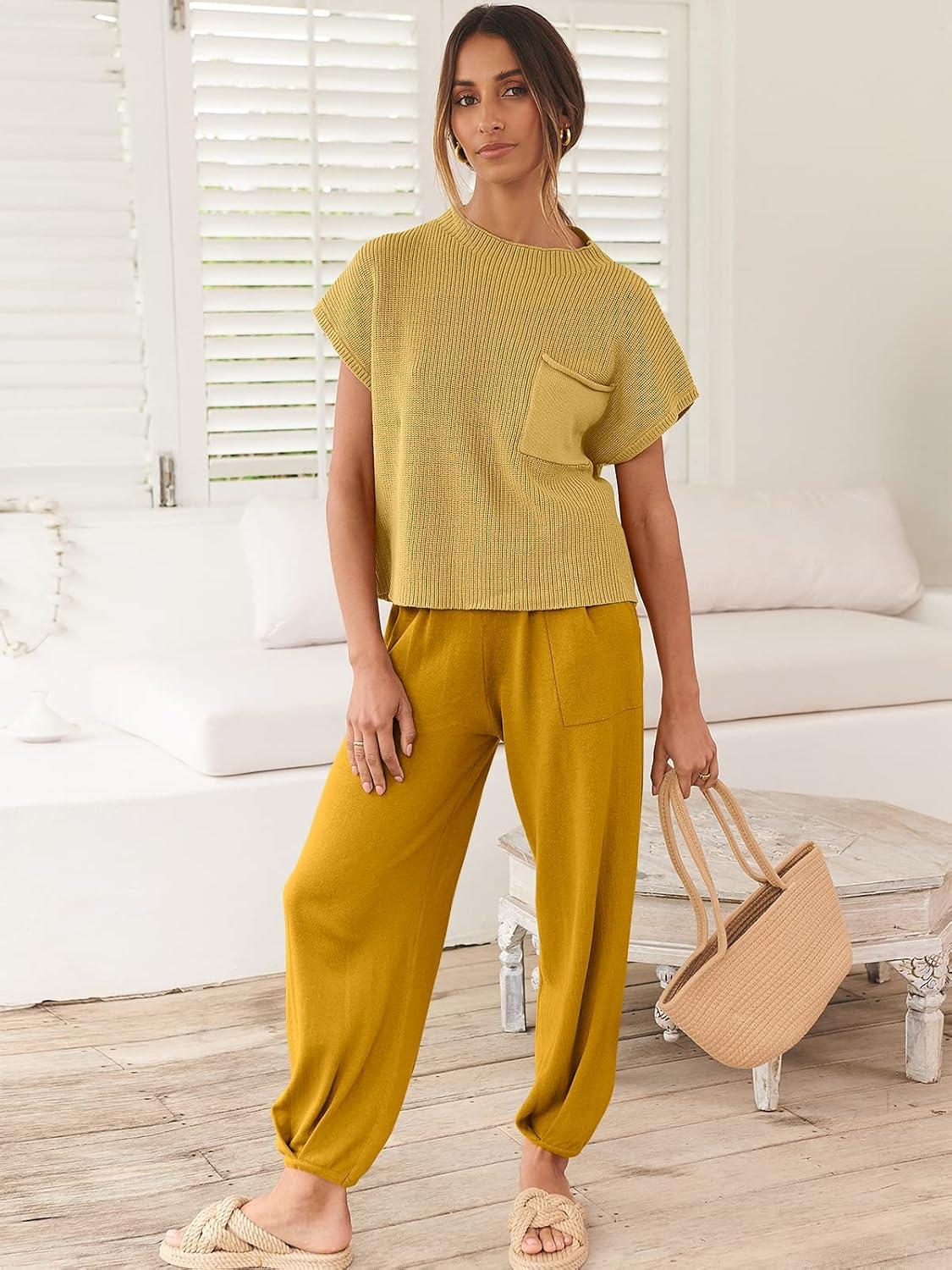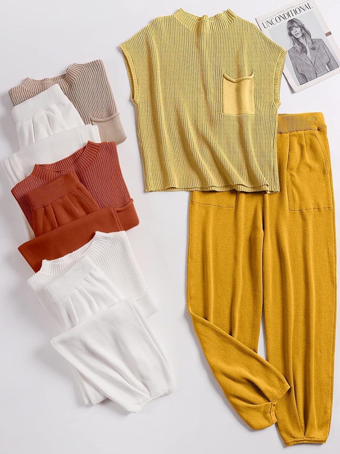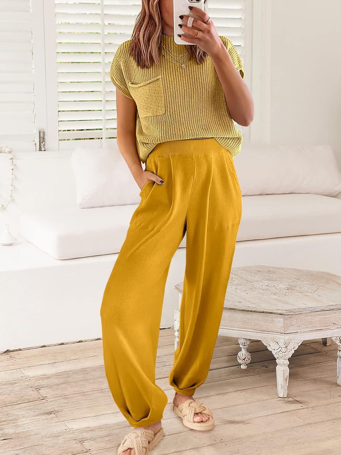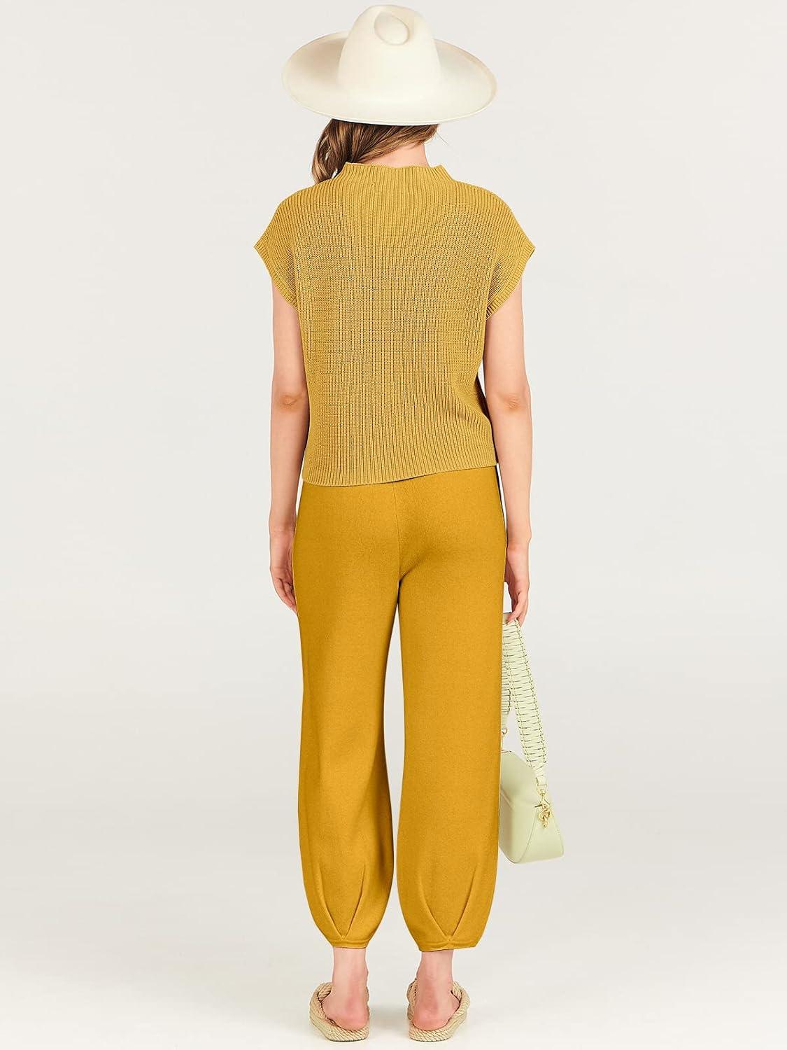 ANRABESS Women’s Two Piece Outfits Knit Sweater Vest Crop Top Pants Lounge Matching Tracksuit Sweatsuit Travel Clothes Sets(Yellow)