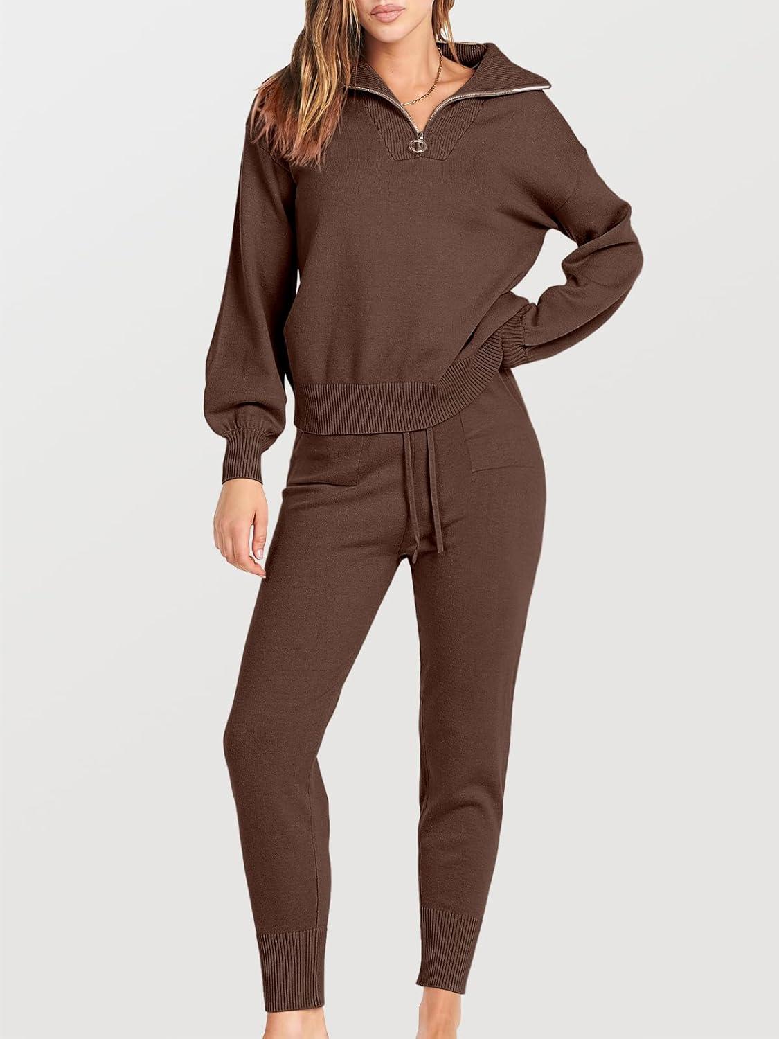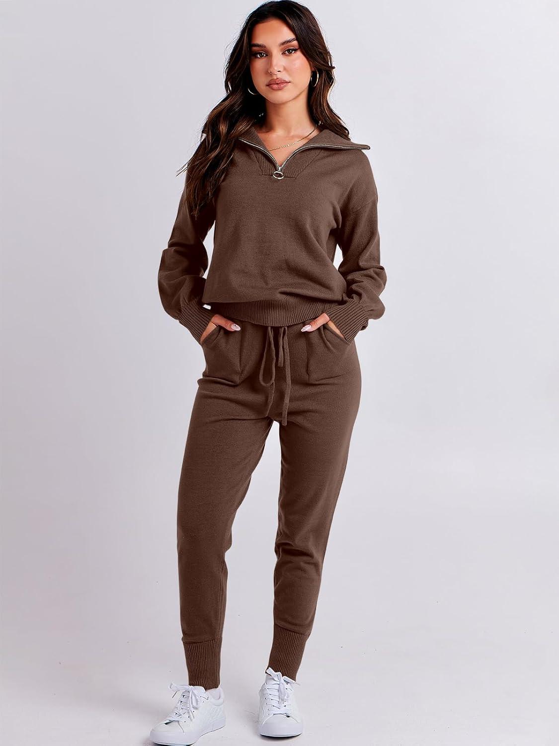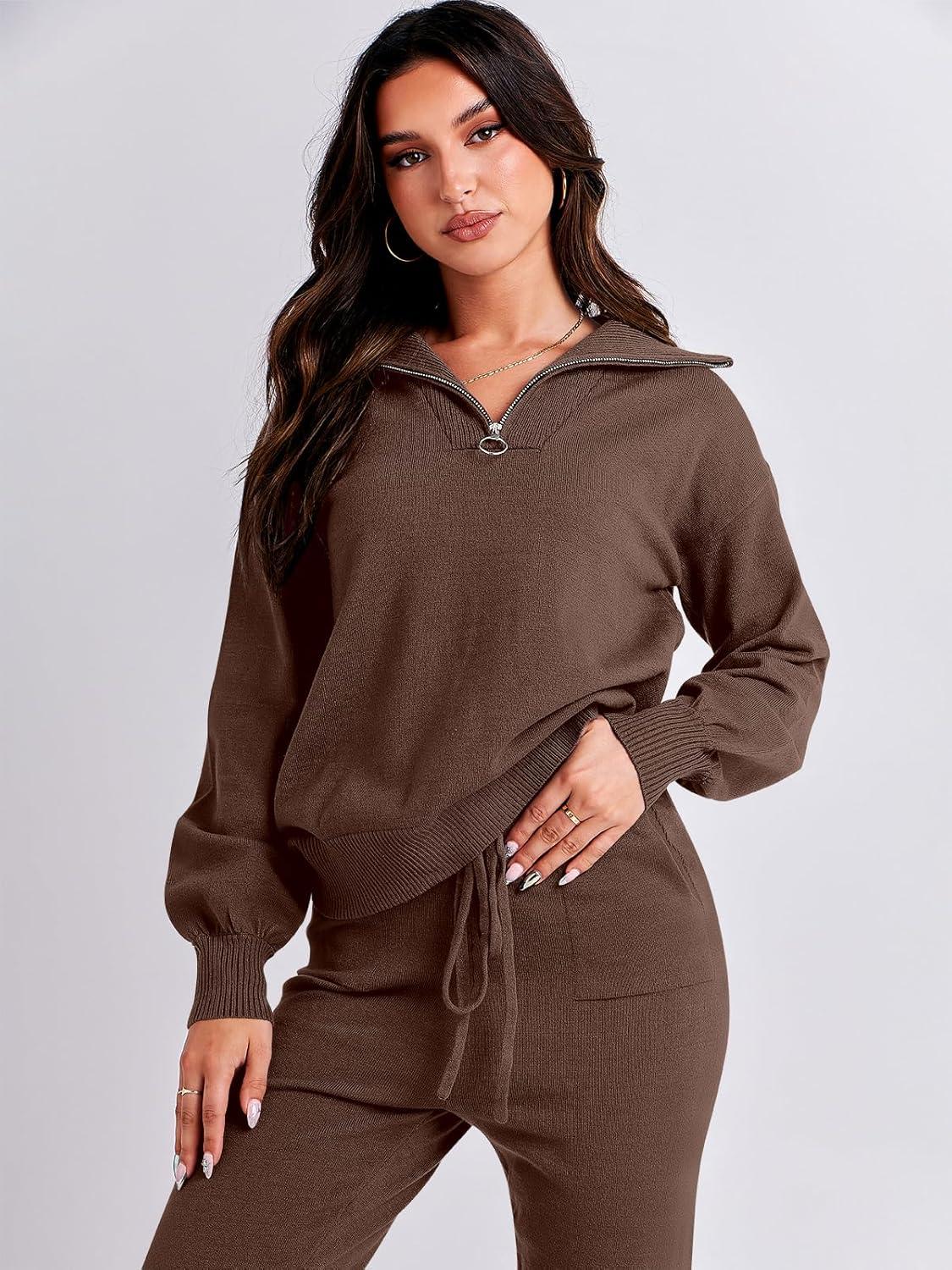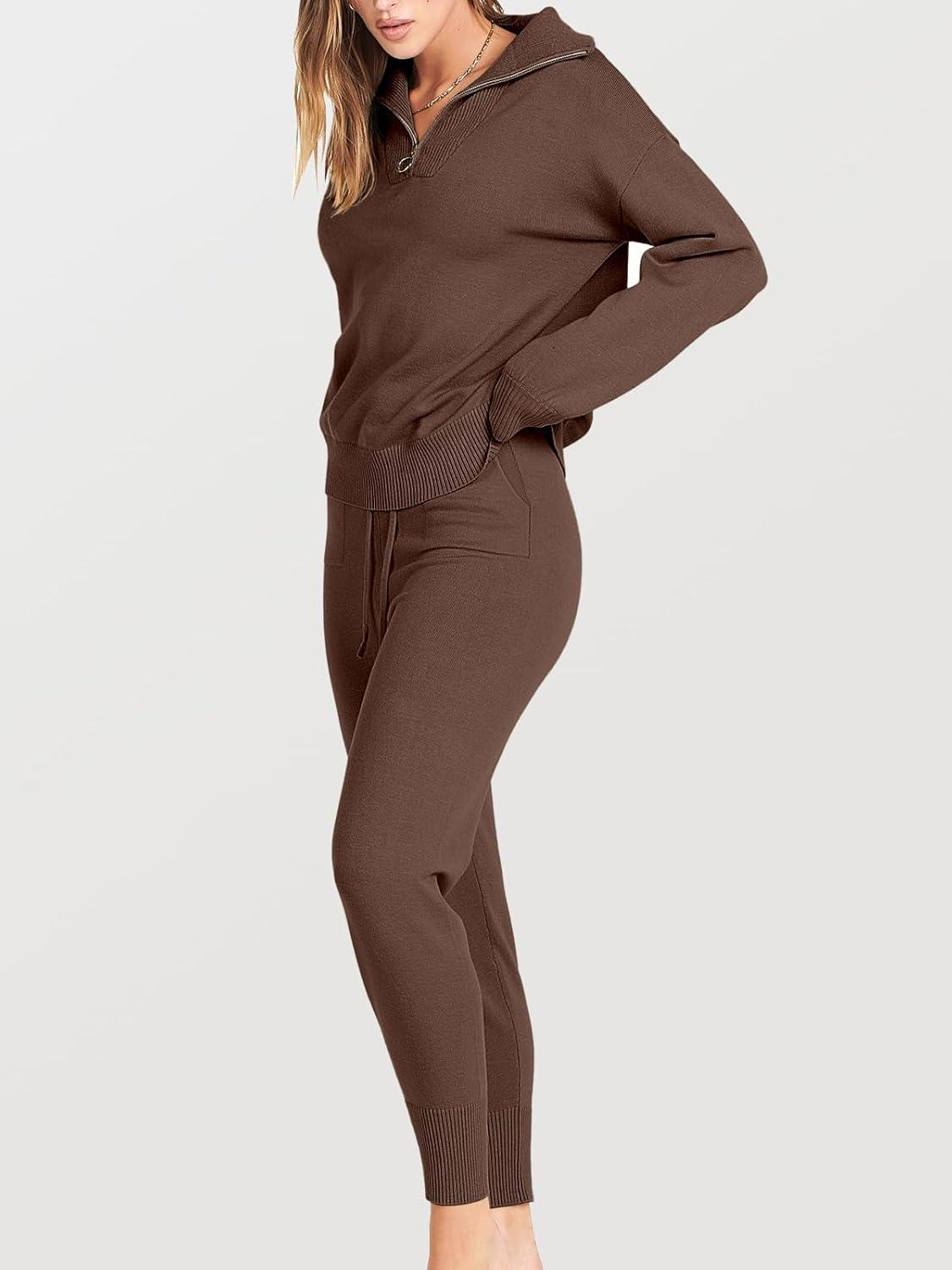ANRABESS Women’s Two Piece Outfits Sweater Lounge Sets Long Sleeve Zip Up Knit Pullover Jogger Pants Tracksuit Travel Outfits(Brown)