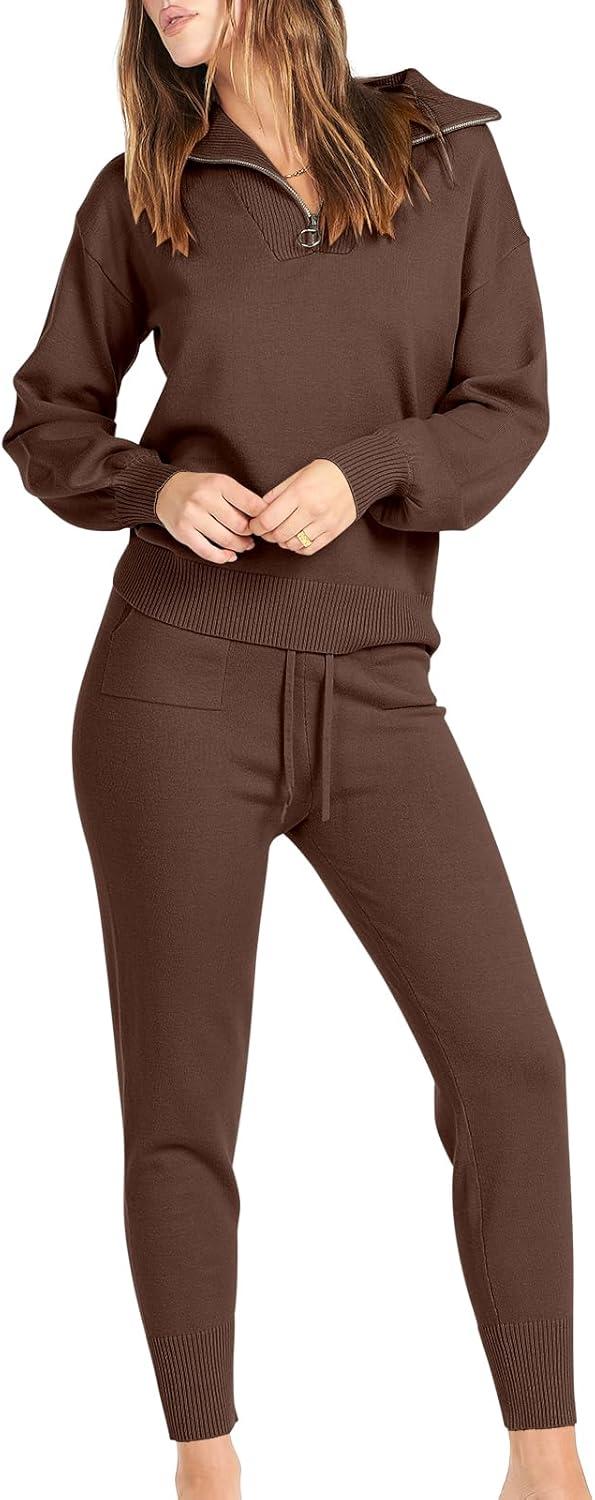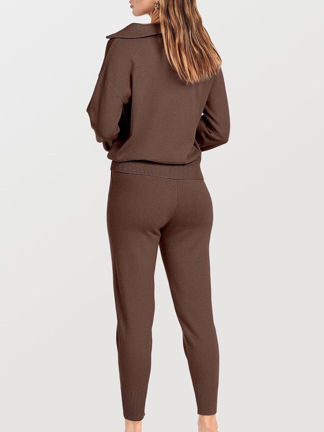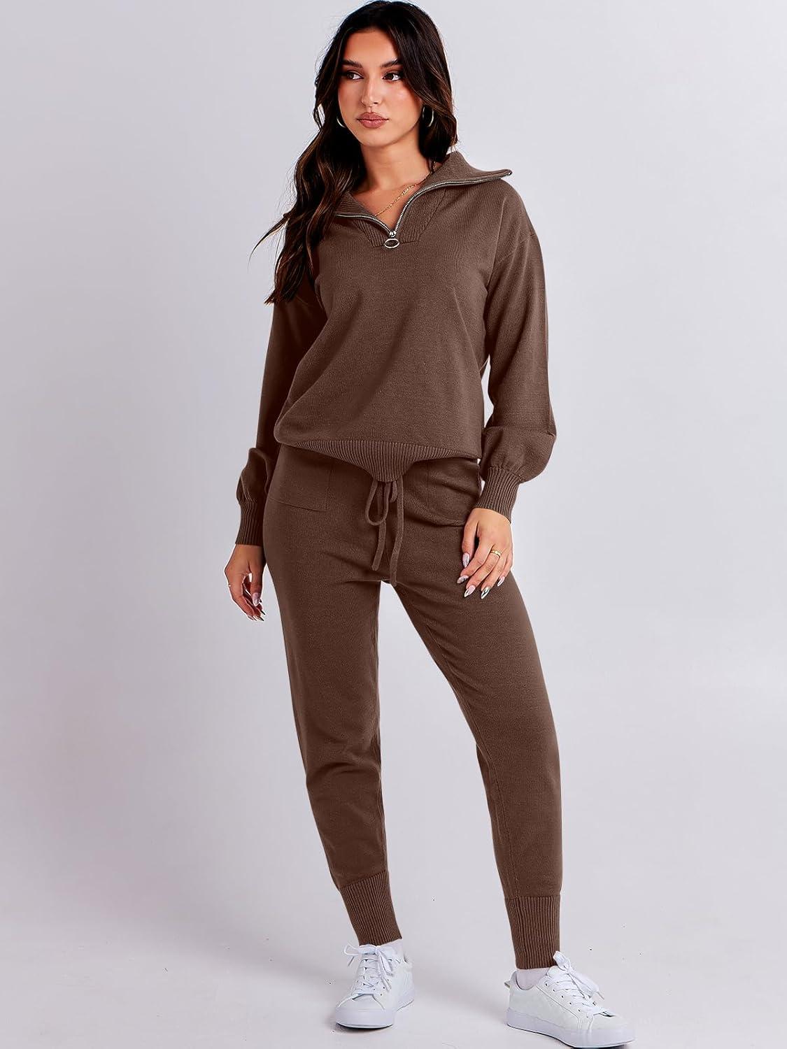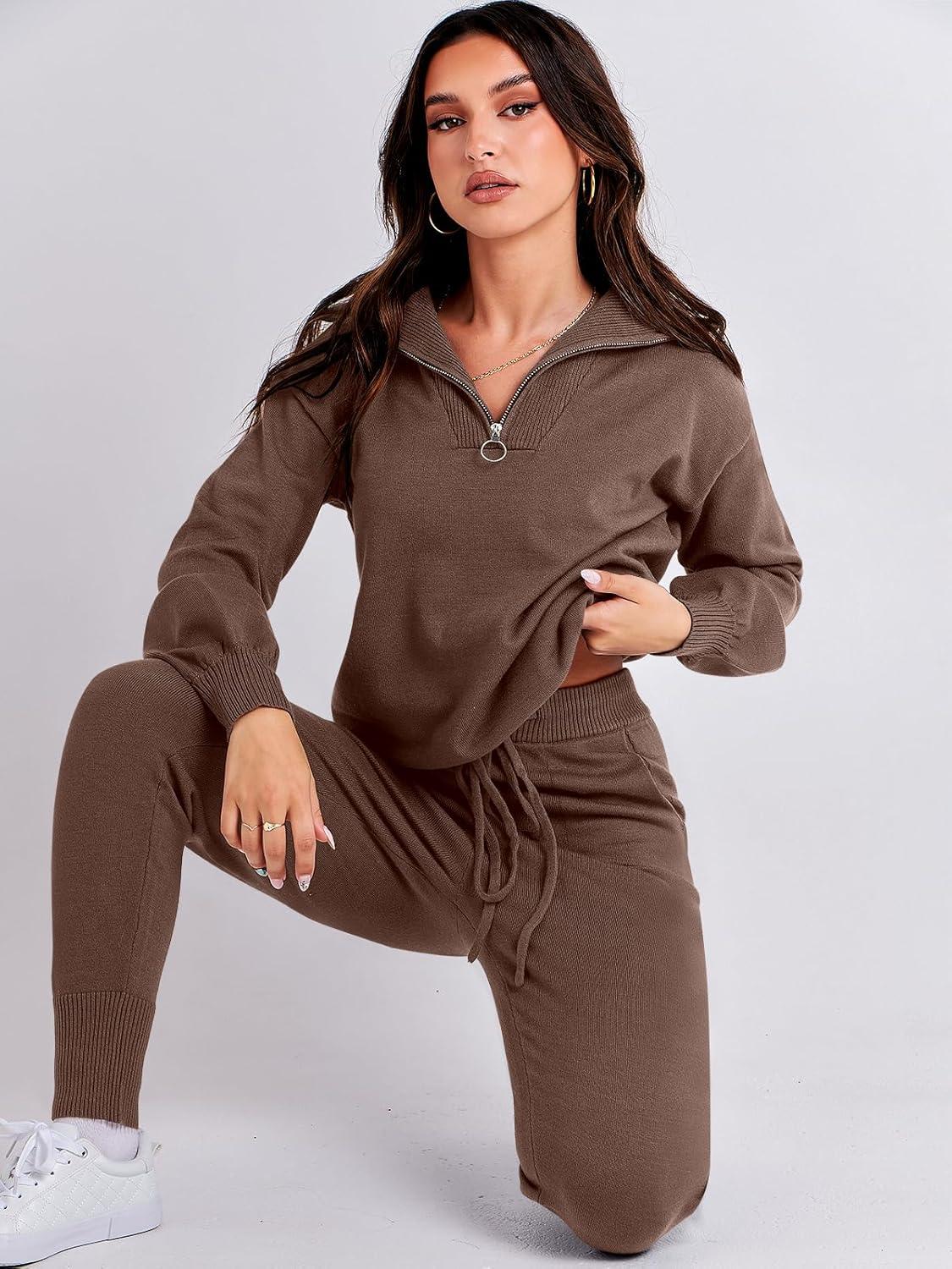 ANRABESS Women’s Two Piece Outfits Sweater Lounge Sets Long Sleeve Zip Up Knit Pullover Jogger Pants Tracksuit Travel Outfits(Brown)