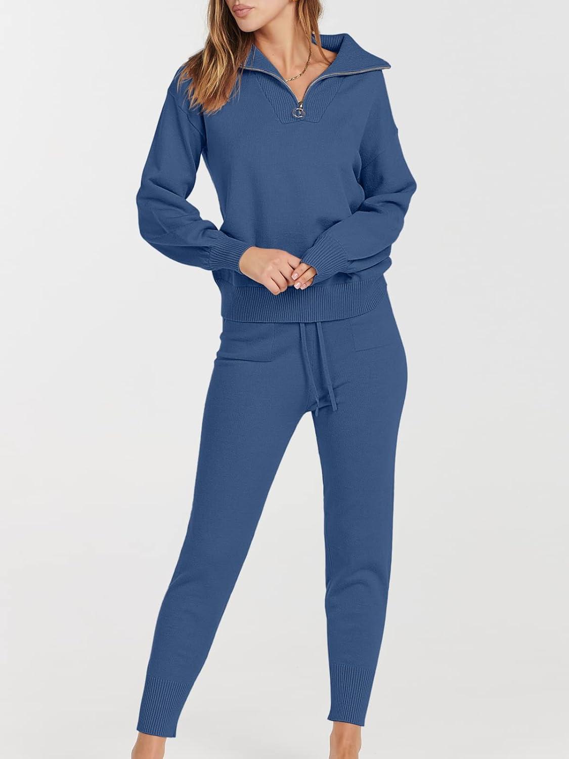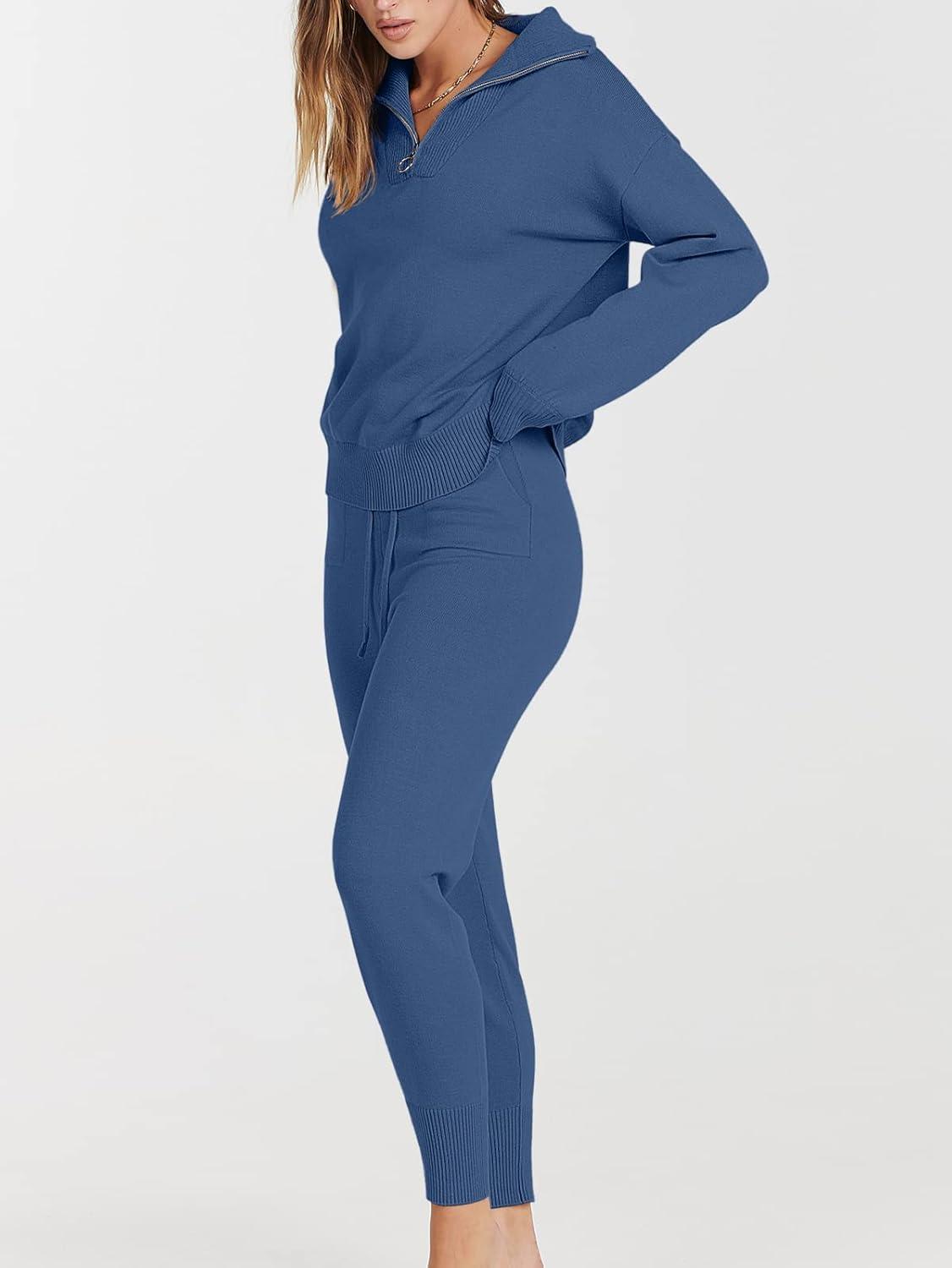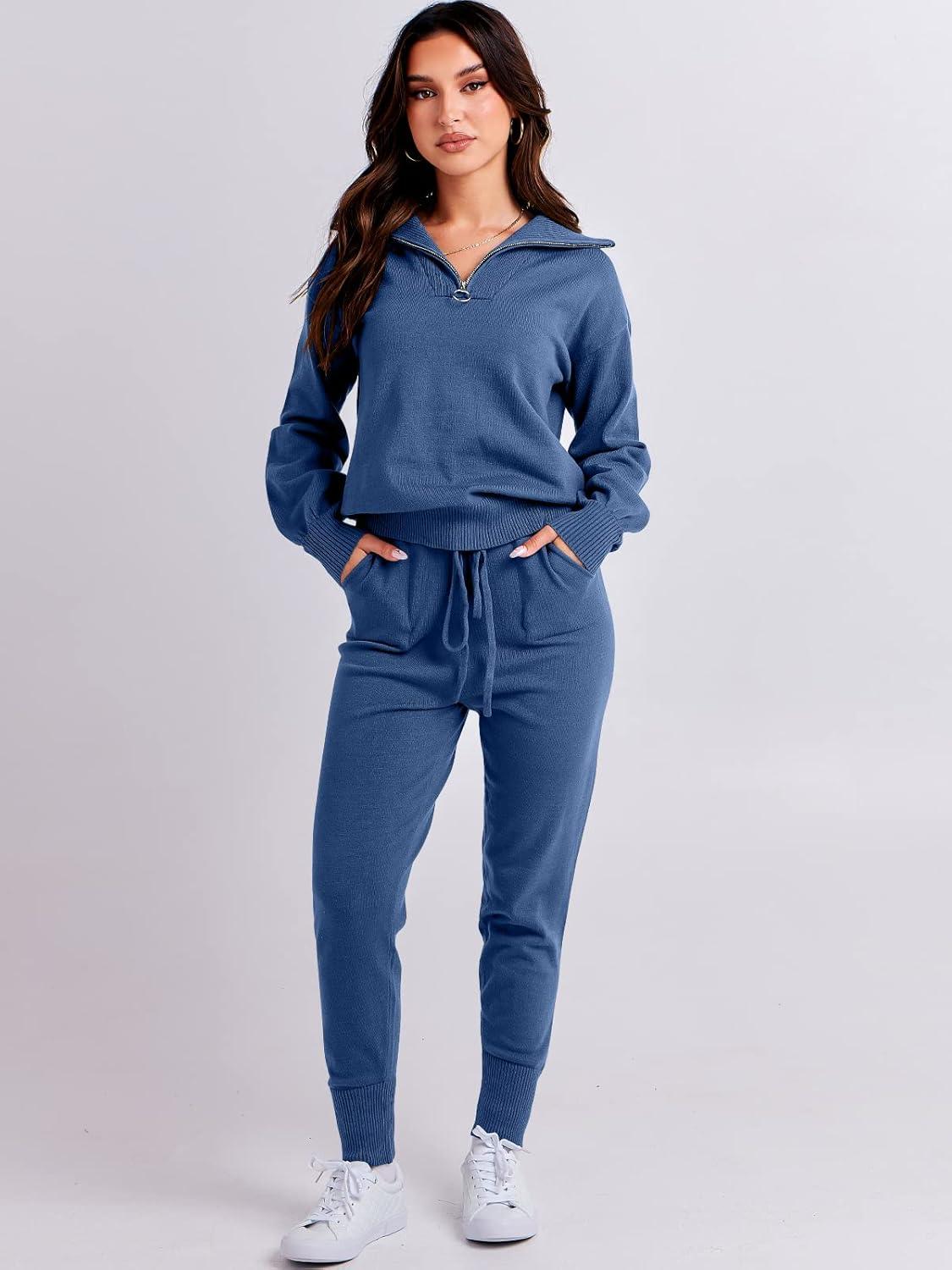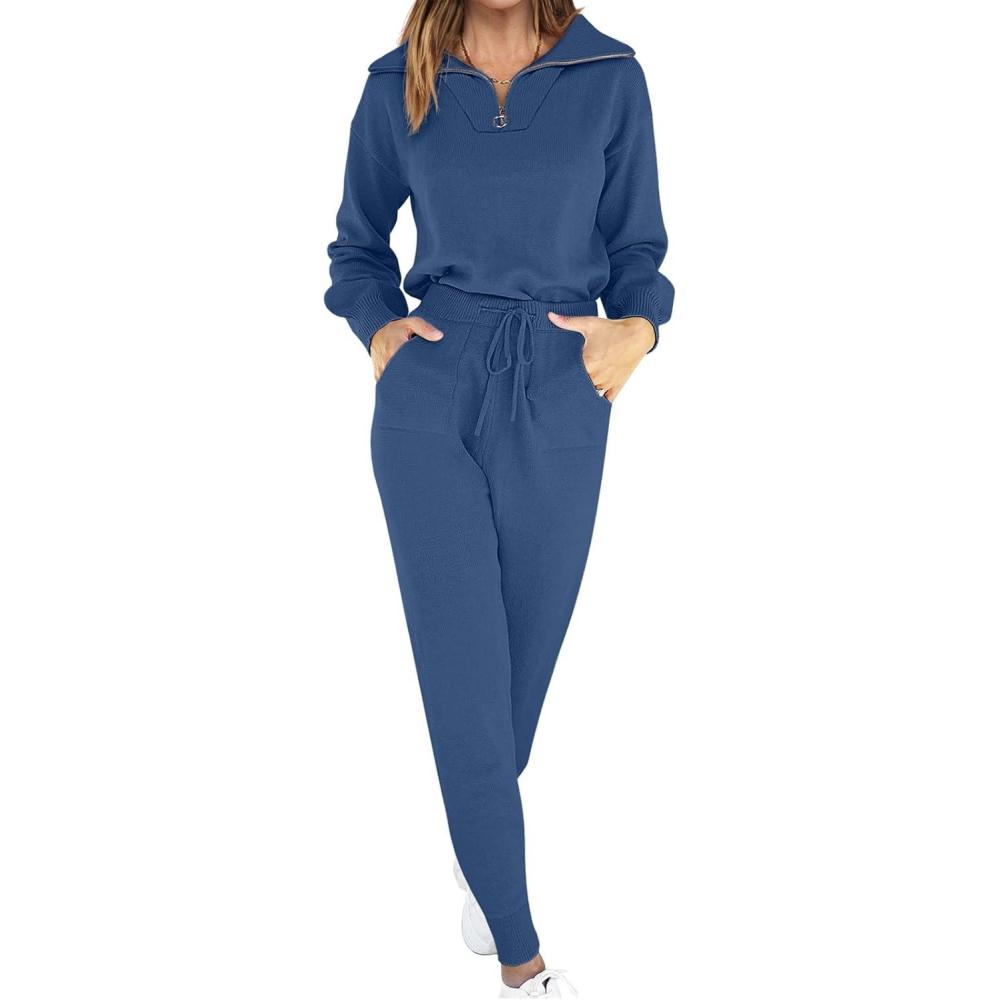 ANRABESS Women’s Two Piece Outfits Sweater Lounge Sets Long Sleeve Zip Up Knit Pullover Jogger Pants Tracksuit Travel Outfits(Dark Blue)