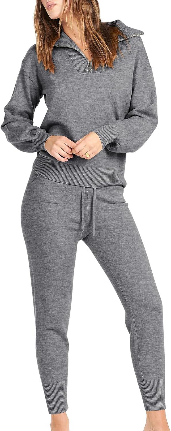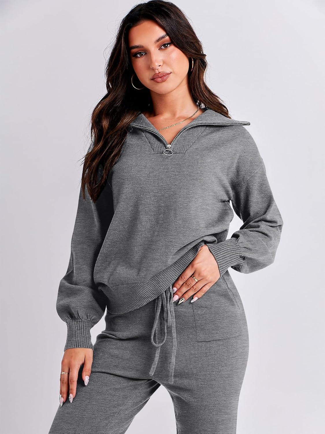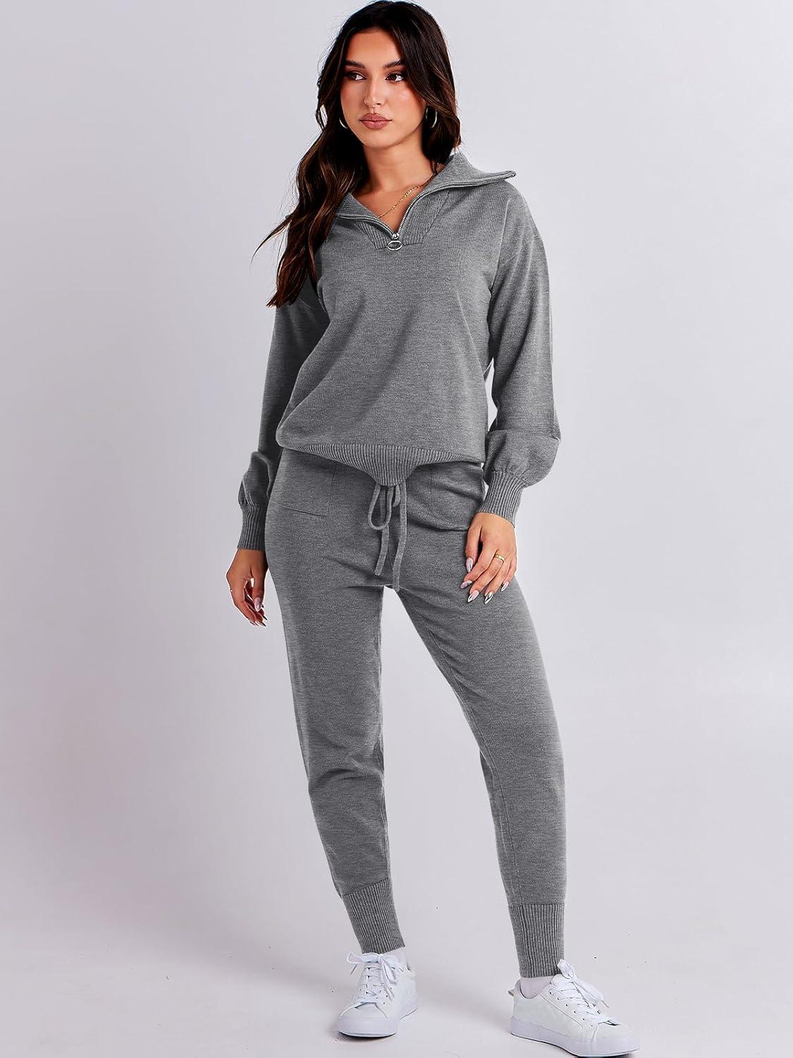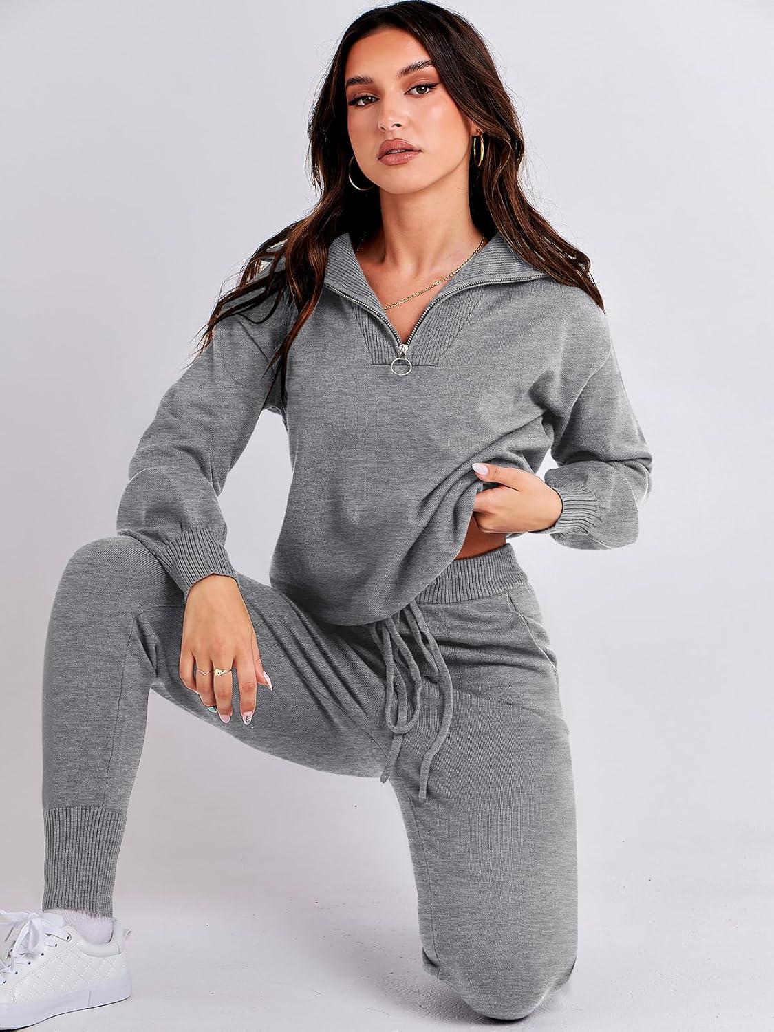 ANRABESS Women’s Two Piece Outfits Sweater Lounge Sets Long Sleeve Zip Up Knit Pullover Jogger Pants Tracksuit Travel Outfits(Grey)