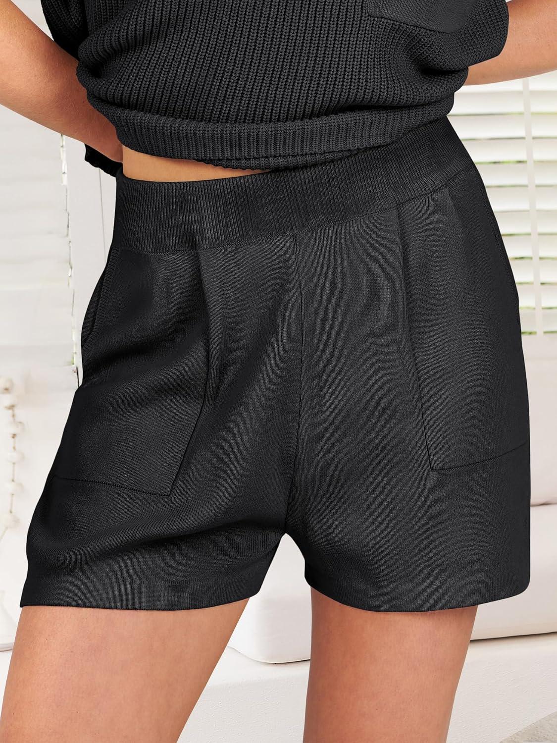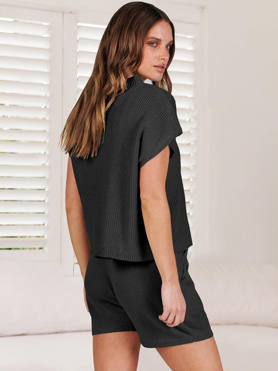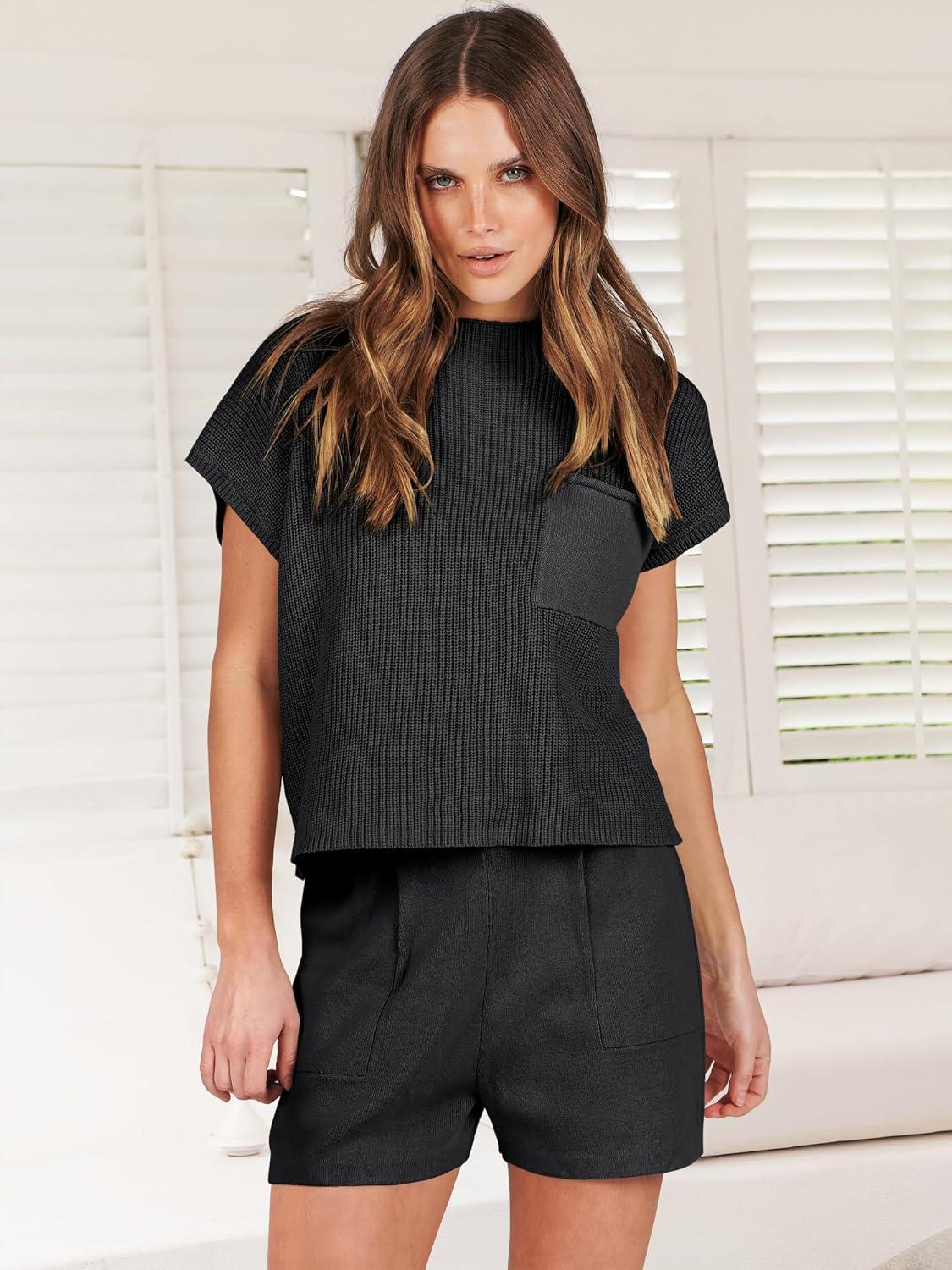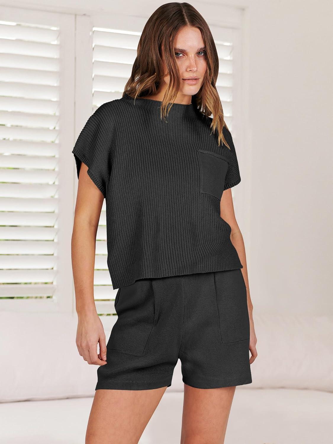 ANRABESS Women’s Two Piece Summer Outfits Knit Sweater Short Sets Pullover Tops & Shorts Lounge Matching Clothes Set(Black)