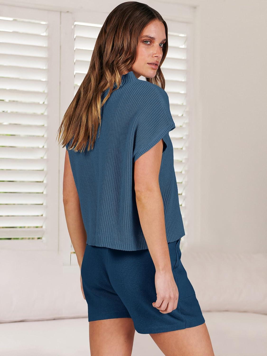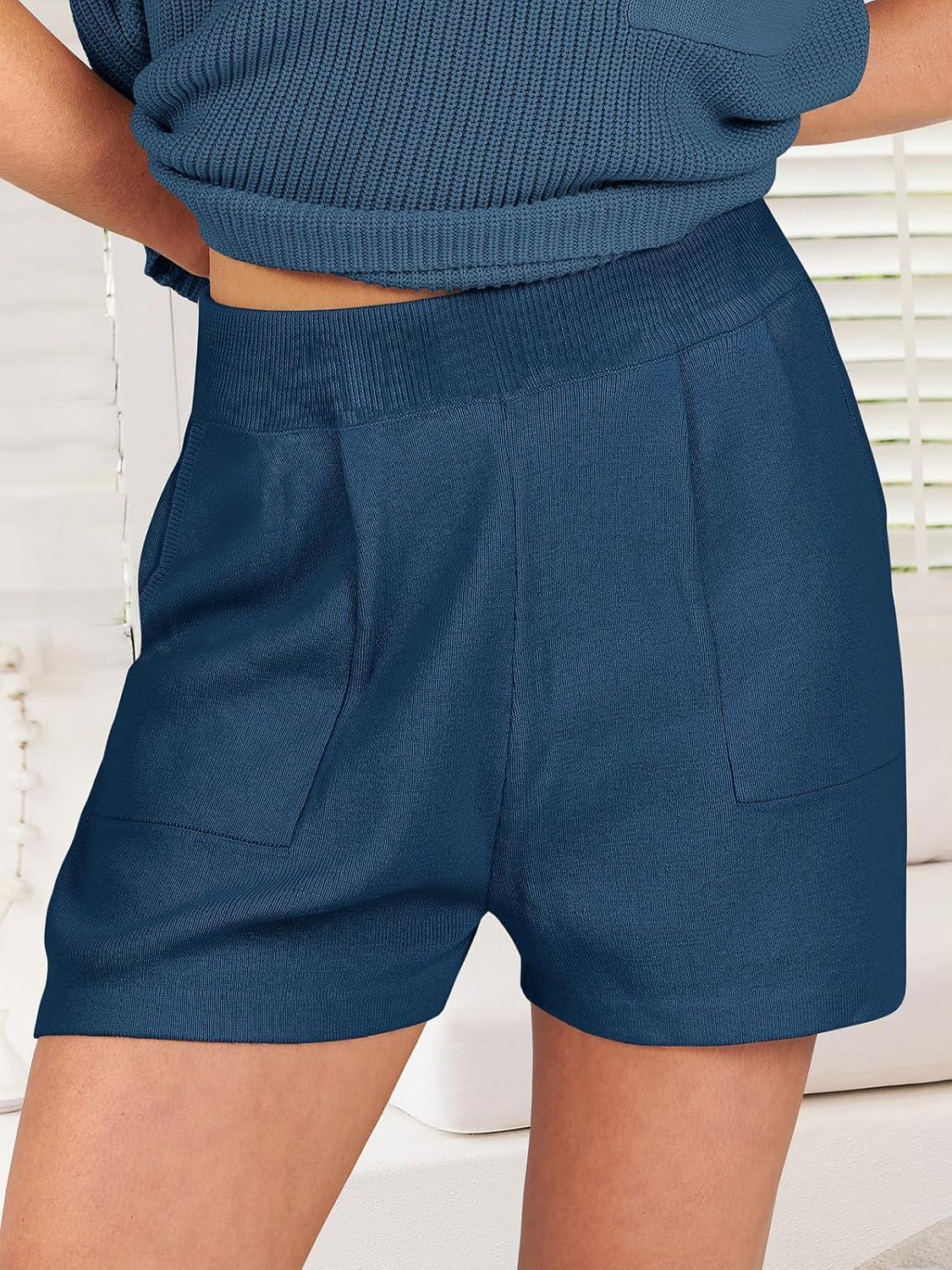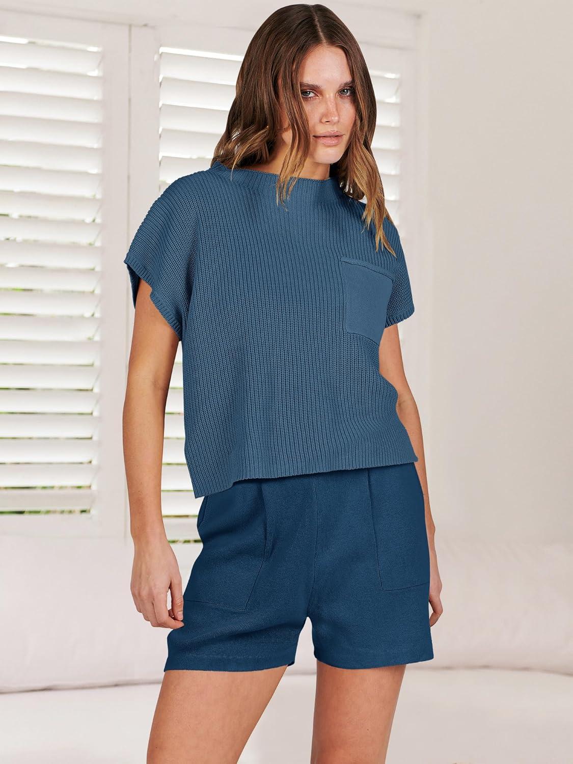 ANRABESS Women’s Two Piece Summer Outfits Knit Sweater Short Sets Pullover Tops & Shorts Lounge Matching Clothes Set(Navy Blue)