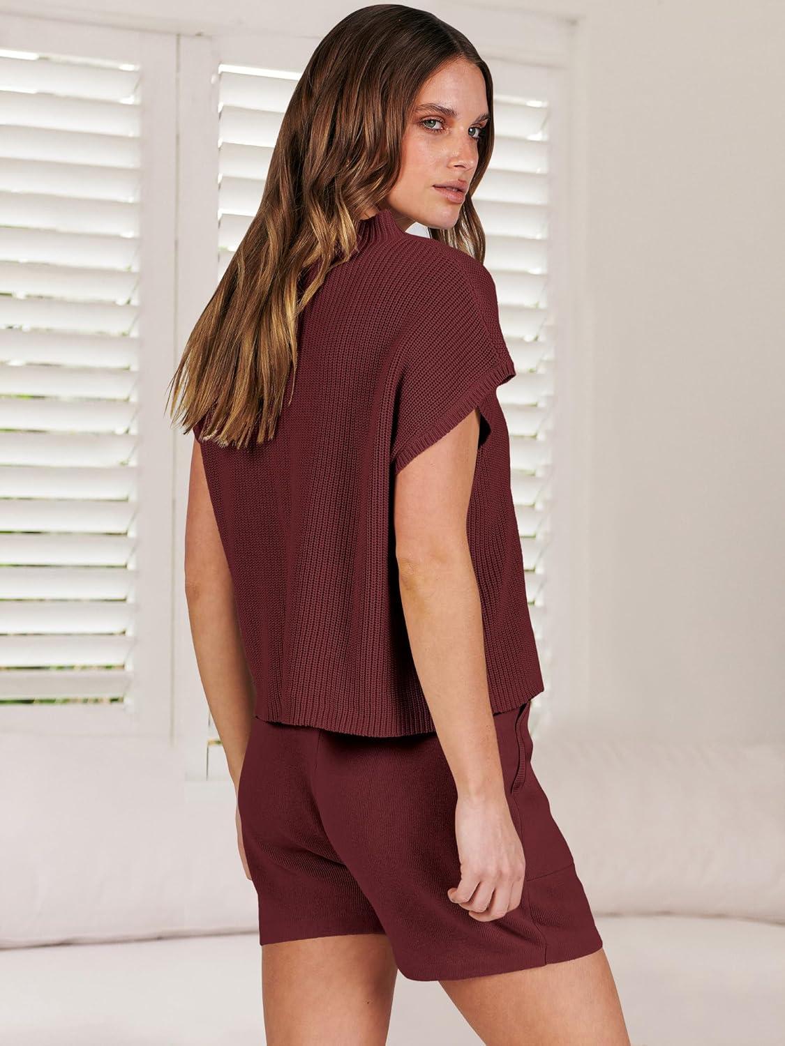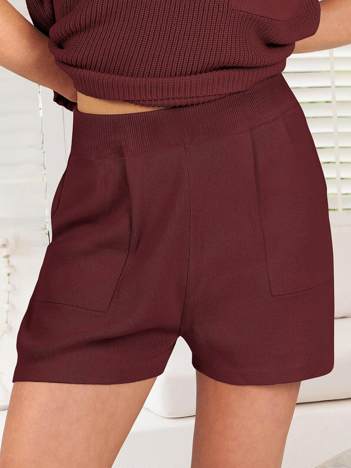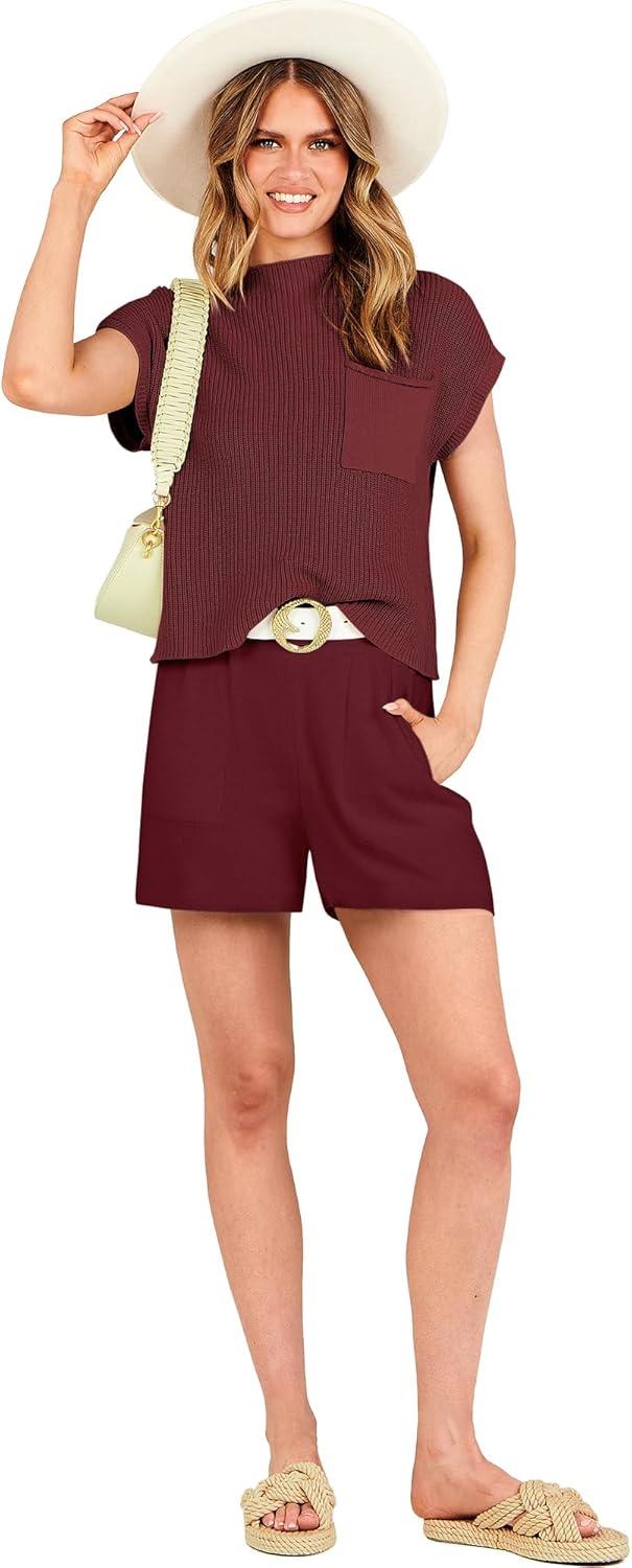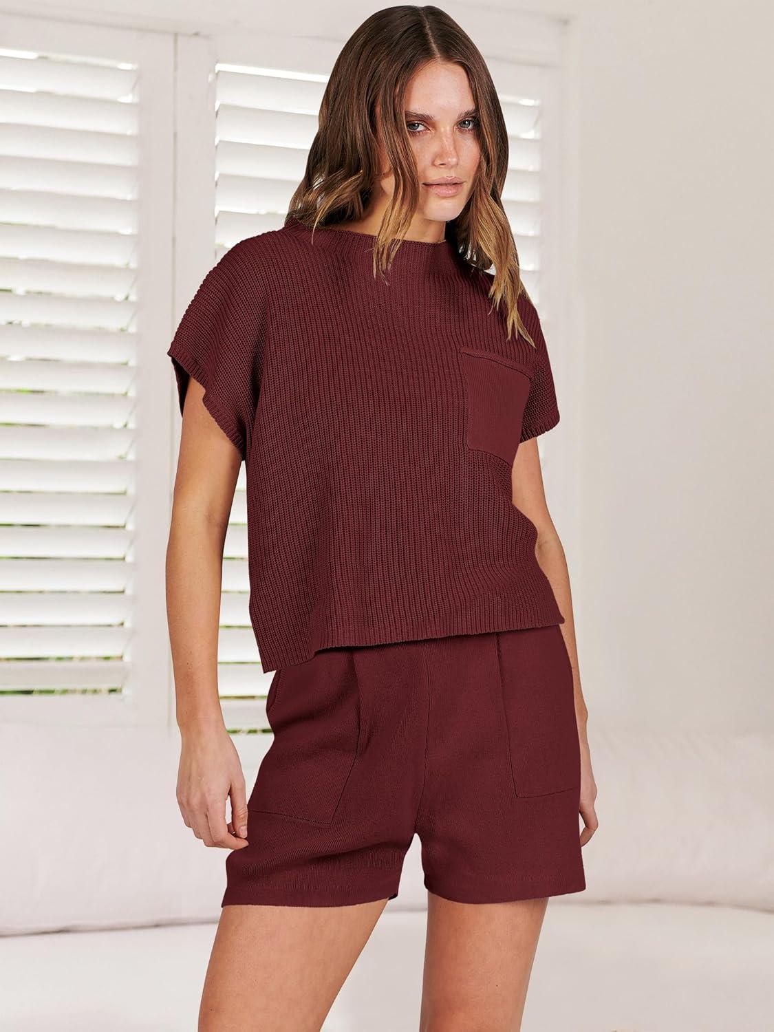 ANRABESS Women’s Two Piece Summer Outfits Knit Sweater Short Sets Pullover Tops & Shorts Lounge Matching Clothes Set(Red)