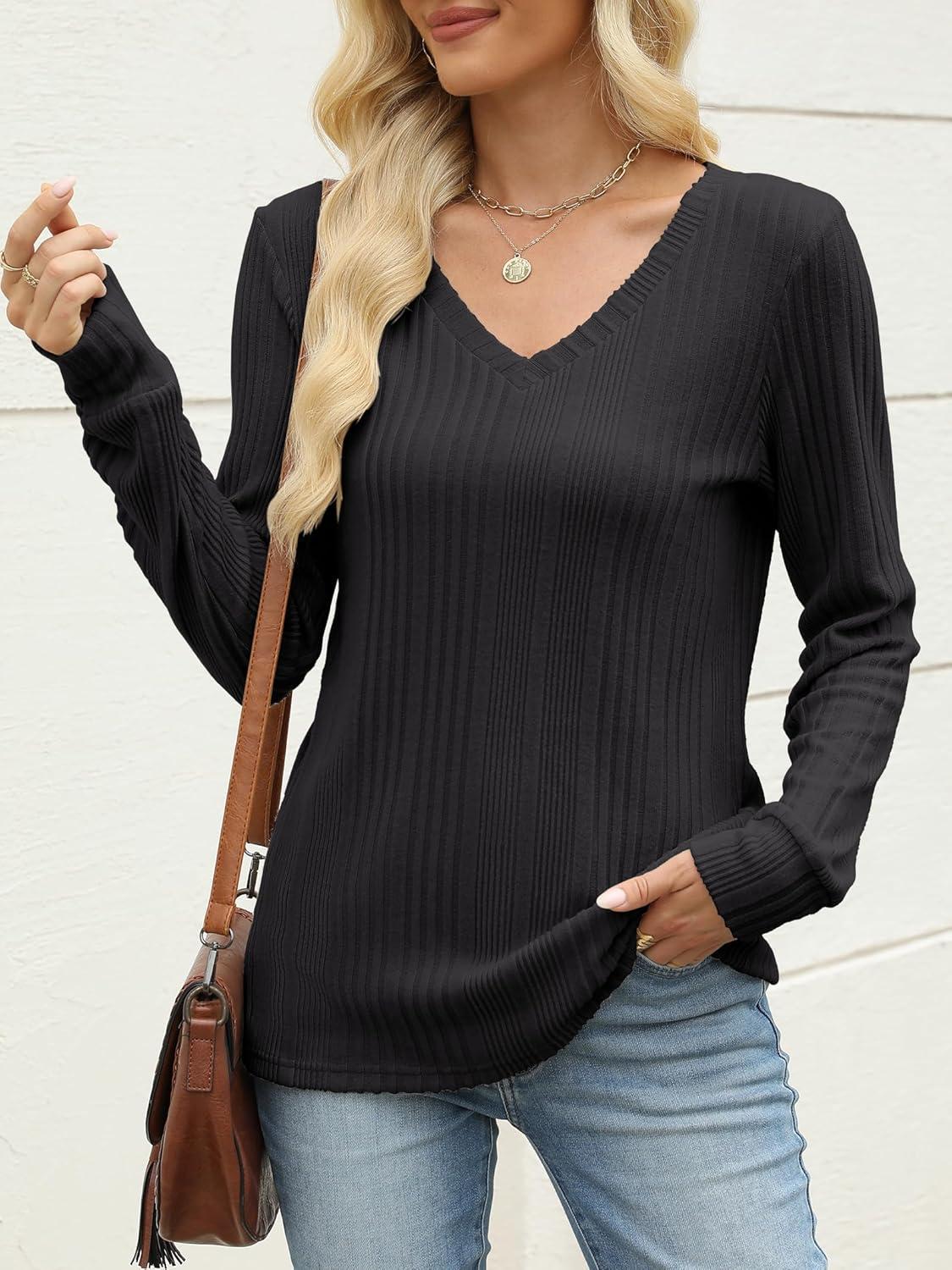 ANRABESS Womens V Neck Sweaters 2025 Fall Long Sleeve Shirts Lightweight Ribbed Knit Basic Casual Office Work Tunic Tops(Black)