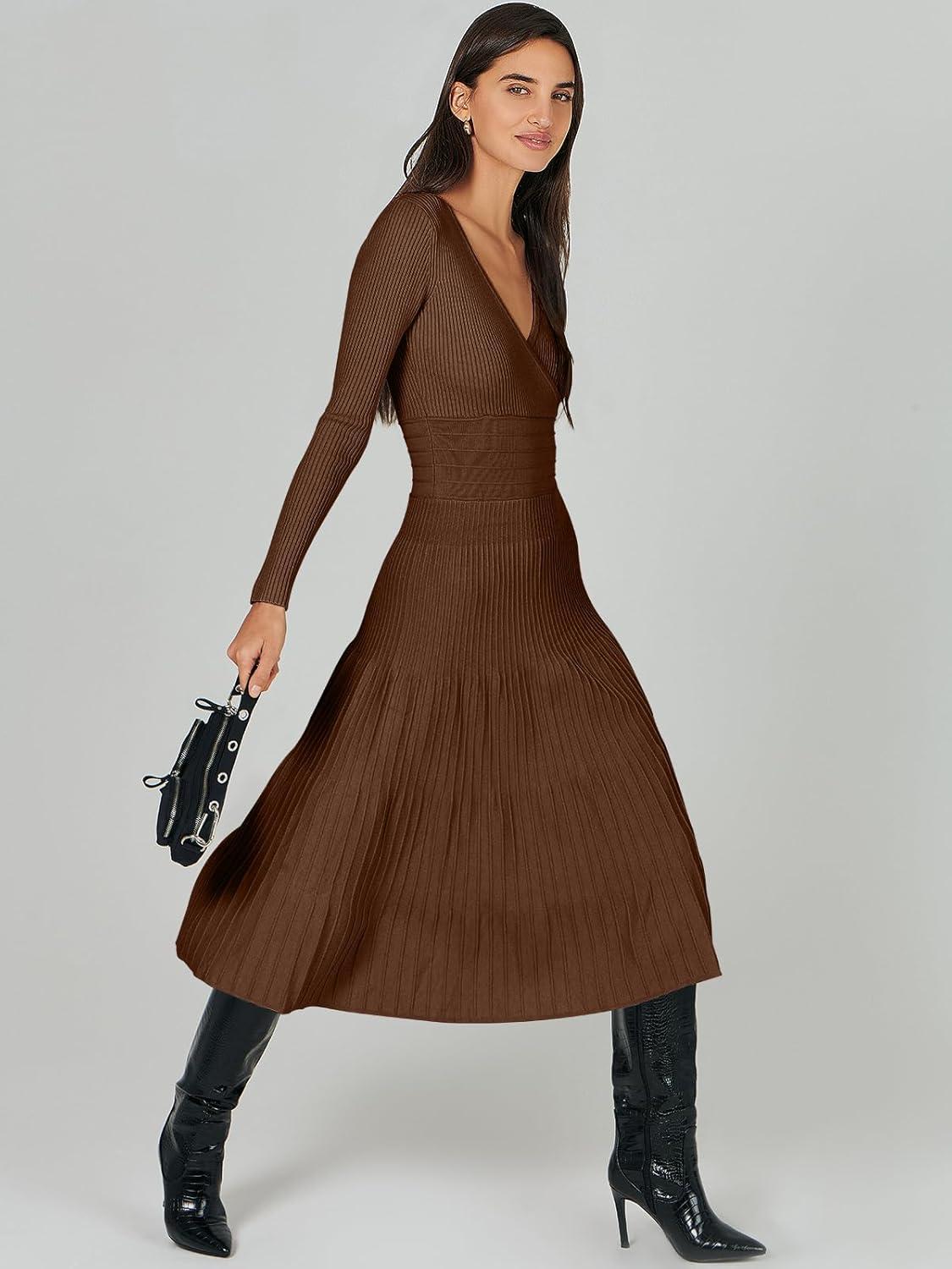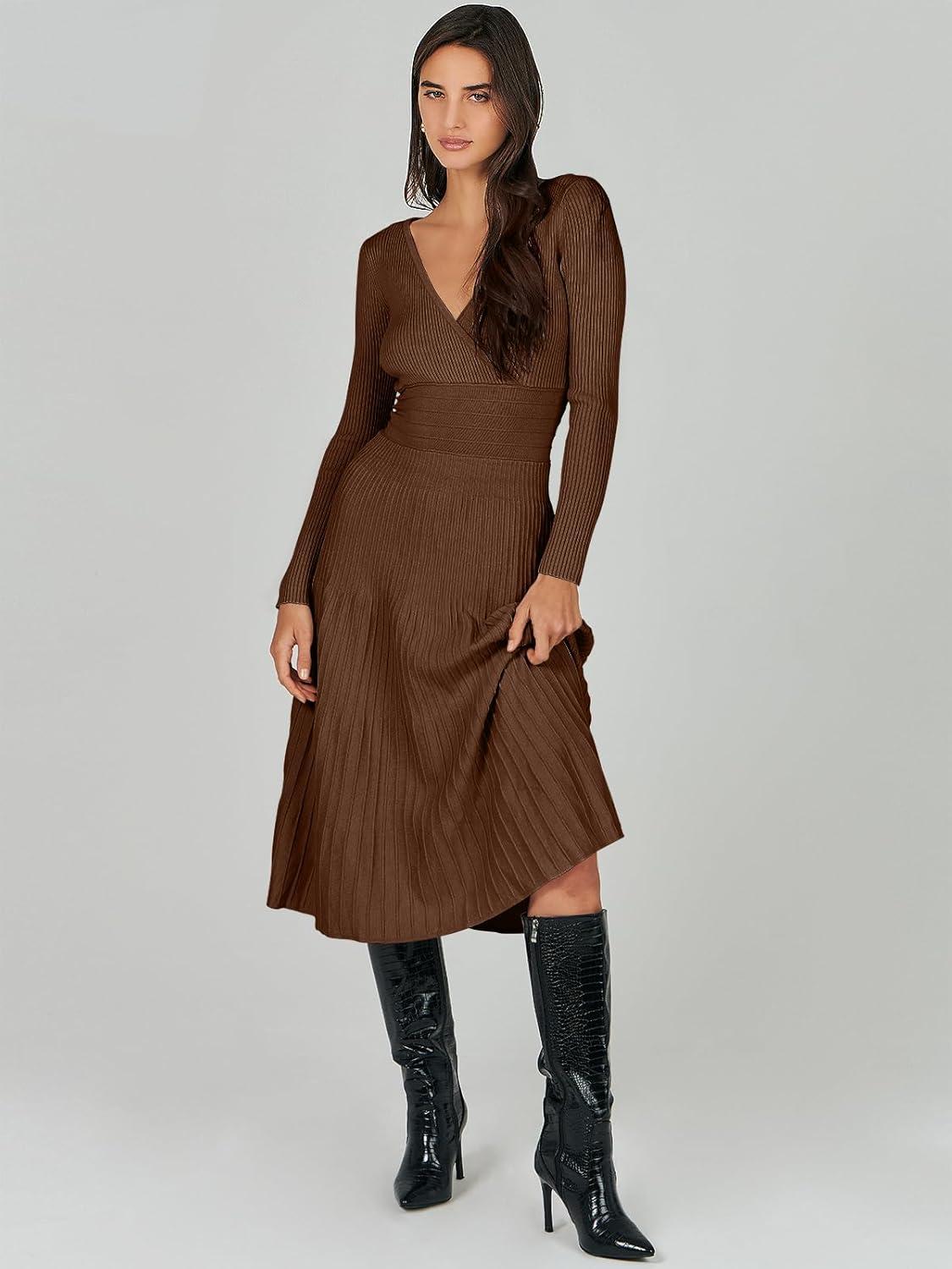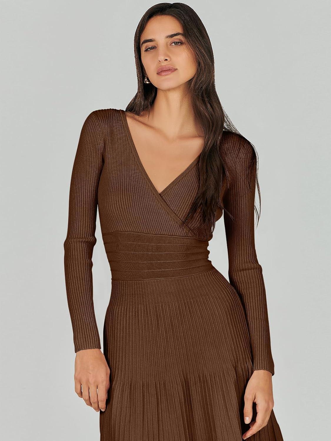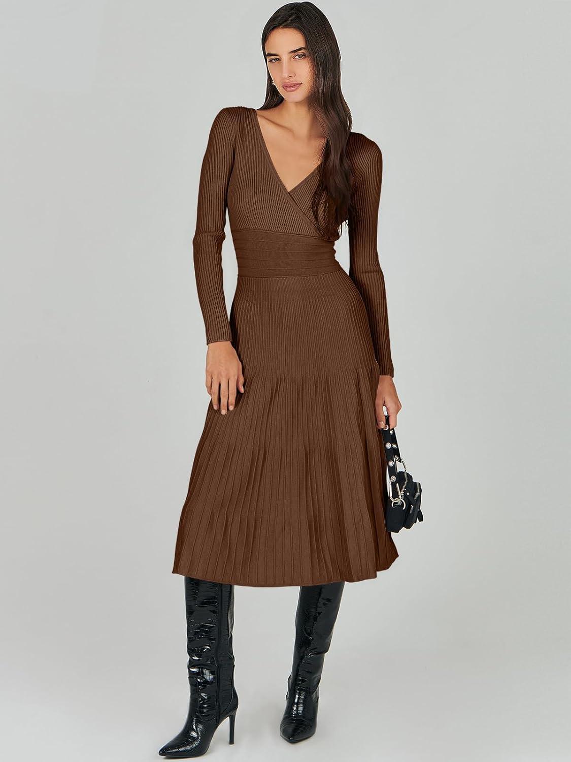ANRABESS Womens Wrap Midi Sweater Dresses Long Sleeve V Neck Ribbed Knit Bodycon High Waist Pleated A-Line Dress 2025 Trendy(Brown)