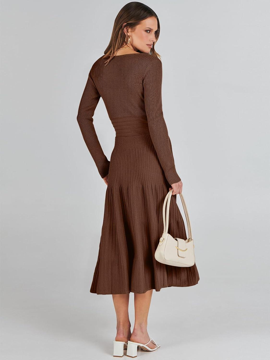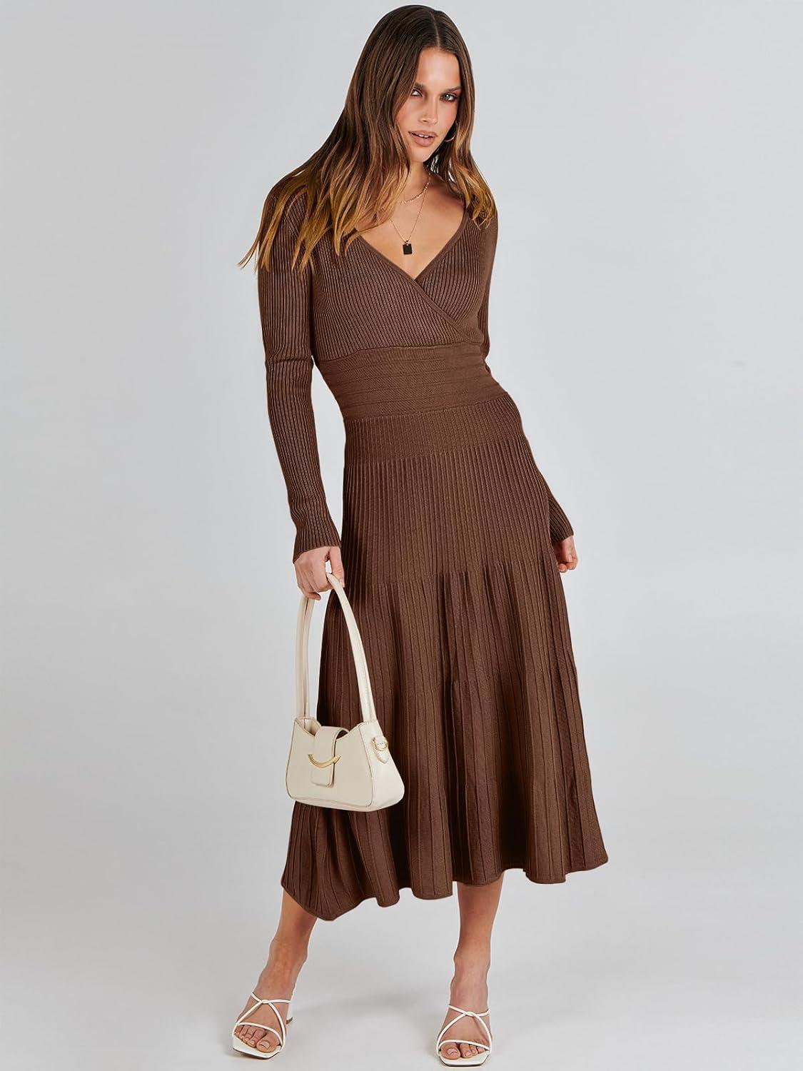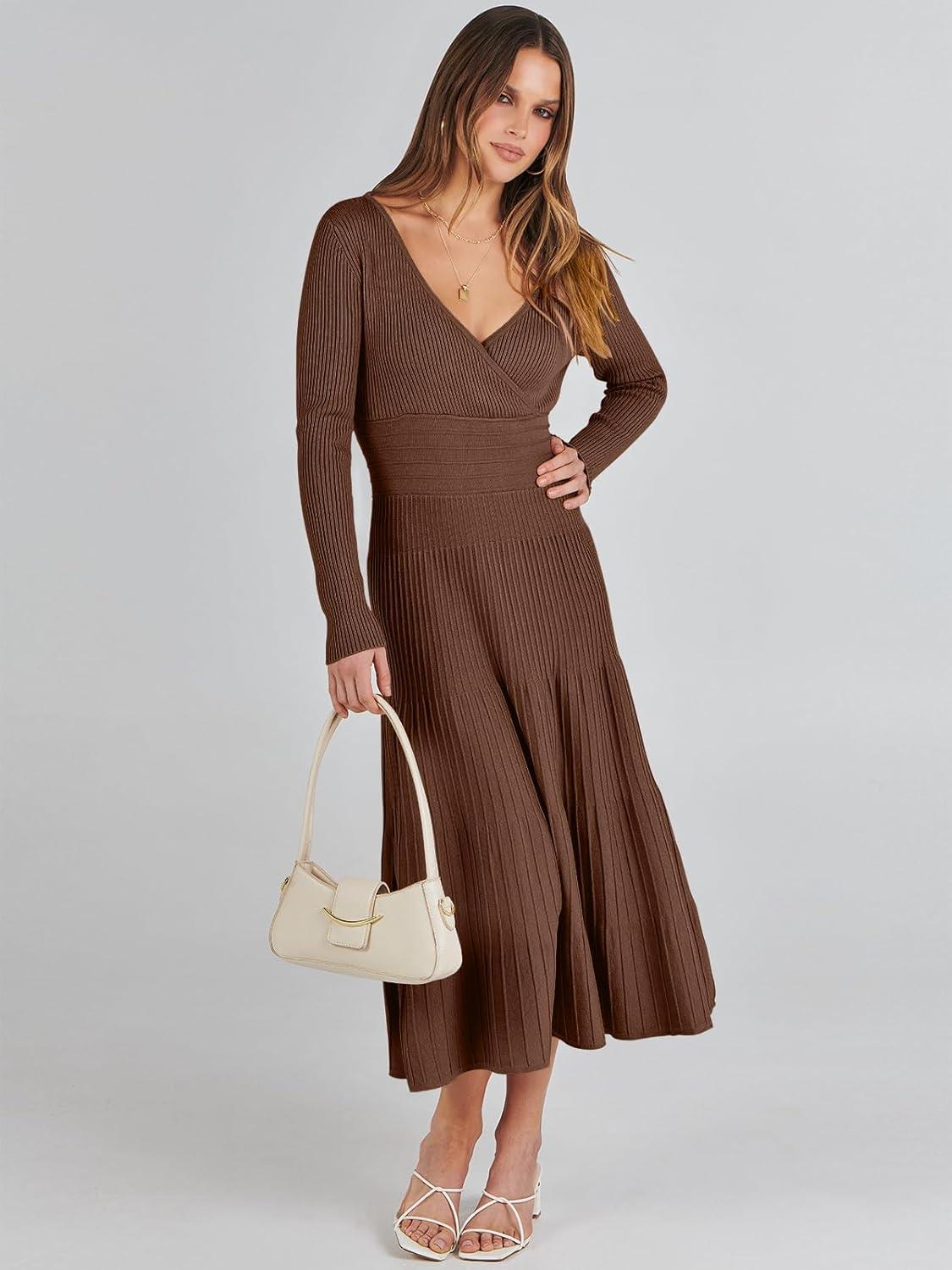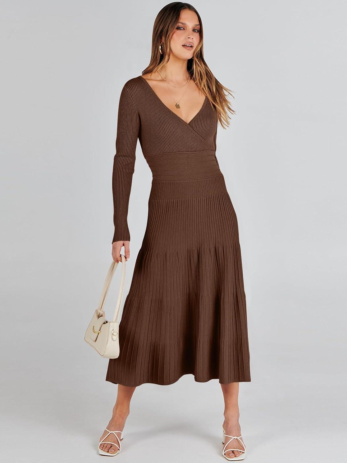 ANRABESS Womens Wrap Midi Sweater Dresses Long Sleeve V Neck Ribbed Knit Bodycon High Waist Pleated A-Line Dress 2025 Trendy(Brown)