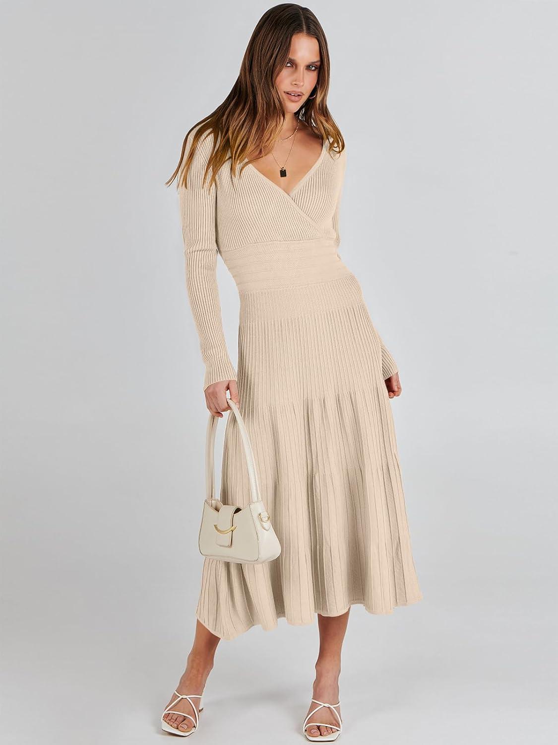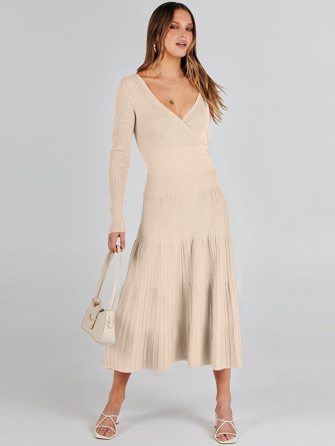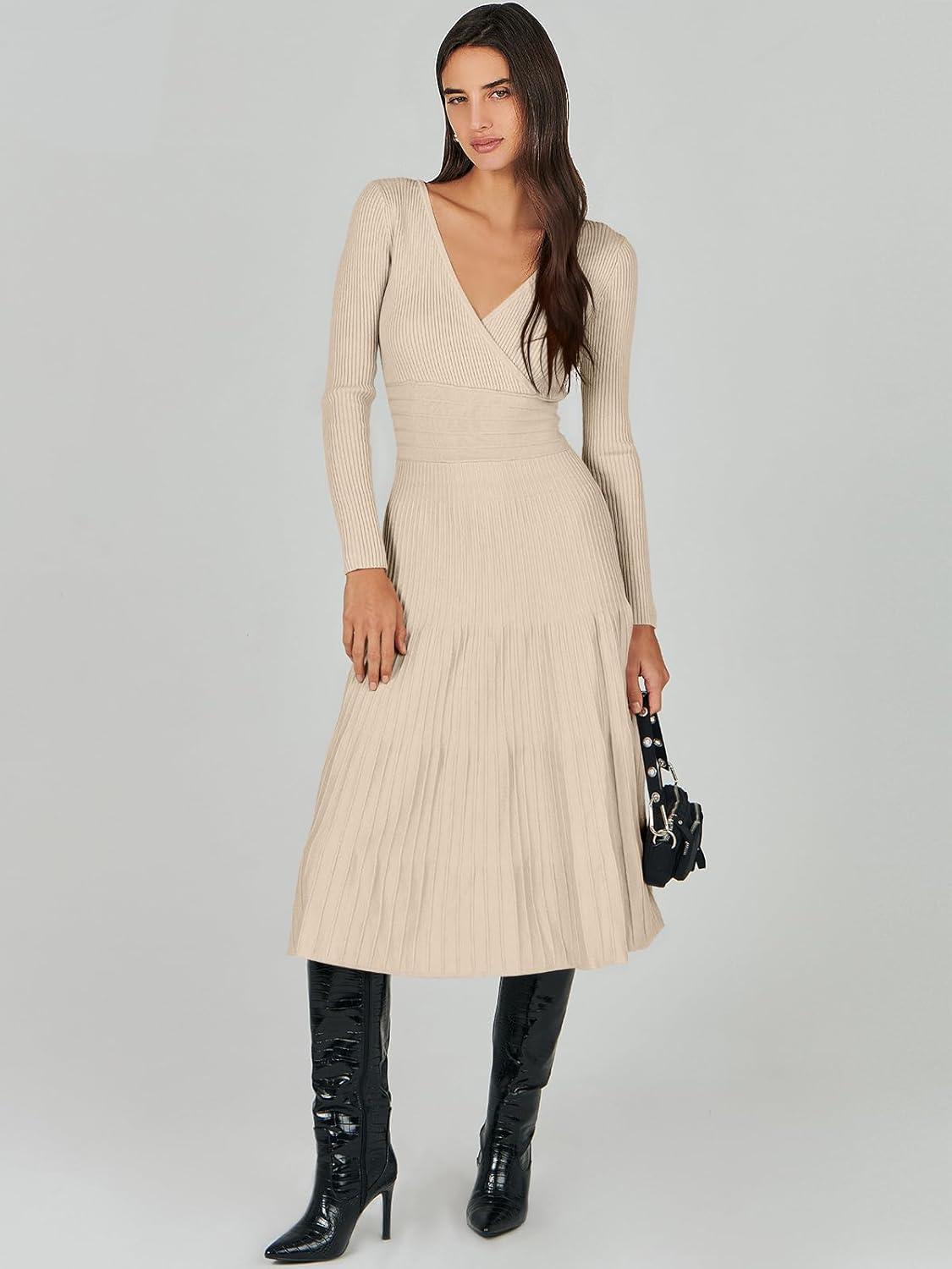 ANRABESS Womens Wrap Midi Sweater Dresses Long Sleeve V Neck Ribbed Knit Bodycon High Waist Pleated A-Line Dress 2025 Trendy(Khaki)
