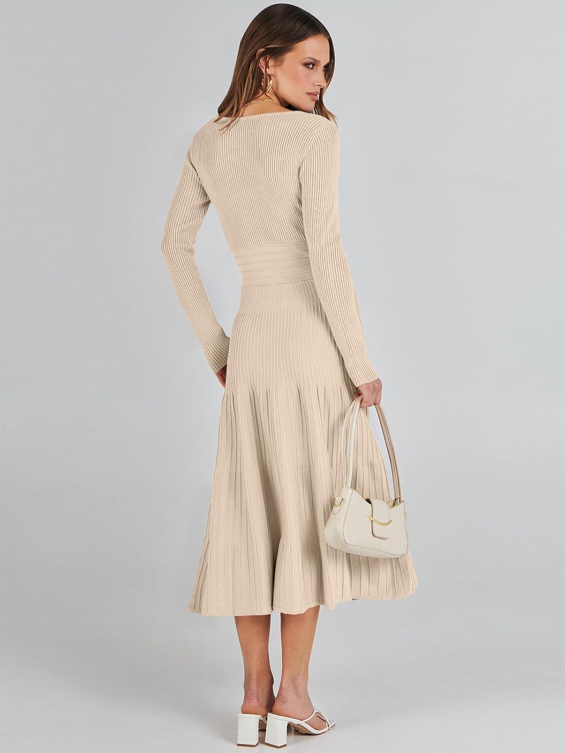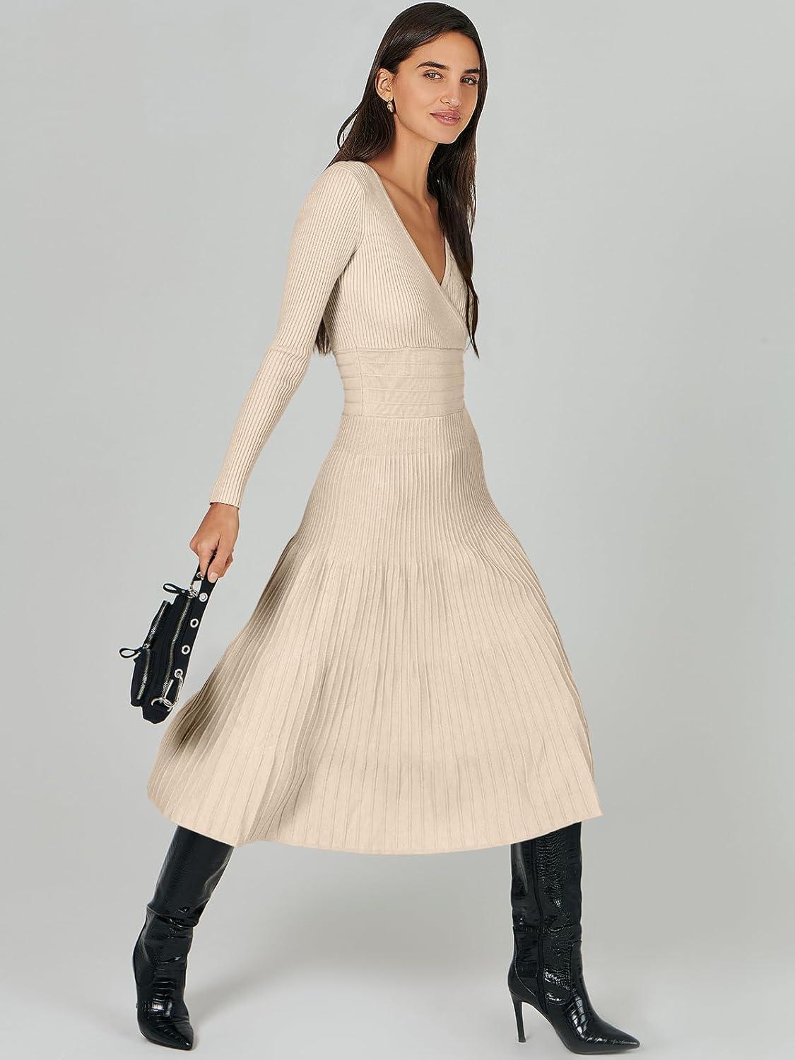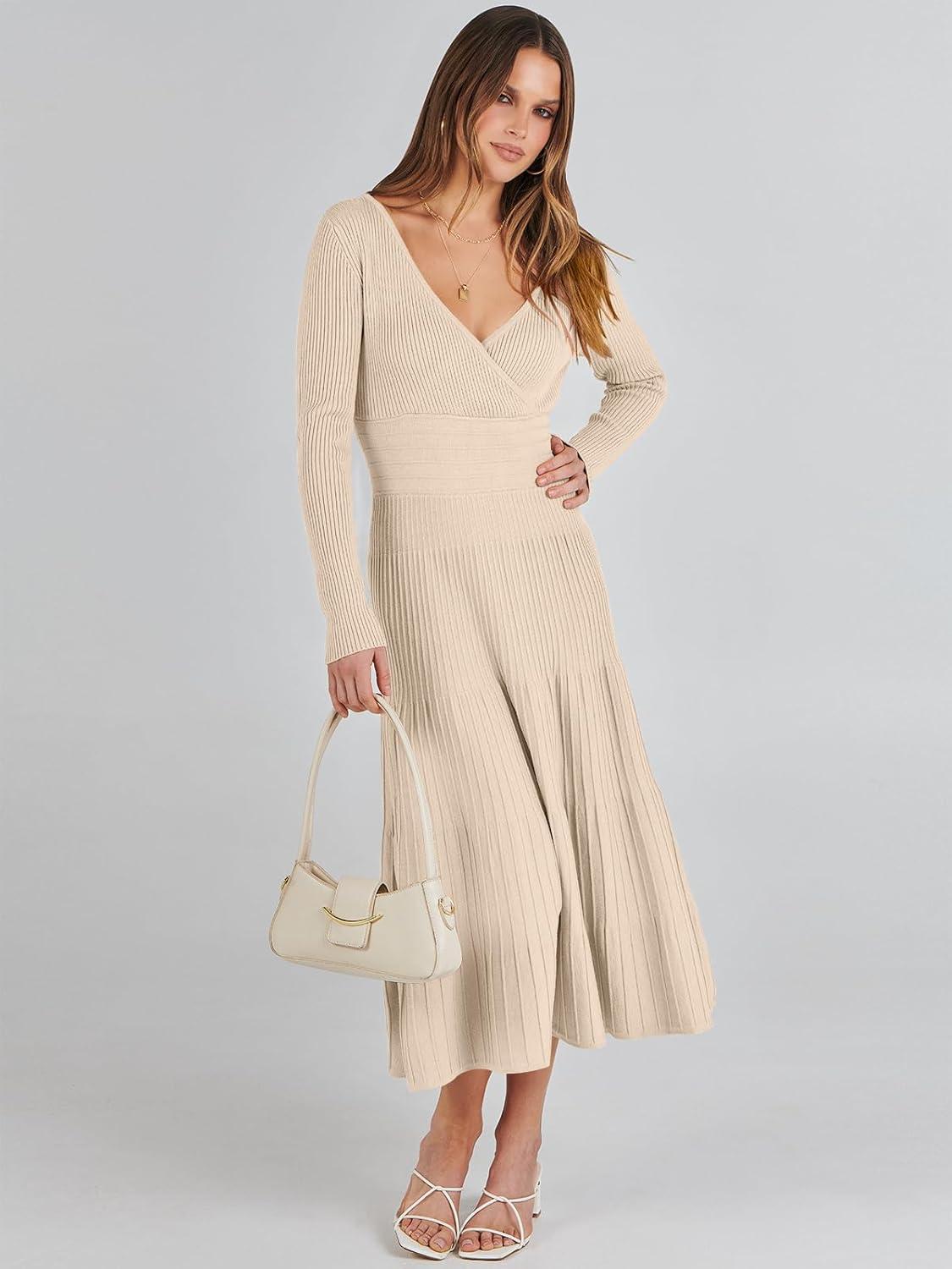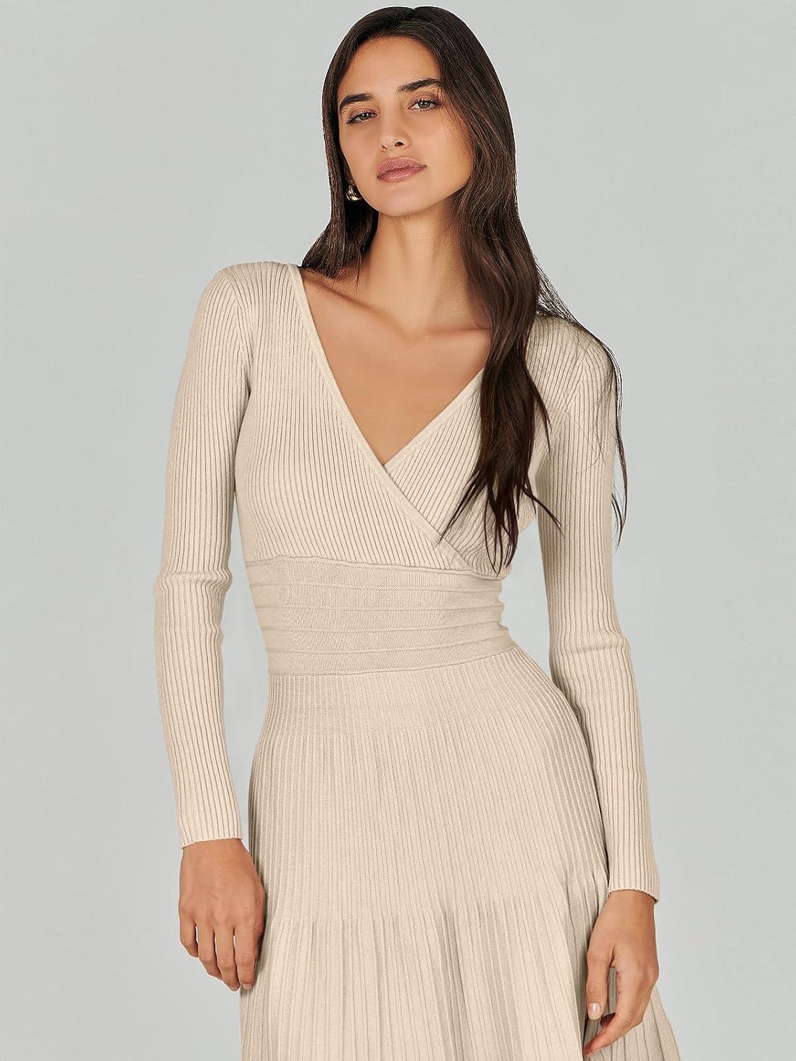 ANRABESS Womens Wrap Midi Sweater Dresses Long Sleeve V Neck Ribbed Knit Bodycon High Waist Pleated A-Line Dress 2025 Trendy(Khaki)