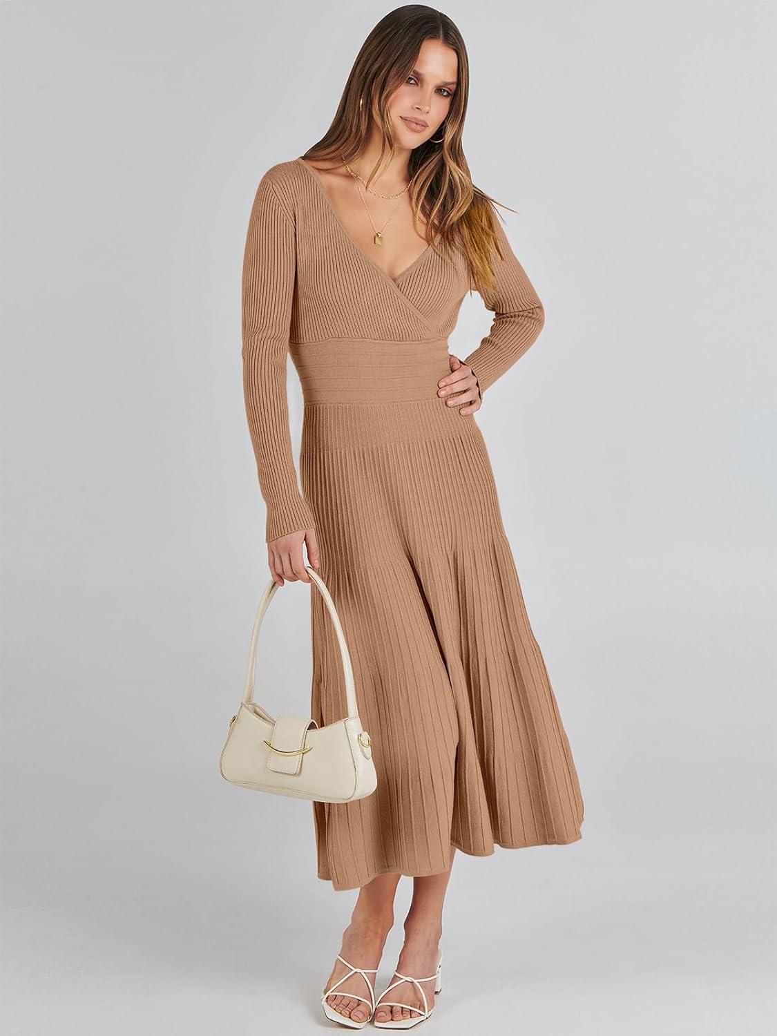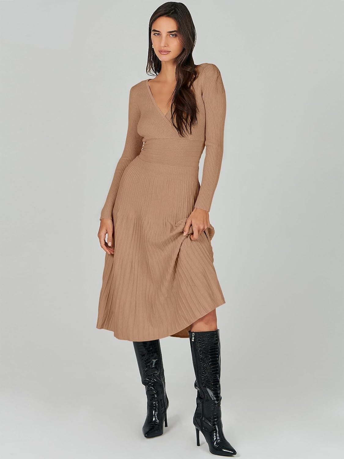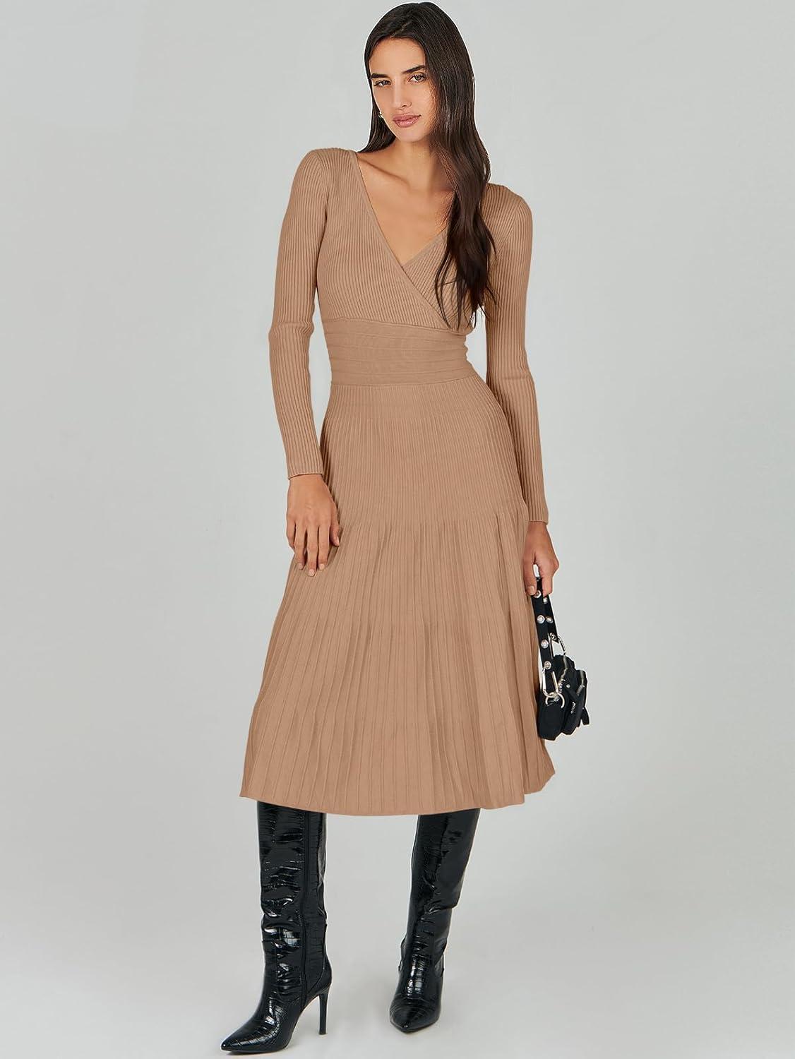 ANRABESS Womens Wrap Midi Sweater Dresses Long Sleeve V Neck Ribbed Knit Bodycon High Waist Pleated A-Line Dress 2025 Trendy(Light Camel)