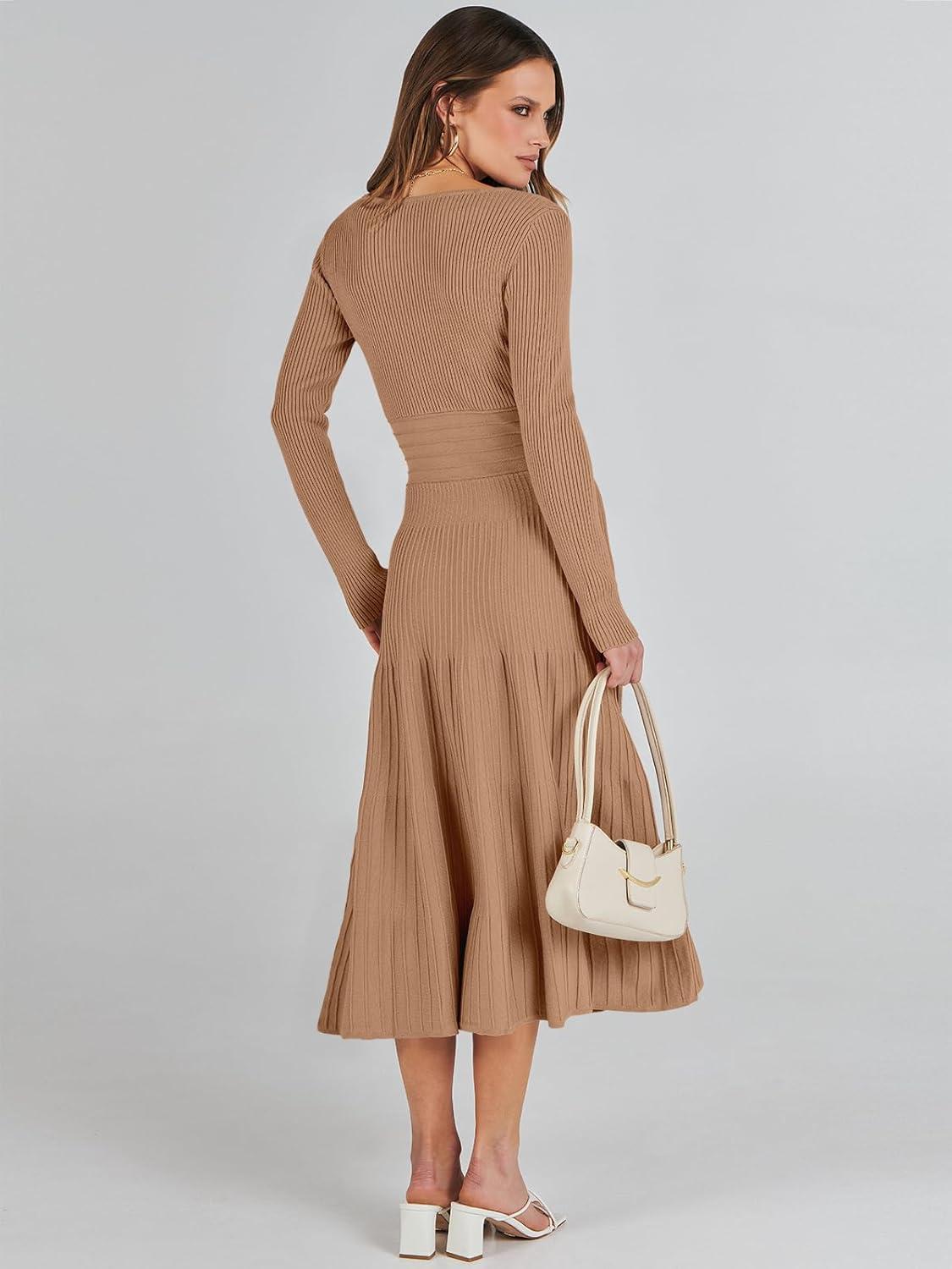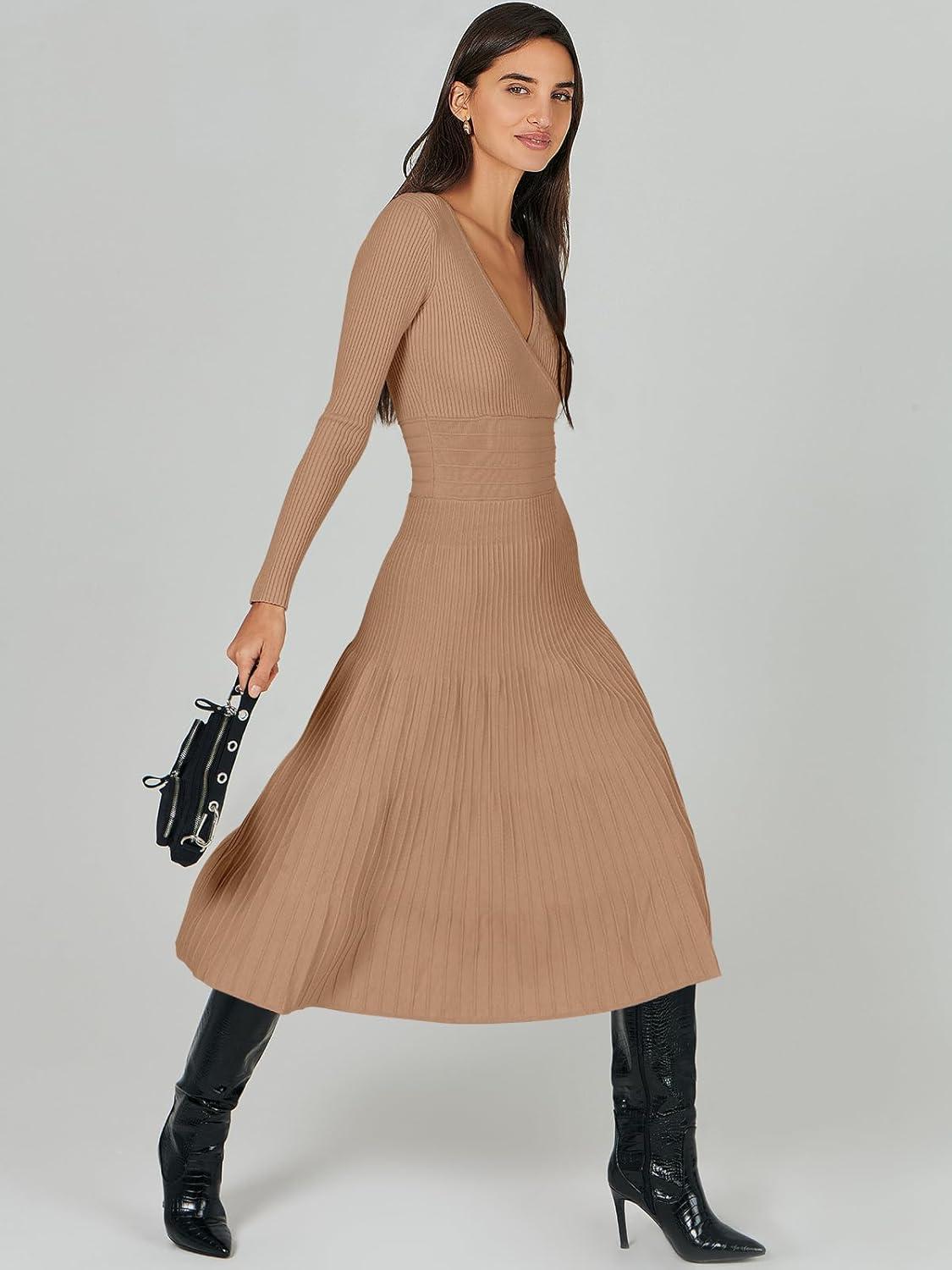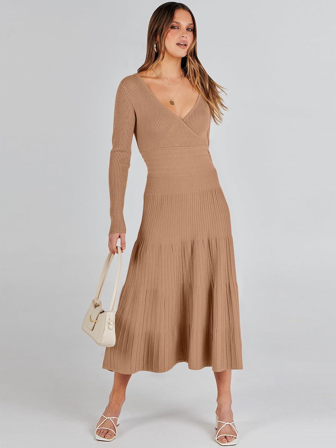 ANRABESS Womens Wrap Midi Sweater Dresses Long Sleeve V Neck Ribbed Knit Bodycon High Waist Pleated A-Line Dress 2025 Trendy(Light Camel)