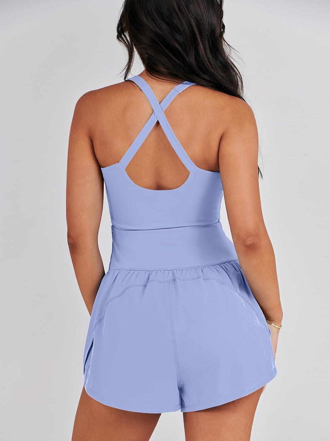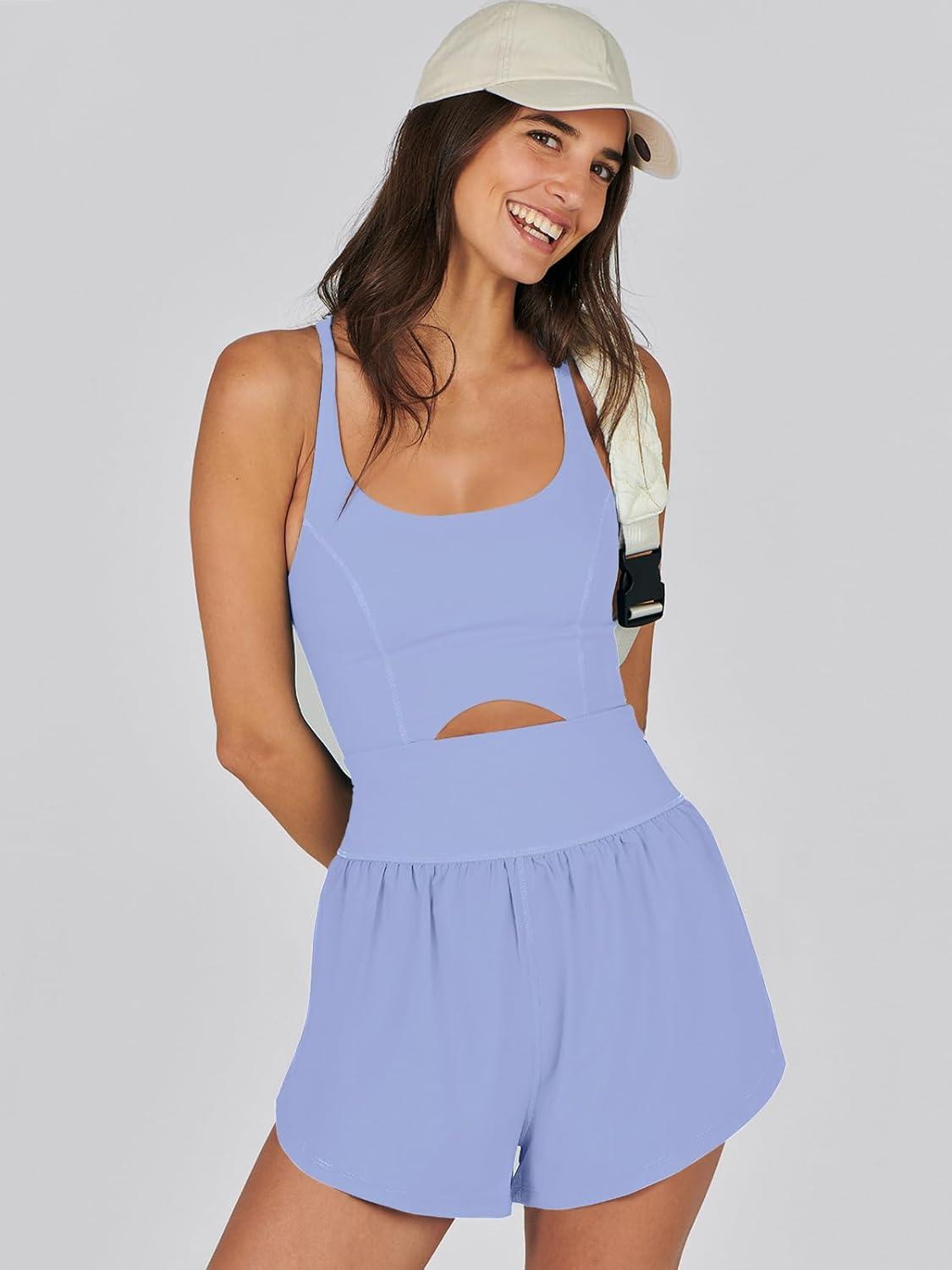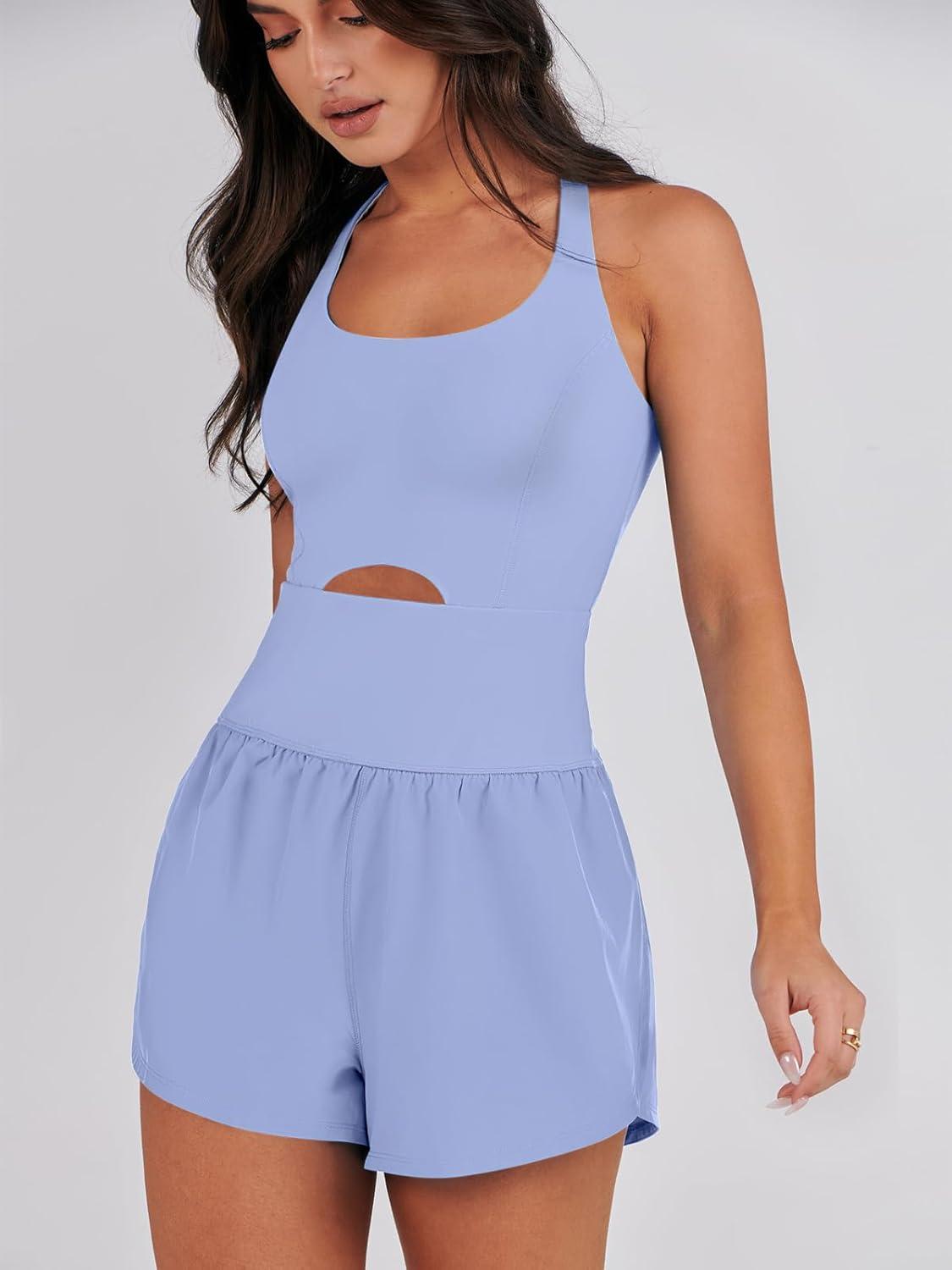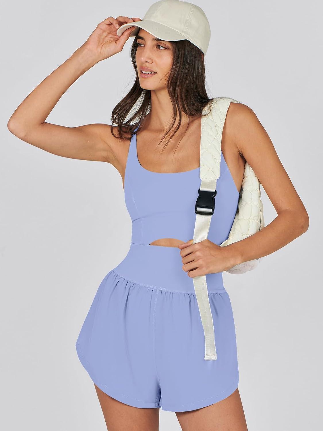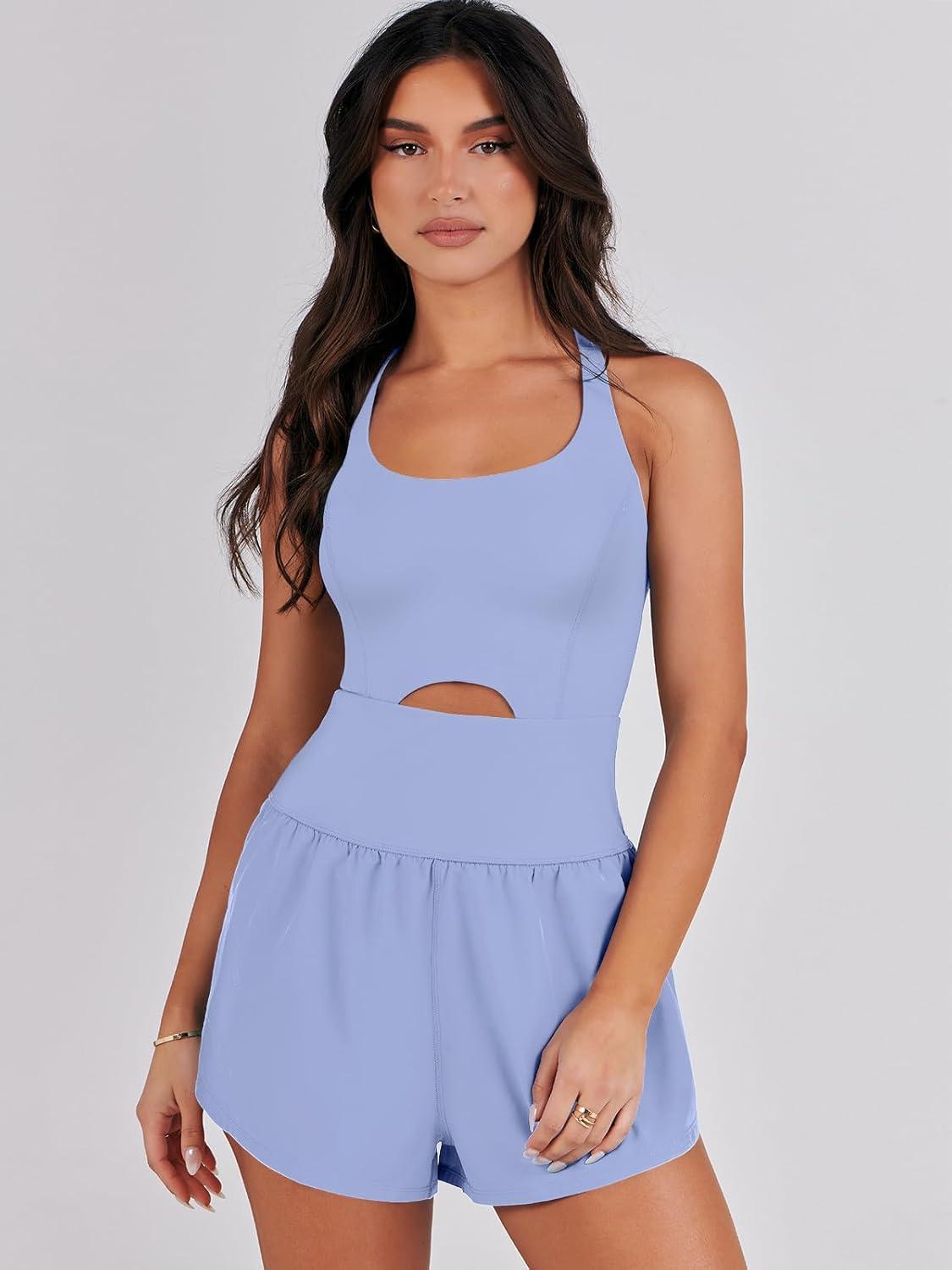 Caracilia Women’s Workout Athletic Romper Summer Sets Short Jumpsuits Onesie Running Outfits Exercise Gym 2025 Trendy Clothes(Sky)